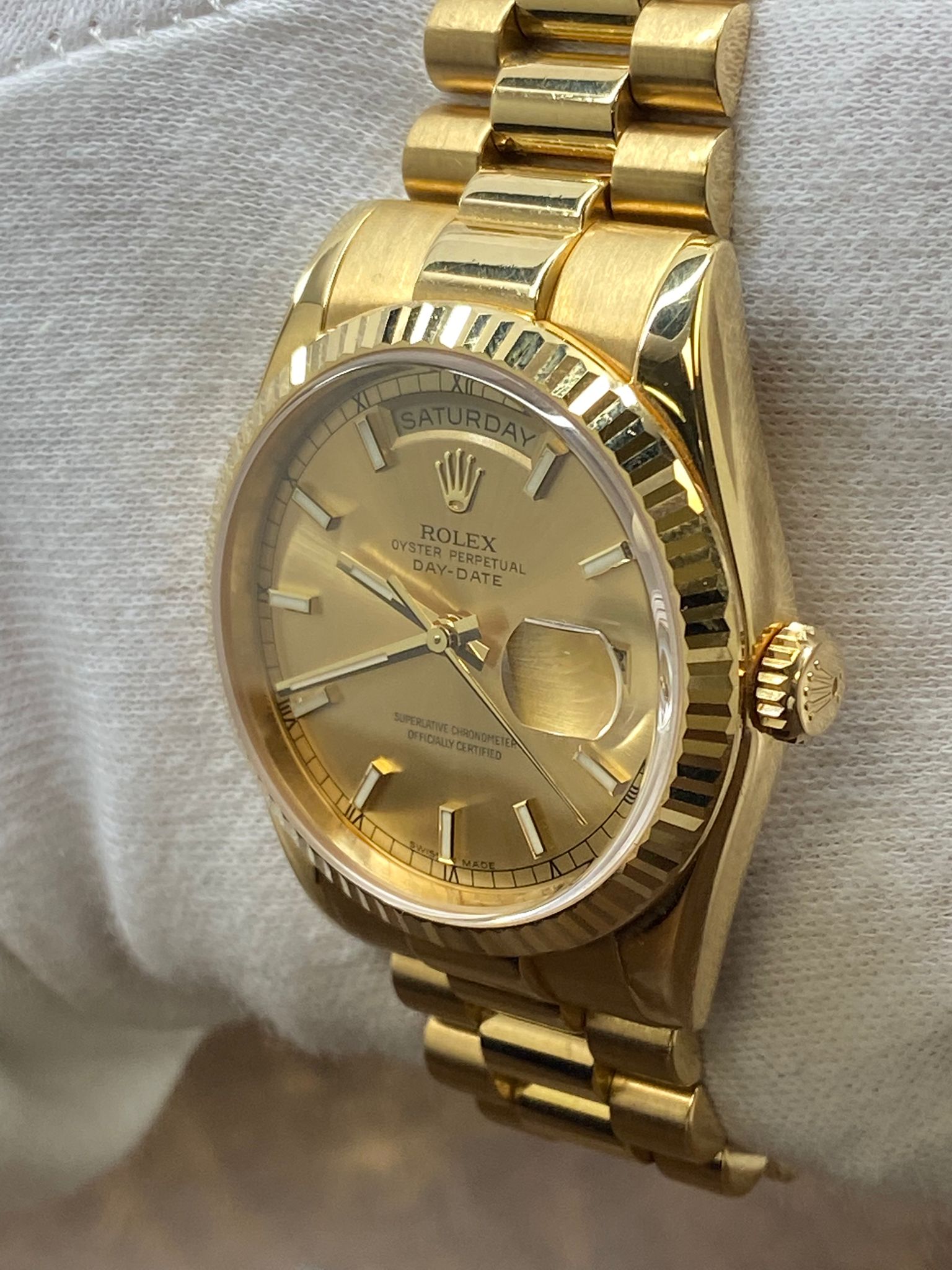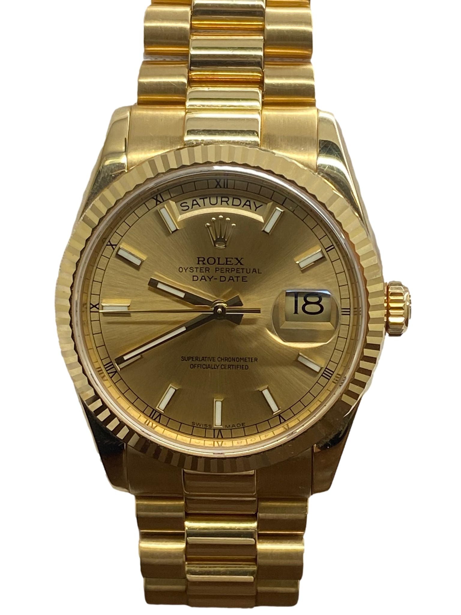 18kt yellow gold case with a 18k yellow gold president bracelet. Fixed fluted 18k yellow gold bezel. Champagne dial with luminous gold-tone hands and index hour markers. Dial type: analog. Luminescent hands. Rolex calibre 3155 automatic movement with about 48 hours of power reserve. Scratch resistant sapphire crystal. Screw down crown. Solid case back. Case size: 36 mm. Case thickness: 12 mm. Round case shape. Band width: mm. 'fat' deployment buckle clasp. Water resistant at 100 meters / 330 feet. Functions: date, day, hour, minute, second, chronometer. Rolex President Day Date 36mm Fat Buckle 118238 Champagne Dial Automatic Men's Watch.