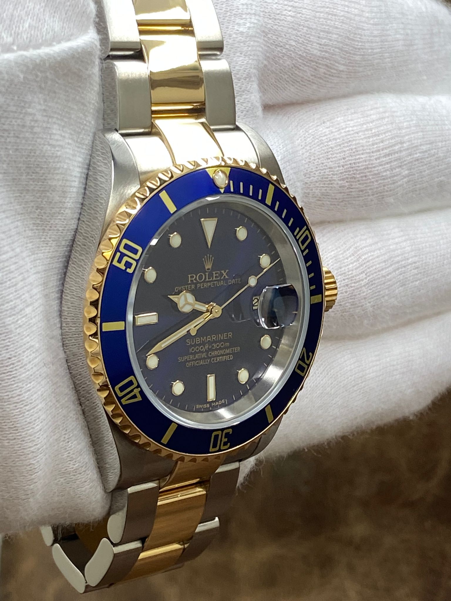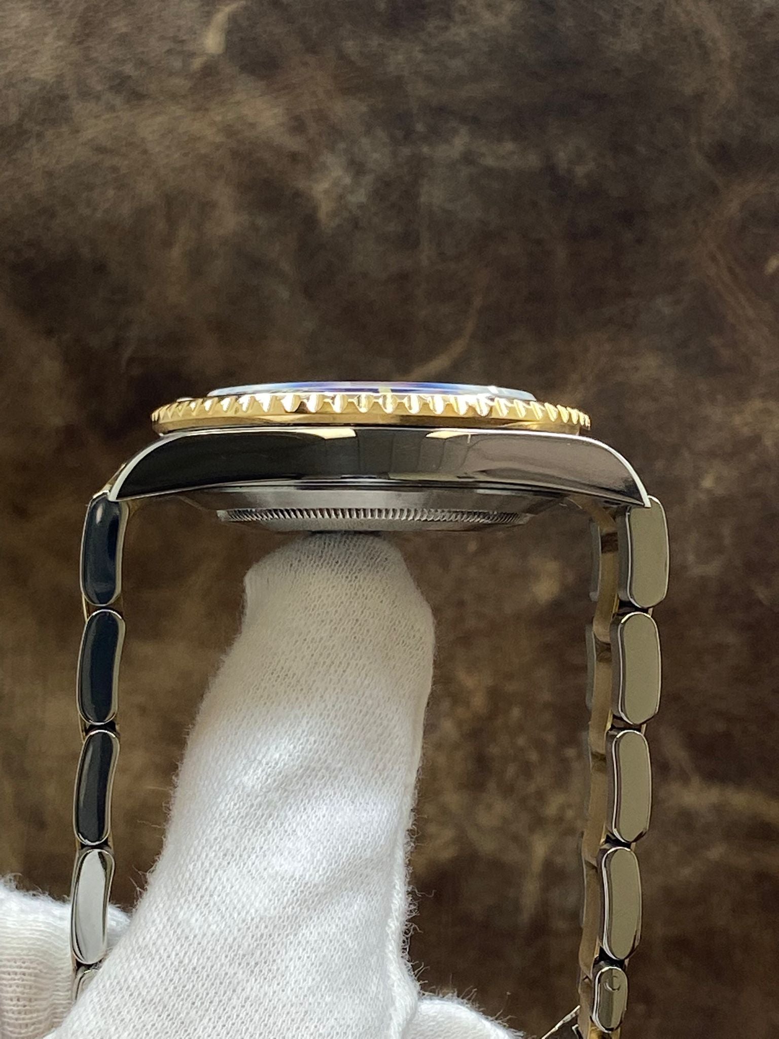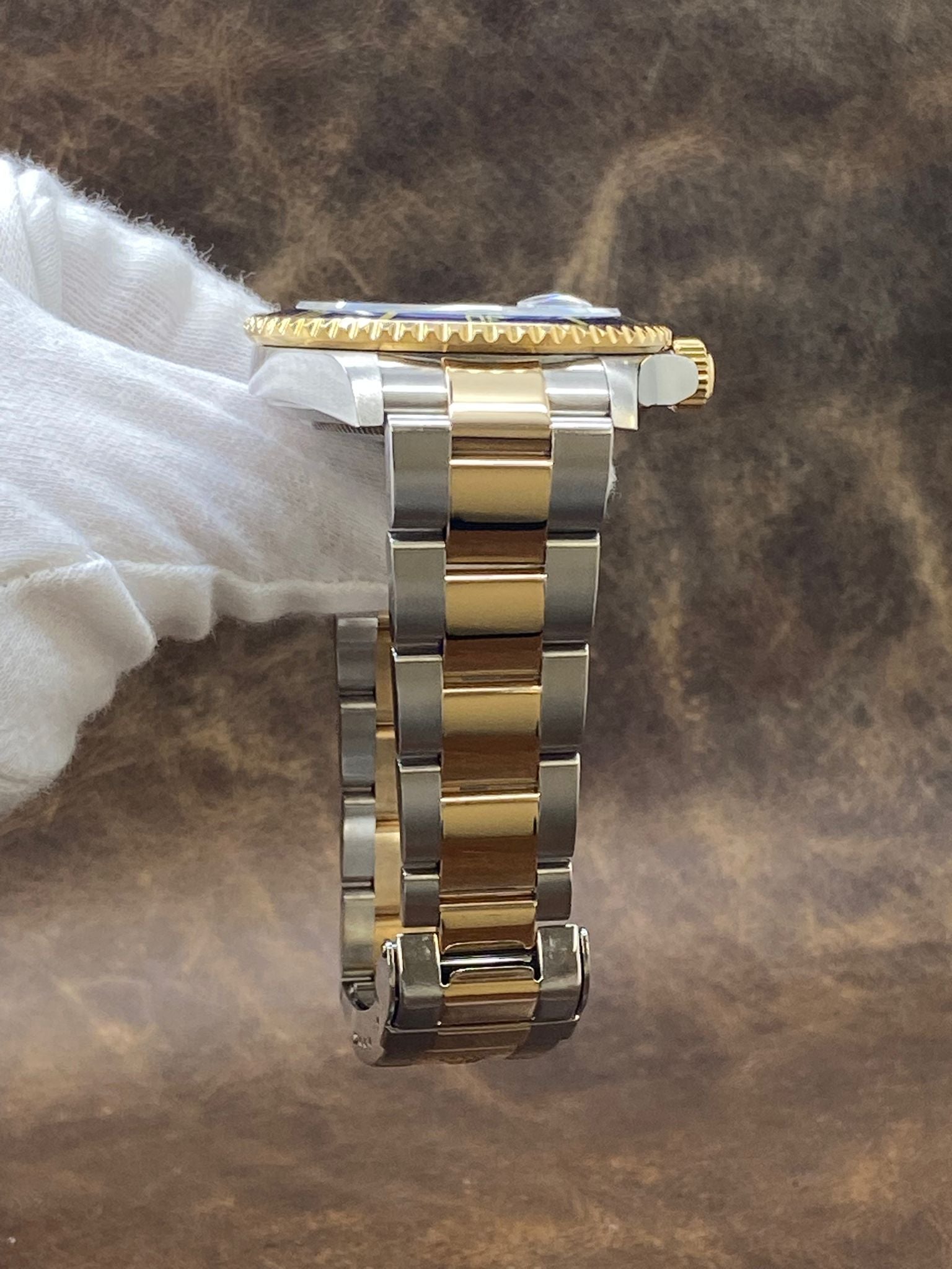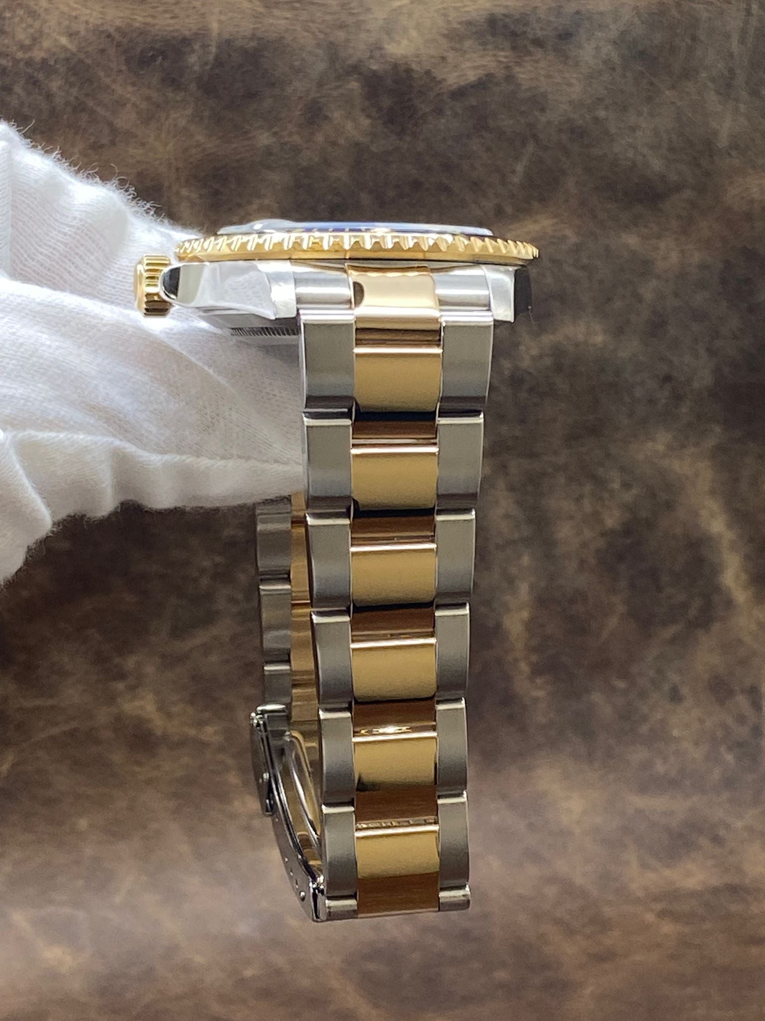 Stainless steel case with a stainless steel & 18k gold bracelet. Uni-directional rotating 18k yellow gold with aluminum top ring bezel. Blue dial with luminous gold-tone mercedes-logo, sword, and breguet-style hands and luminous dot & index hour markers. Dial type: analog. Rolex calibre 3135 automatic movement with about 48 hours of power reserve. Scratch resistant sapphire crystal. Screw down crown. Solid case back. Case size: 40 mm. Case thickness: 12.5 mm. Round case shape. Band width: mm. Fold over with safety release clasp. Water resistant at 300 meters / 1000 feet. Functions: date, hour, minute, second, chronometer. Rolex Submariner Date SEL 2007 NO Holes 16613 Blue Dial Automatic Men's Watch.