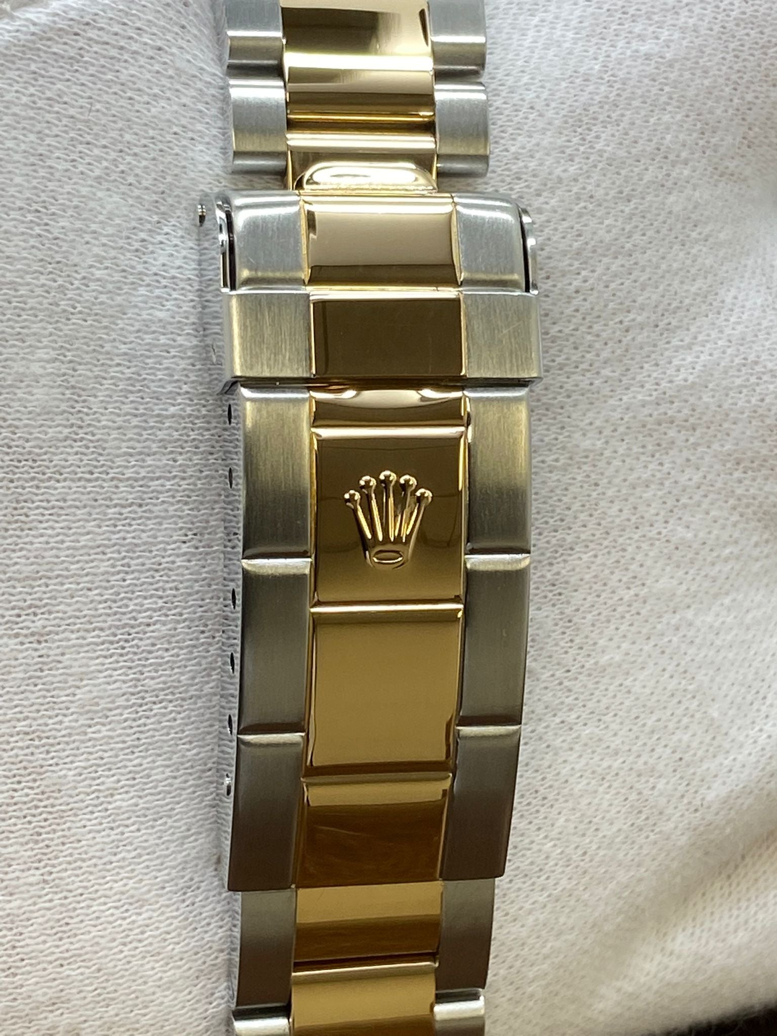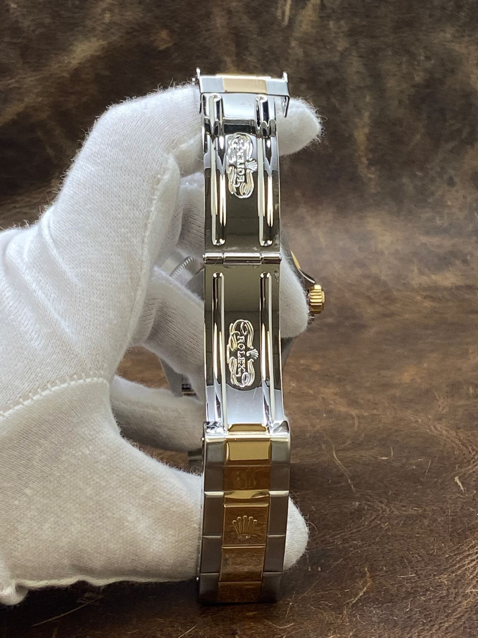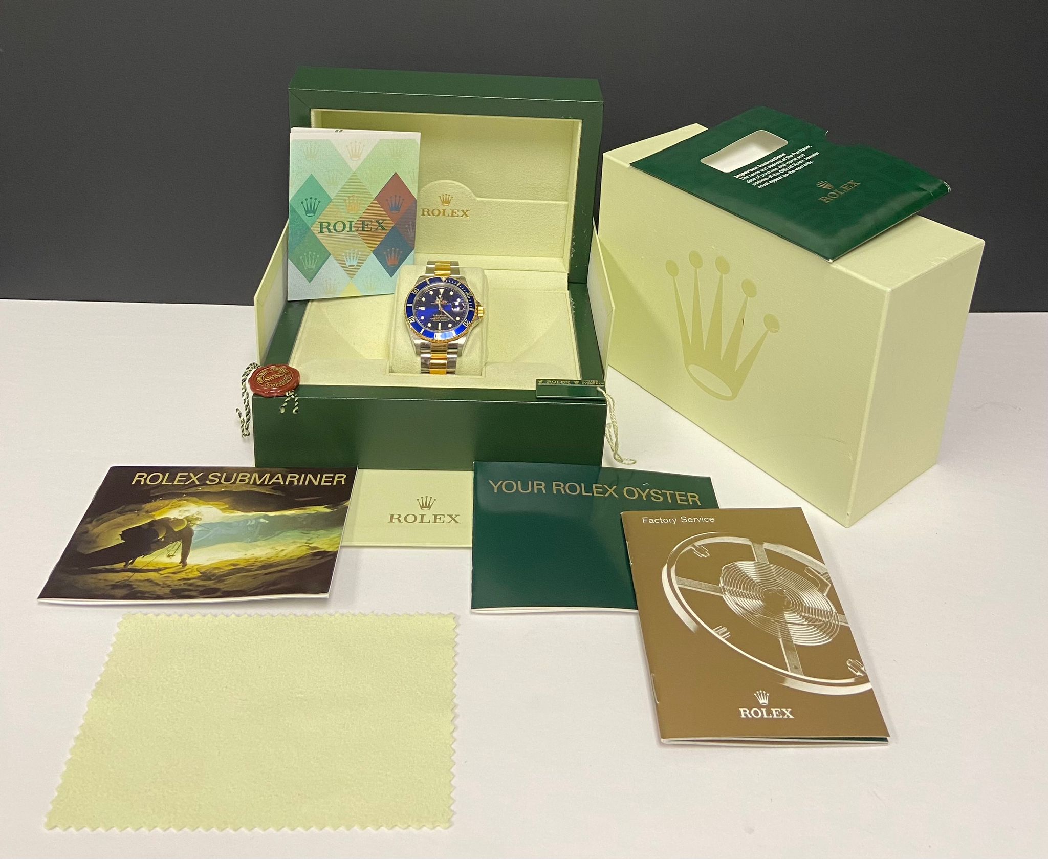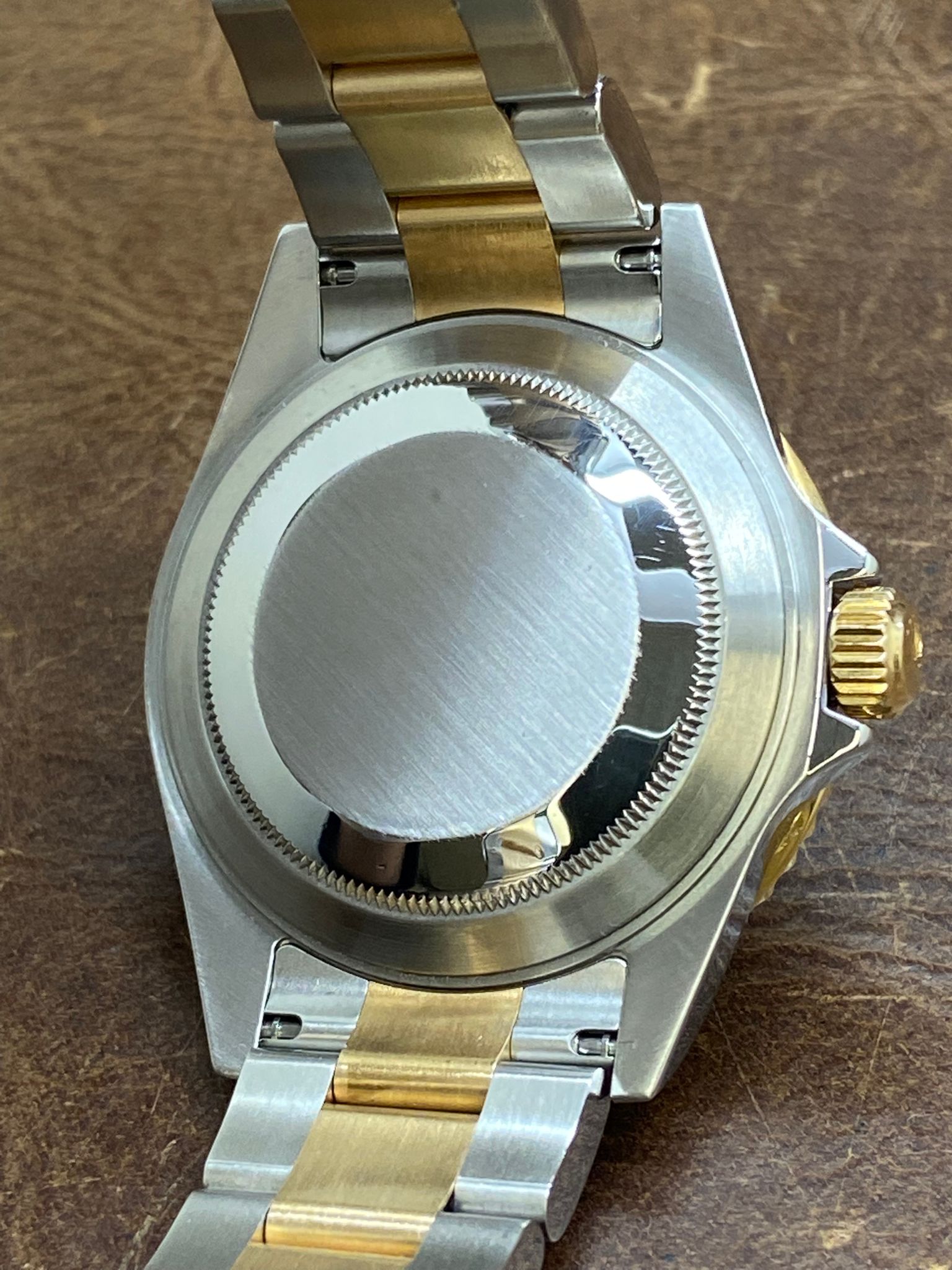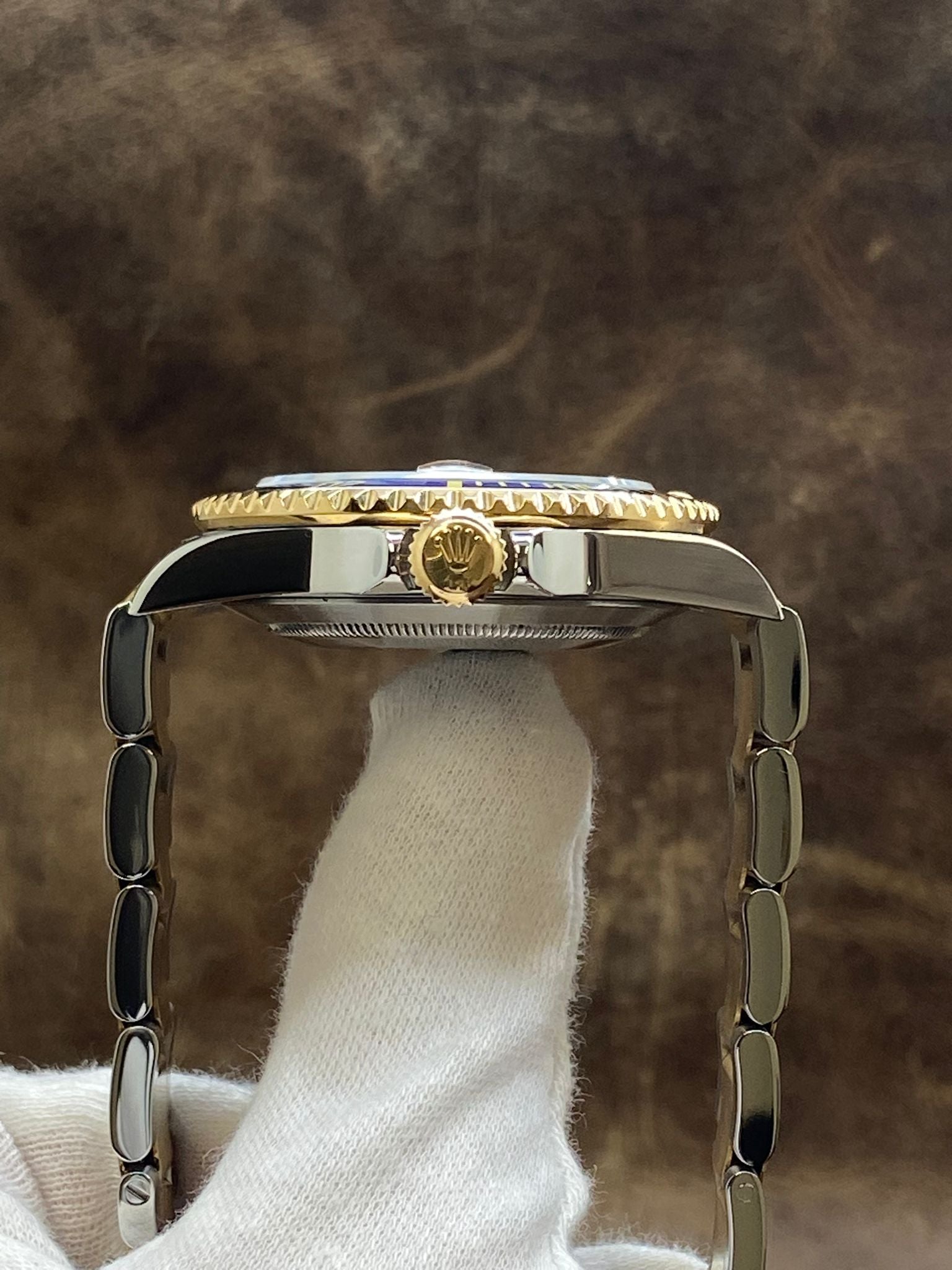 Stainless steel case with a stainless steel & 18k gold bracelet. Uni-directional rotating 18k yellow gold with aluminum top ring bezel. Blue dial with luminous gold-tone mercedes-logo, sword, and breguet-style hands and luminous dot & index hour markers. Dial type: analog. Rolex calibre 3135 automatic movement with about 48 hours of power reserve. Scratch resistant sapphire crystal. Screw down crown. Solid case back. Case size: 40 mm. Case thickness: 12.5 mm. Round case shape. Band width: mm. Fold over with safety release clasp. Water resistant at 300 meters / 1000 feet. Functions: date, hour, minute, second, chronometer. Rolex Submariner Date SEL 2007 NO Holes 16613 Blue Dial Automatic Men's Watch.
