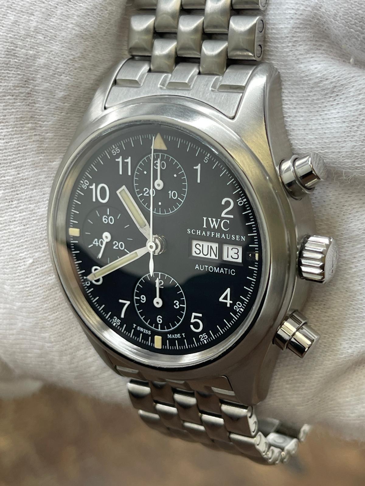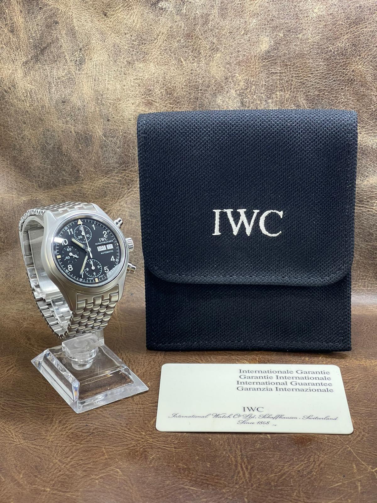 This pre-owned IWC Pilot Chronograph IW3706 is in very good condition and comes with: original IWC pouch & warranty card. The hands have been replaced and the 3 o'clock lume marker is missing. Max wrist size: 7.25 in.