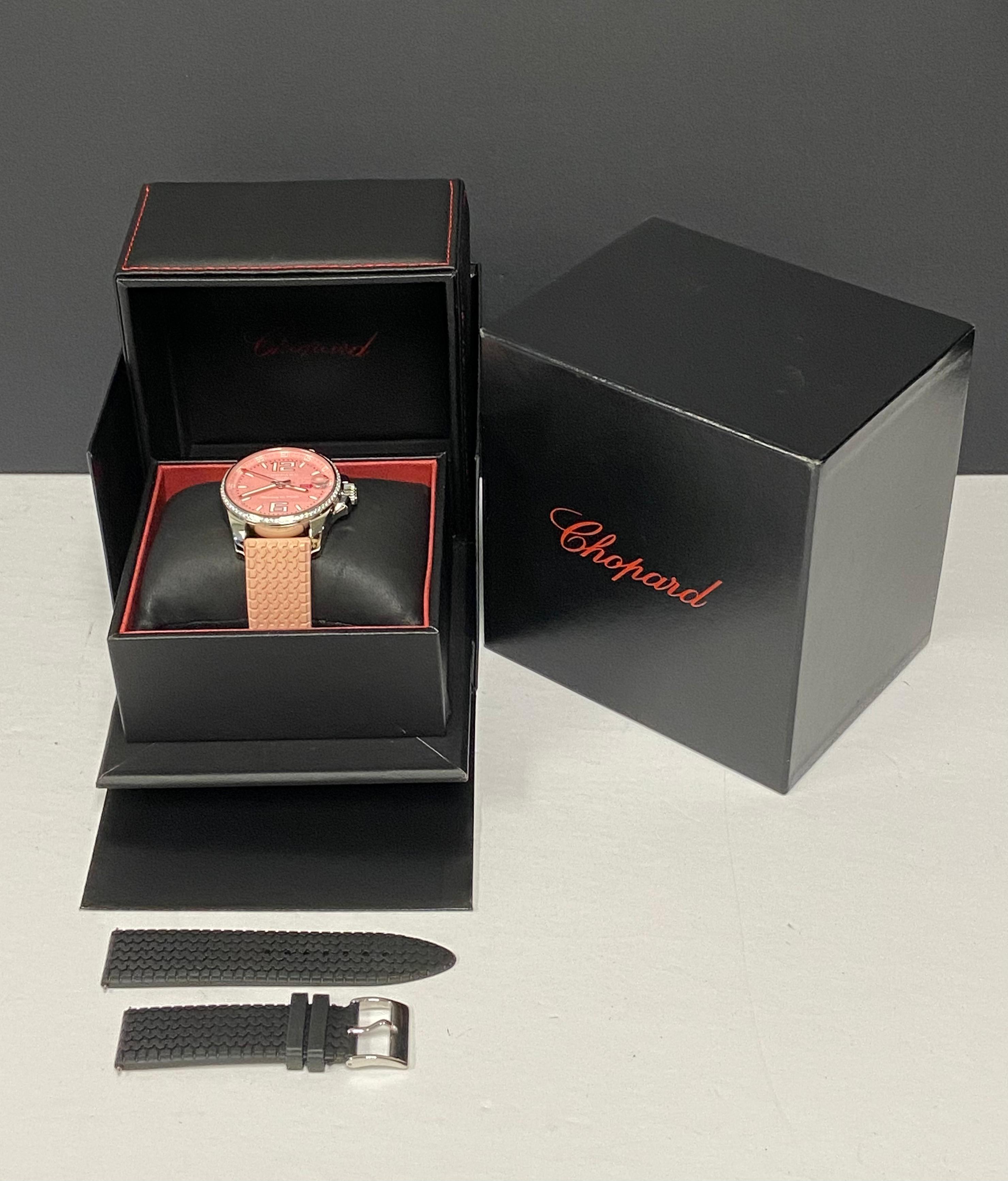 - original Chopard double box and extra black rubber strap with custom tang buckle