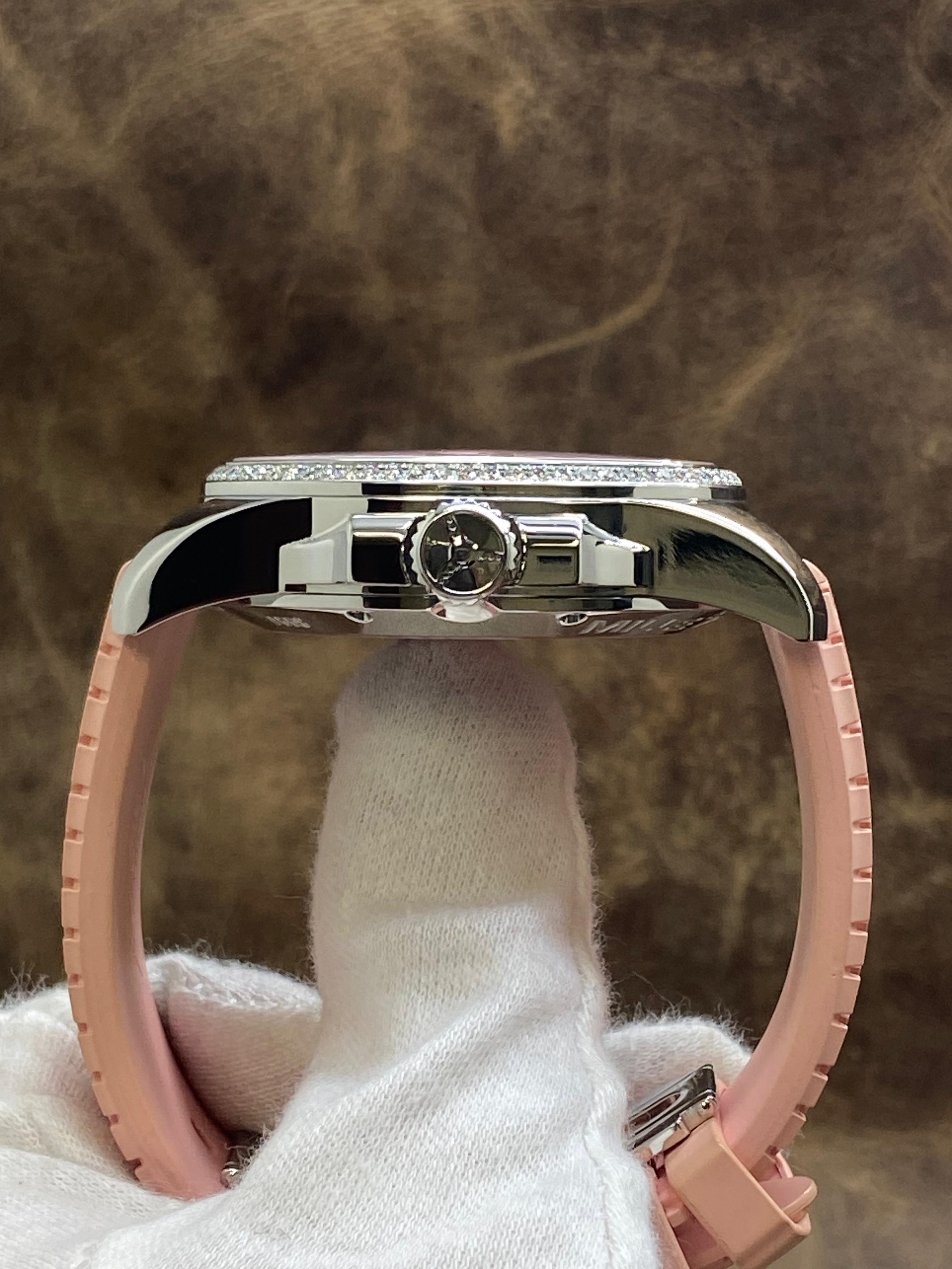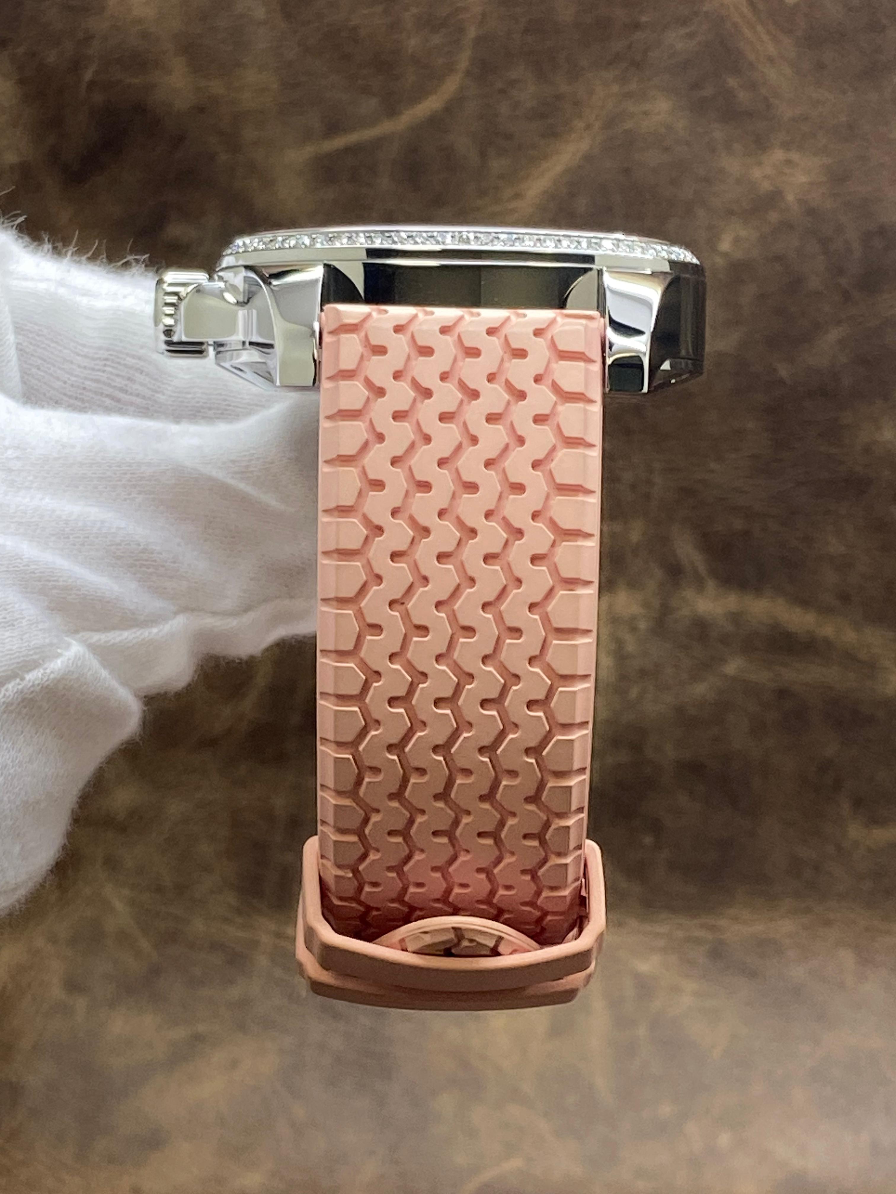 Stainless steel case with a rubber strap. Fixed stainless steel with diamonds bezel. Pink dial with luminous silver-tone hands and index & 6, 12 Arabic numeral hour markers. Dial type: analog. Eta caliber a07.111 automatic movement with about 46 hours of power reserve. Scratch resistant sapphire crystal. Pull/push crown. Transparent case back. Case size: 44 mm. Case thickness: 15 mm. Round case shape. Band width: mm. Double folded deployment clasp. Water resistant at 100 meters / 330 feet. Functions: date, hour, minute, seconds, cosc chronometer. Chopard Mille Miglia Gran Turismo XL L.E 250pcs OEM Diamond Bezel 178997-3001 Pink Dial Automatic Watch.
