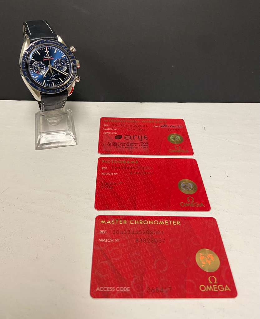 This pre-owned Omega Speedmaster Moonphase 304.33.44.52.03.001 is in mint condition and comes with: original & matching Omega pictograms, chronometer & warranty card dated Oct 2022. Max wrist size: 8.5 in.