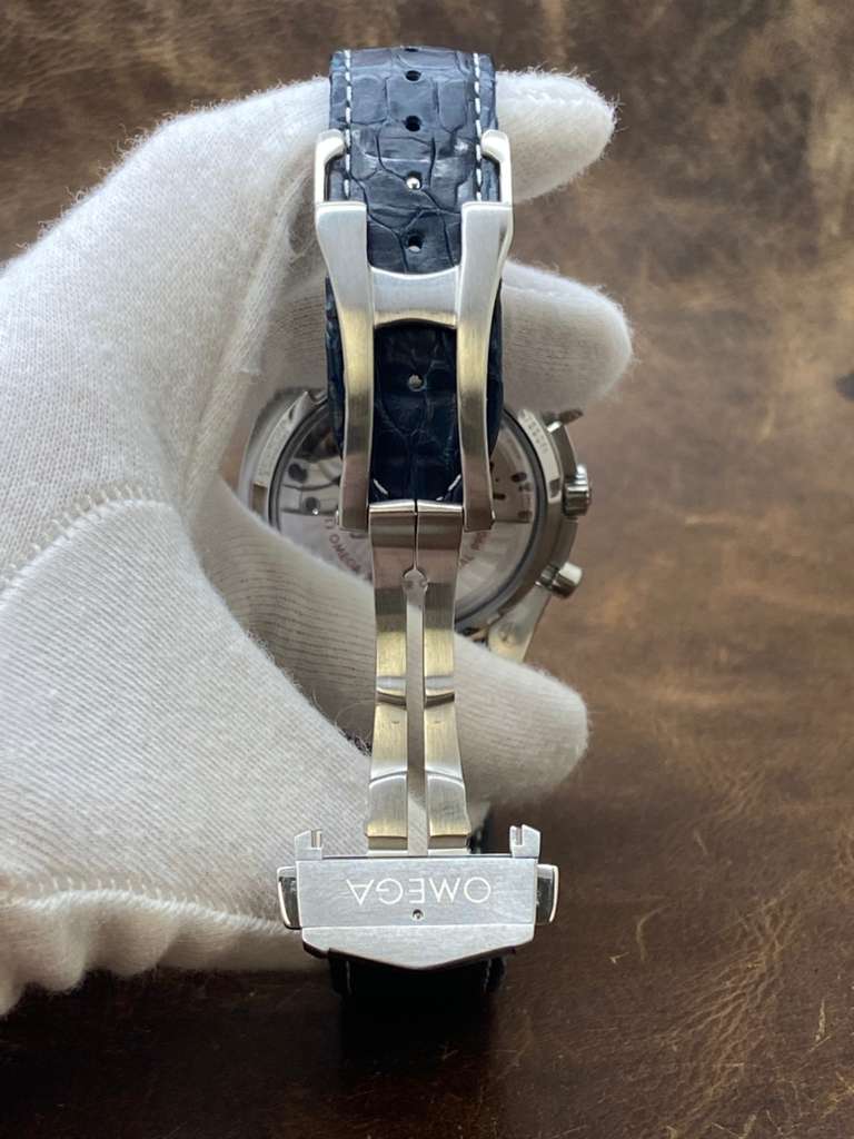 Stainless steel case with a crocodile leather strap. Fixed tachymeter scale stainless steel bezel with a ceramic top ring bezel. Blue dial with silver tone luminous hands and index hour markers. Dial type: analog. Omega 9904 automatic movement with about 60 hours of power reserve. Sapphire crystal. Crown. Transparent case back. Case size: 44.25 mm. Case thickness: 16.9 mm. Round case shape. Band width: mm. Push button deployant buckle clasp. Water resistant at 100 meters / 330 feet. Functions: chronograph, moonphase, date, hour, minute, seconds, anti-magnetic, tachymeter, master certified chronometer. Omega Speedmaster Moonphase 304.33.44.52.03.001 Blue Dial Automatic Men's Watch.
