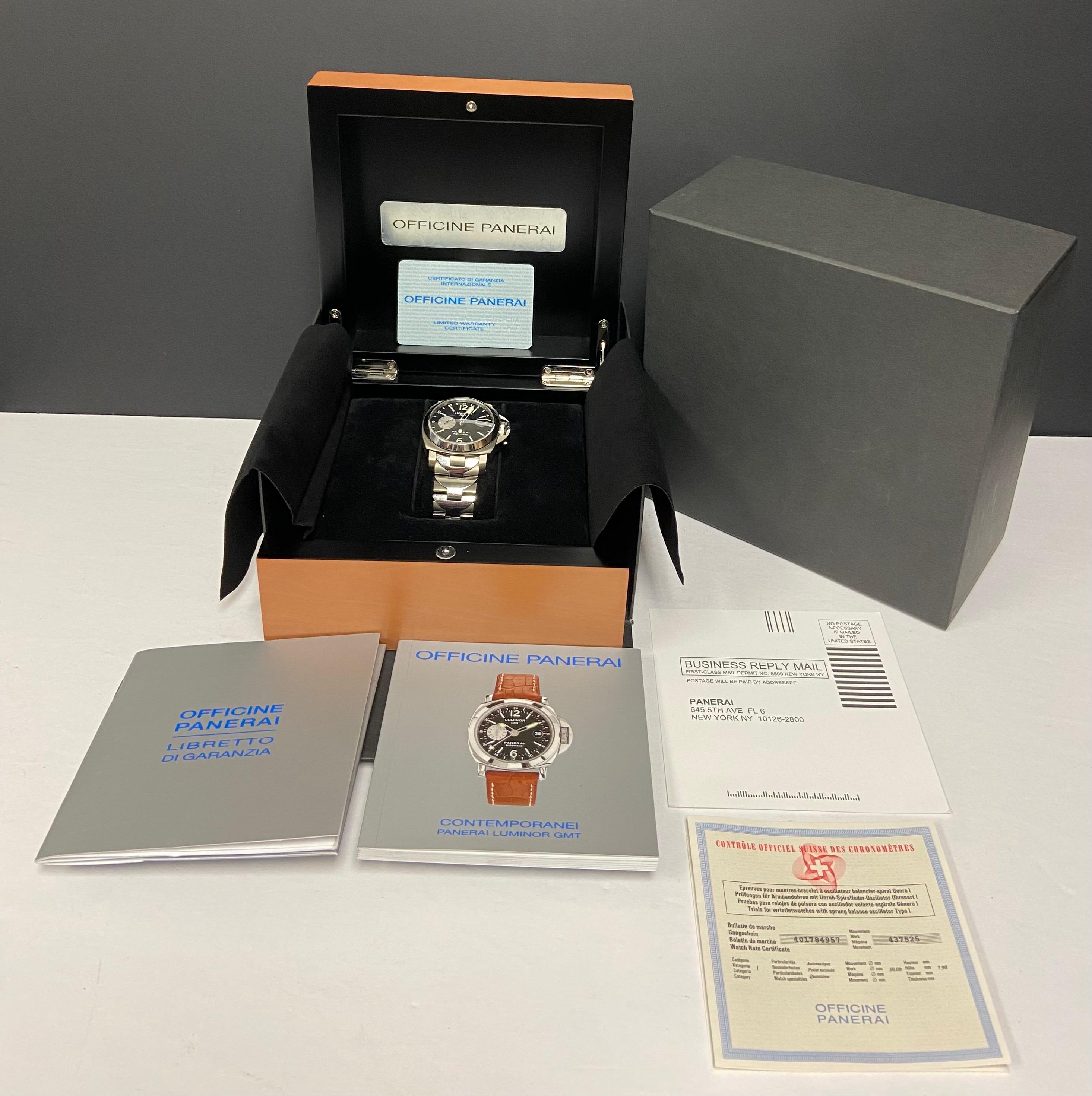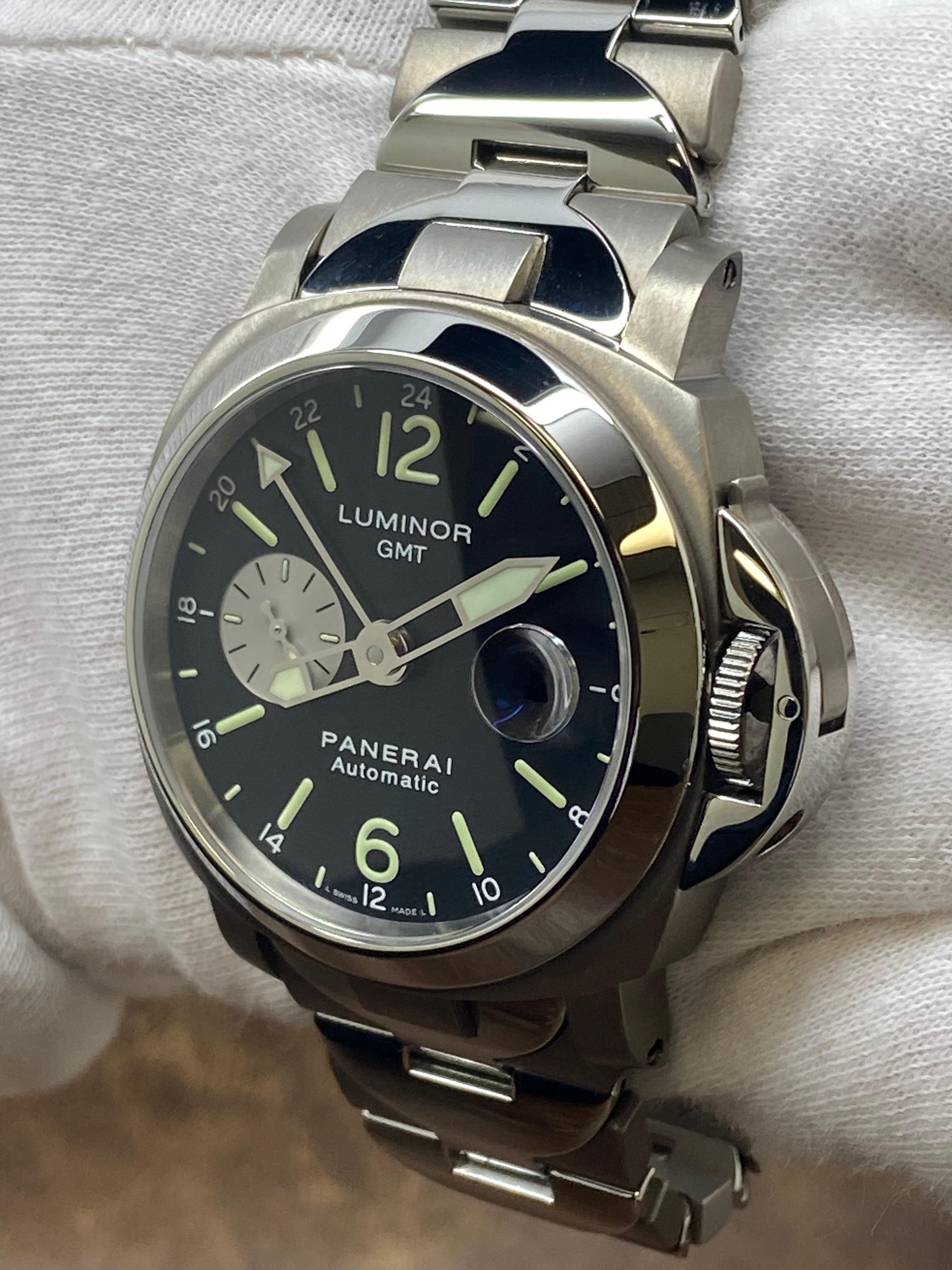 This pre-owned Panerai Luminor GMT Titanium 44mm PAM00161 is in mint condition and comes with: original Panerai double box, booklets and matching warranty card dated 2005. Max wrist size: 7.75 in.