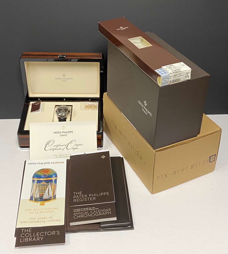 This pre-owned Patek Philippe Annual Calendar Platinum 5905P-010 is in excellent condition and comes with: original Patek Philippe triple box, tags, booklets and matching warranty -papers dated 2015 as well as service papers dated 2022. The watch needs a light buff to be mint. Max wrist size: 7.5 in.