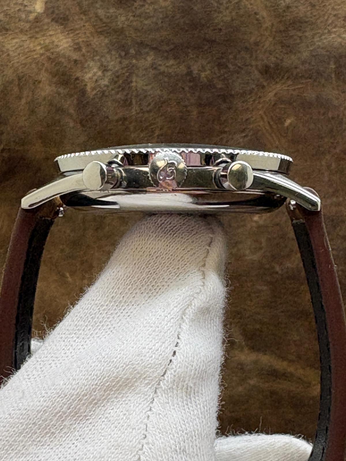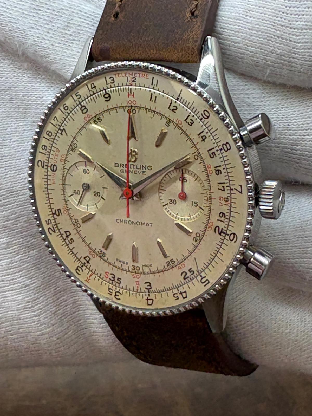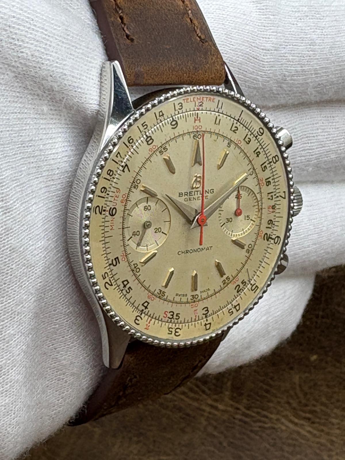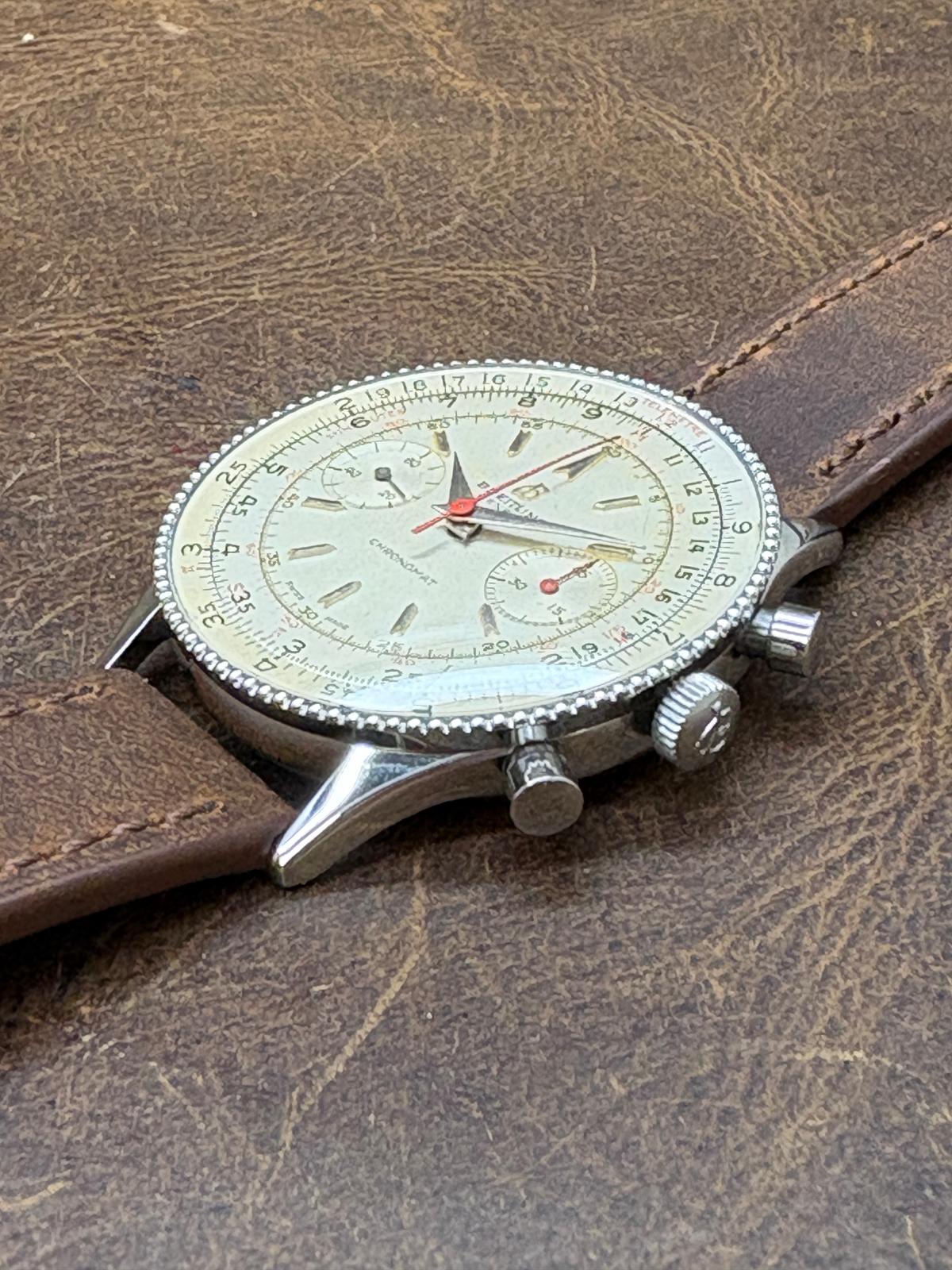 Stainless steel case with a custom leather strap custom leather strap. Bi-directional rotating slide rule stainless steel bezel. White dial with silver-tone hands and index hour markers. Dial type: analog. Venus 175 hand wind movement with about of power reserve. Acrylic crystal. Pull/push crown. Solid case back. Case size: 37mm mm. Case thickness: 11.5 mm. Round case shape. Band width: mm. Custom steel tang clasp. Water resistant at not waterproof. Functions: hour, minute, seconds, chronograph, slide rule. Breitling Chronomat 808 Chronograph 217012 White Dial Hand Wind Men's Watch.