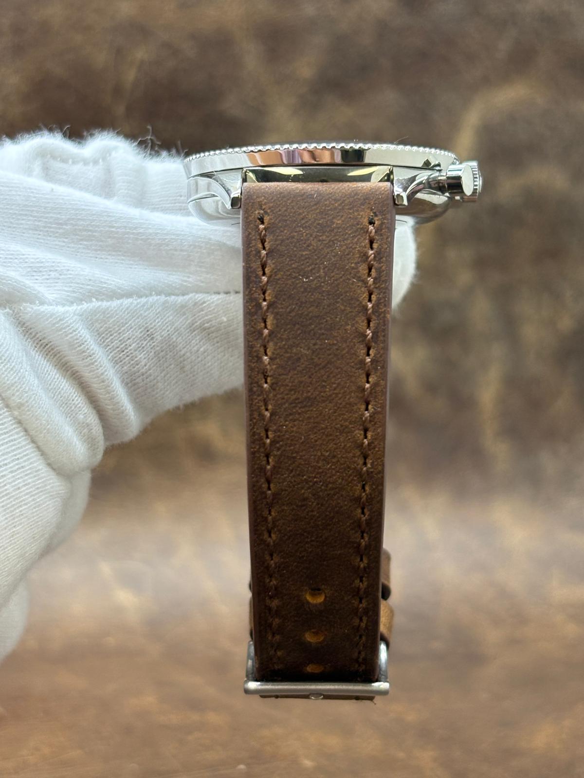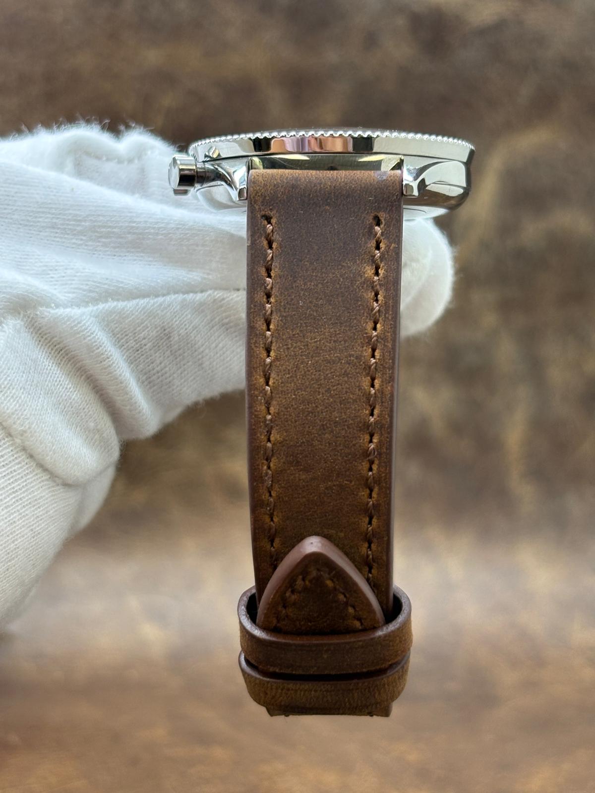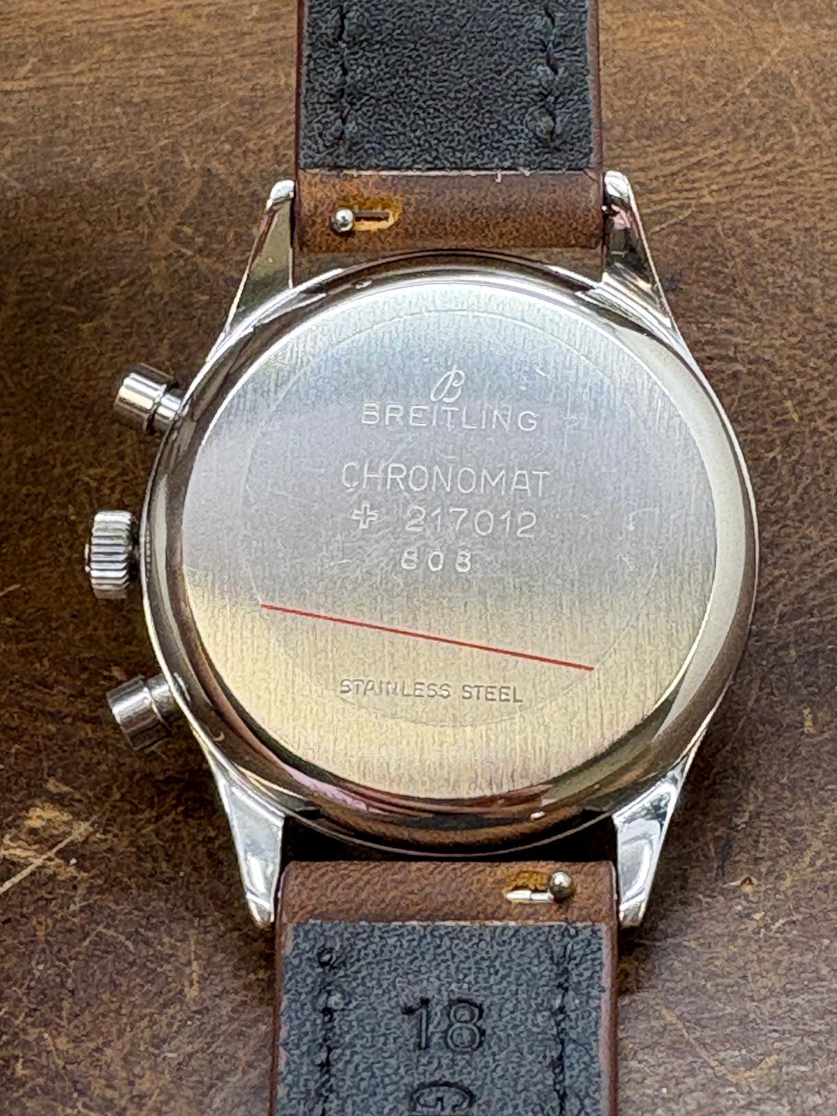 This pre-owned Breitling Chronomat 808 Chronograph 217012 is in excellent condition and comes with: NO box or papers. The watch comes with a custom brown leather strap and unsigned steel tang buckle. Max wrist size: 7 in.