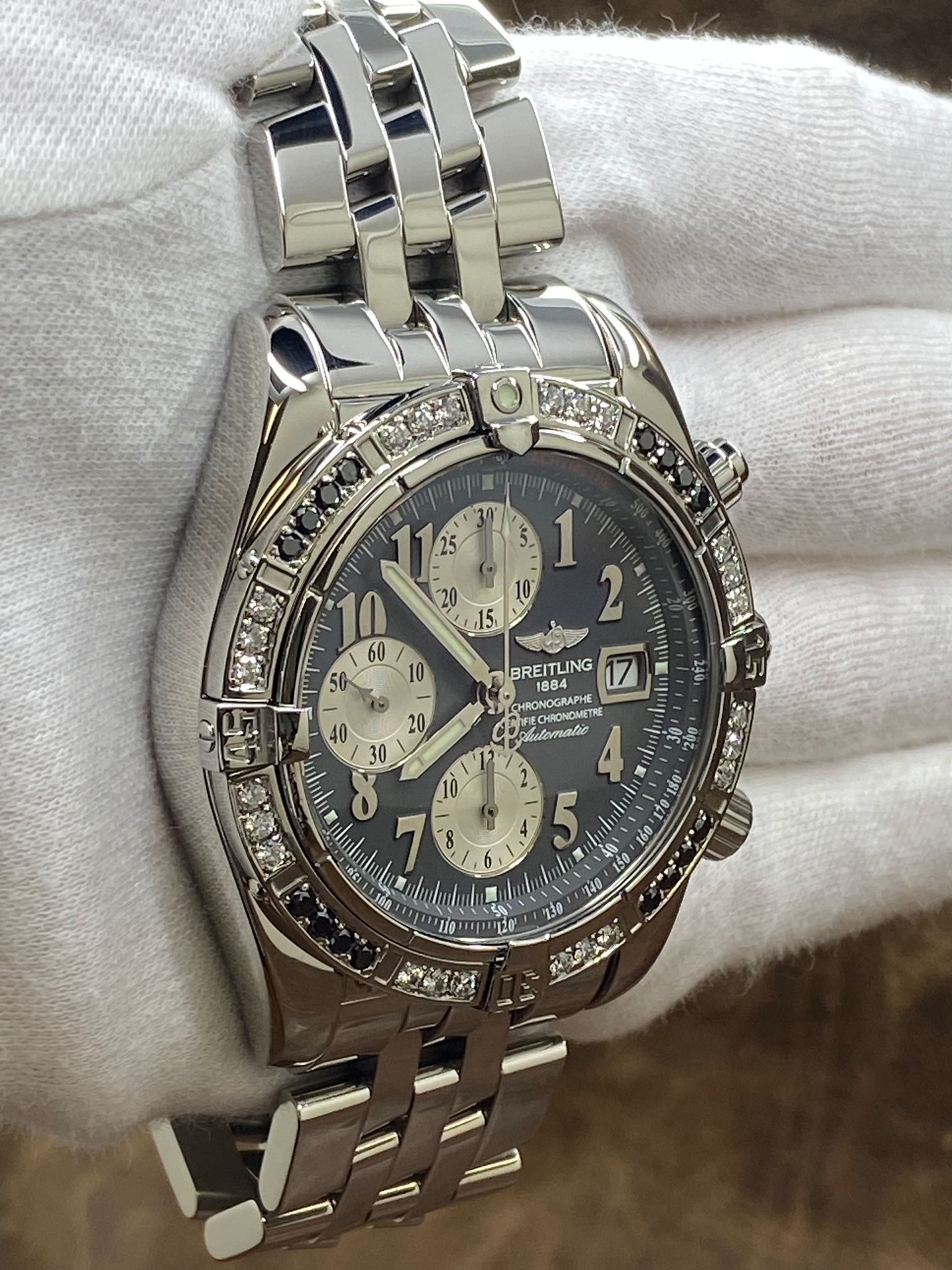 This pre-owned Breitling Chronomat Evolution Chronograph A13356 is in mint condition and comes with: NO box or papers. The watch comes with a factory stainless steel bezel with CUSTOM set black and white diamonds. Max wrist size: 7.5 in.
