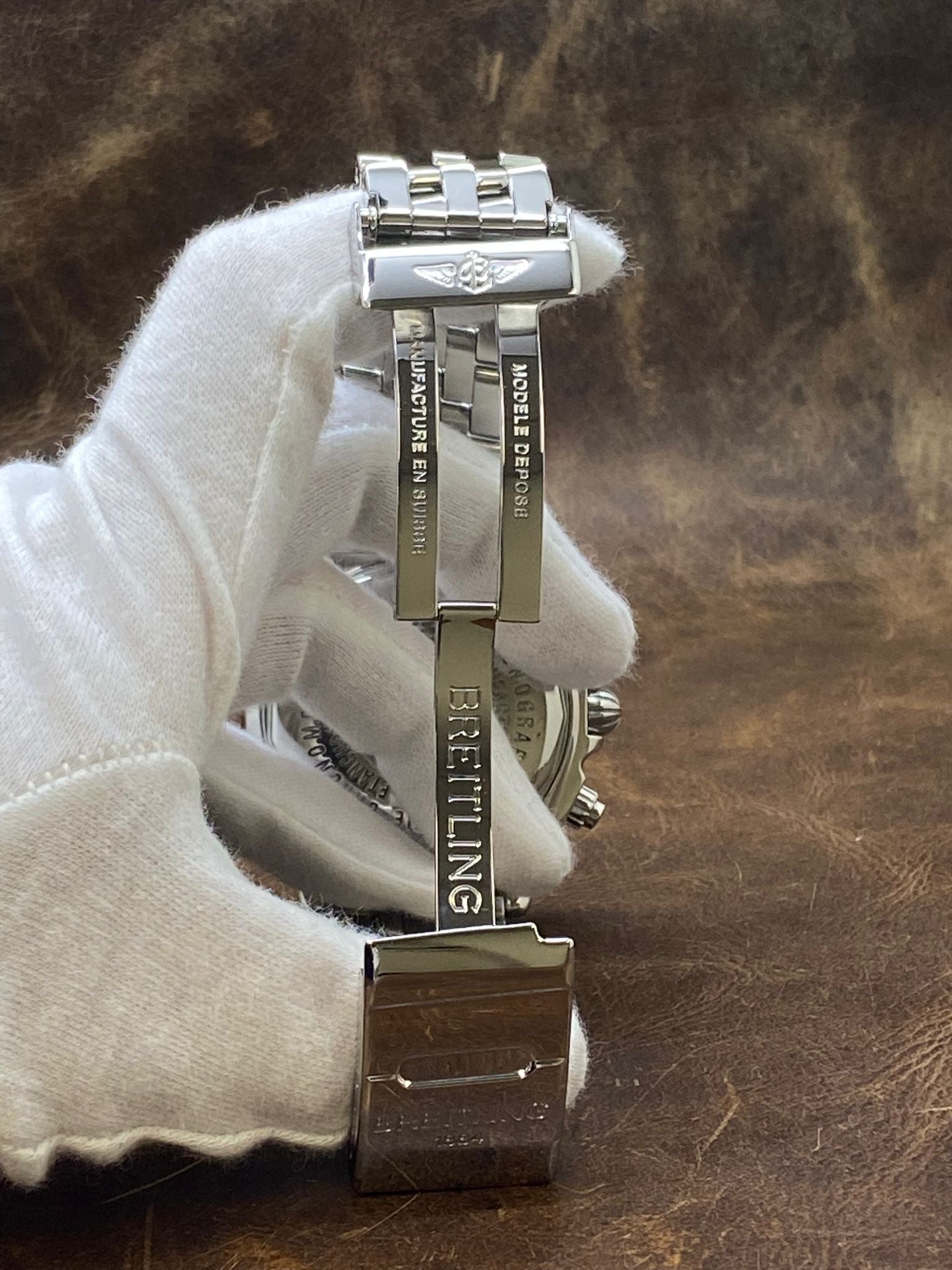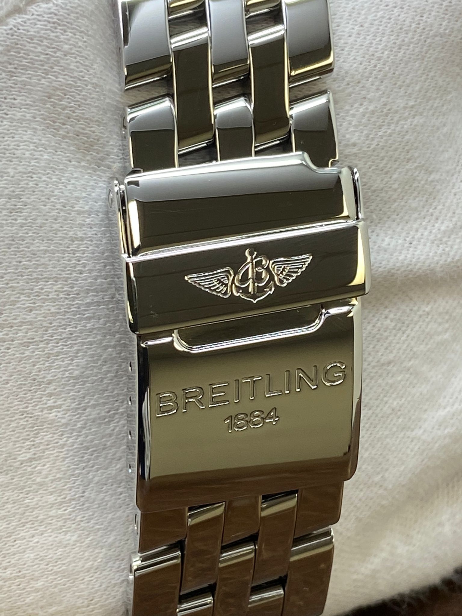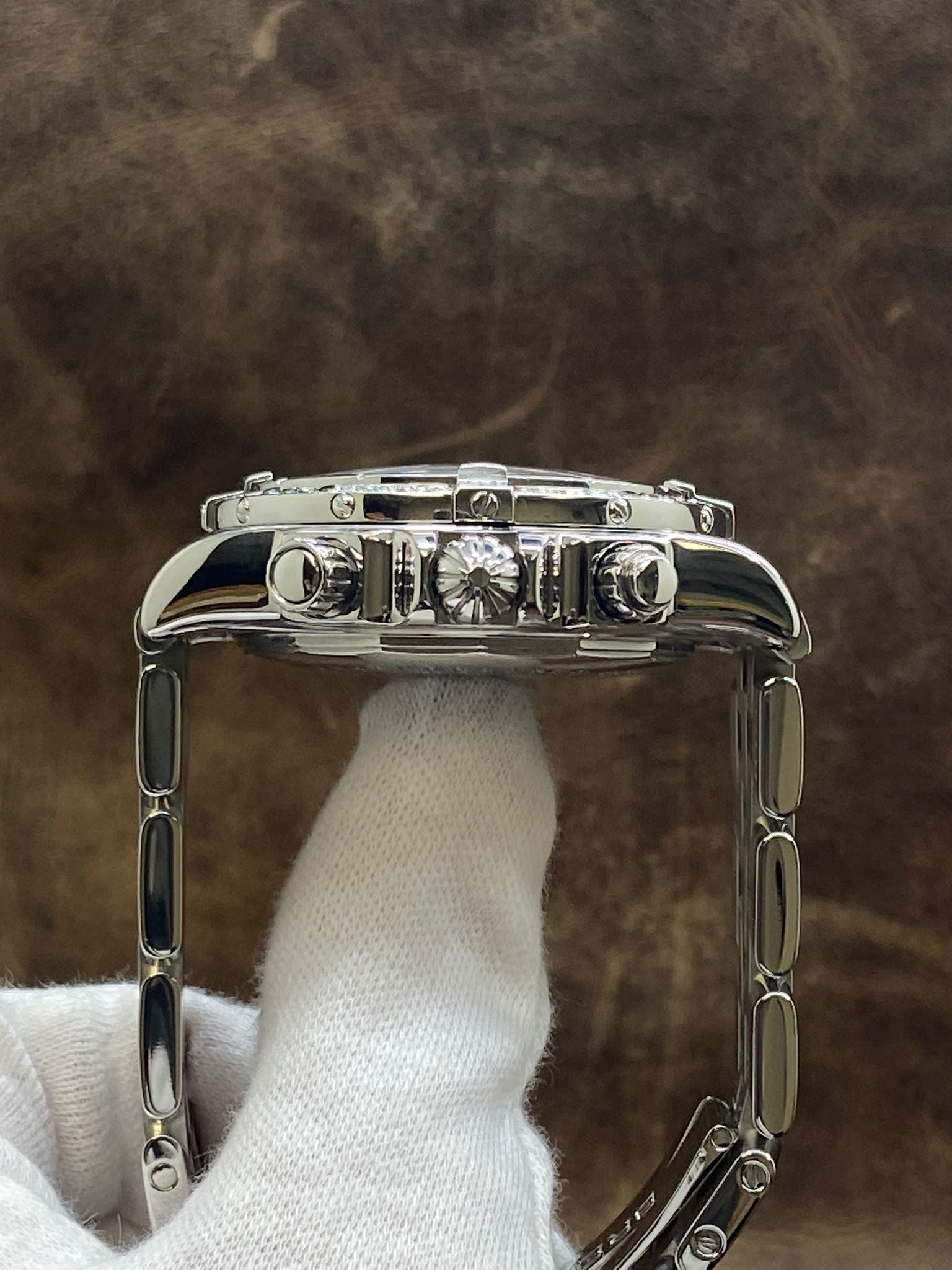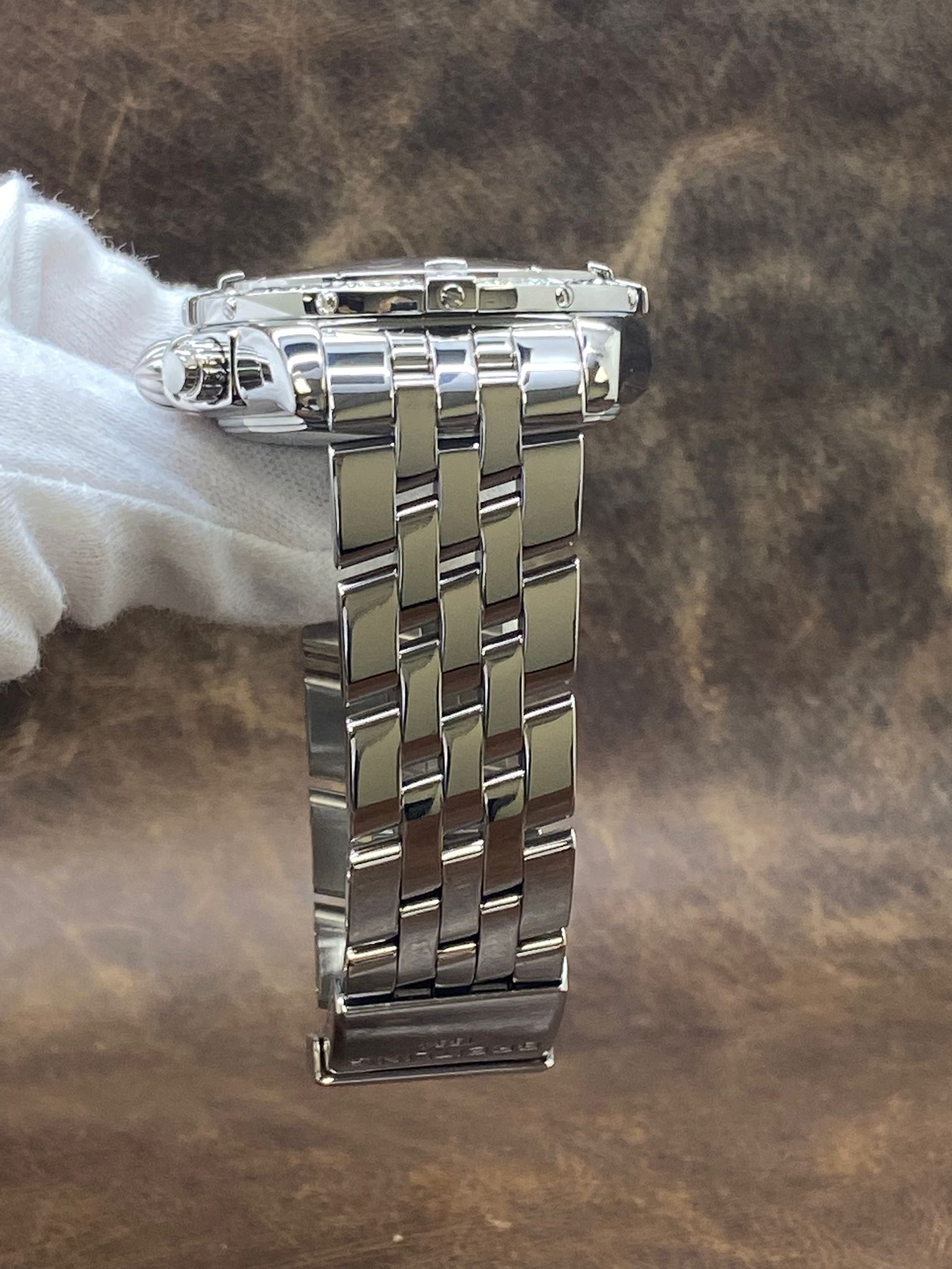 Stainless steel case with a stainless steel bracelet. Uni-directional rotating stainless steel with custom added diamonds bezel. Rhodium dial with luminous silver-tone hands and Arabic numerals hour markers. Dial type: analog. Caliber: Breitling 13 automatic movement with about 42 hour of power reserve. Scratch resistant sapphire crystal. Screw down crown. Solid case back. Case size: 44 mm. Case thickness: 17.1 mm. Round case shape. Band width: mm. Fold over w/ safety release clasp. Water resistant at 300 meters / 1000 feet. Functions: chronograph, date, hour, minute, seconds. Breitling Chronomat Evolution Chronograph A13356 Rhodium Dial Automatic Men's Watch.