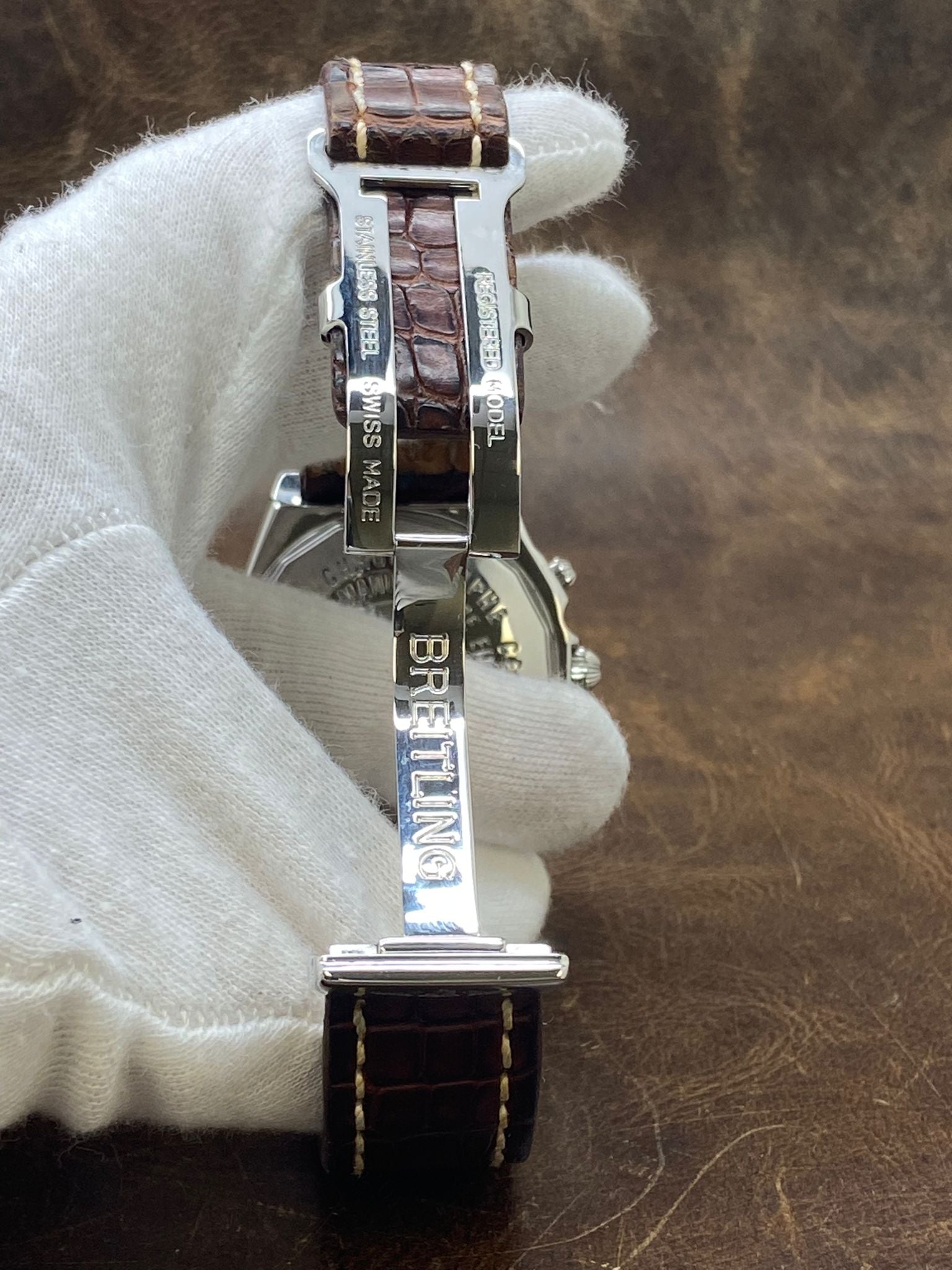 Stainless steel case with a leather strap. Bi-directional rotating stainless steel bezel. Brown panda dial with luminous white hands and index hour markers. Dial type: analog. Breitling 20 automatic movement with about 42 hours of power reserve. Scratch resistant sapphire crystal. Screw locked crown. Solid case back. Case size: 40 mm. Case thickness: 13.9 mm. Round case shape. Band width: mm. Fold over clasp. Water resistant at 100 meters / 330 feet. Functions: chronograph, gmt, date, hour, minute. Breitling Chronomat Longitude 40mm A20348 Brown Panda Dial Automatic Men's Watch.