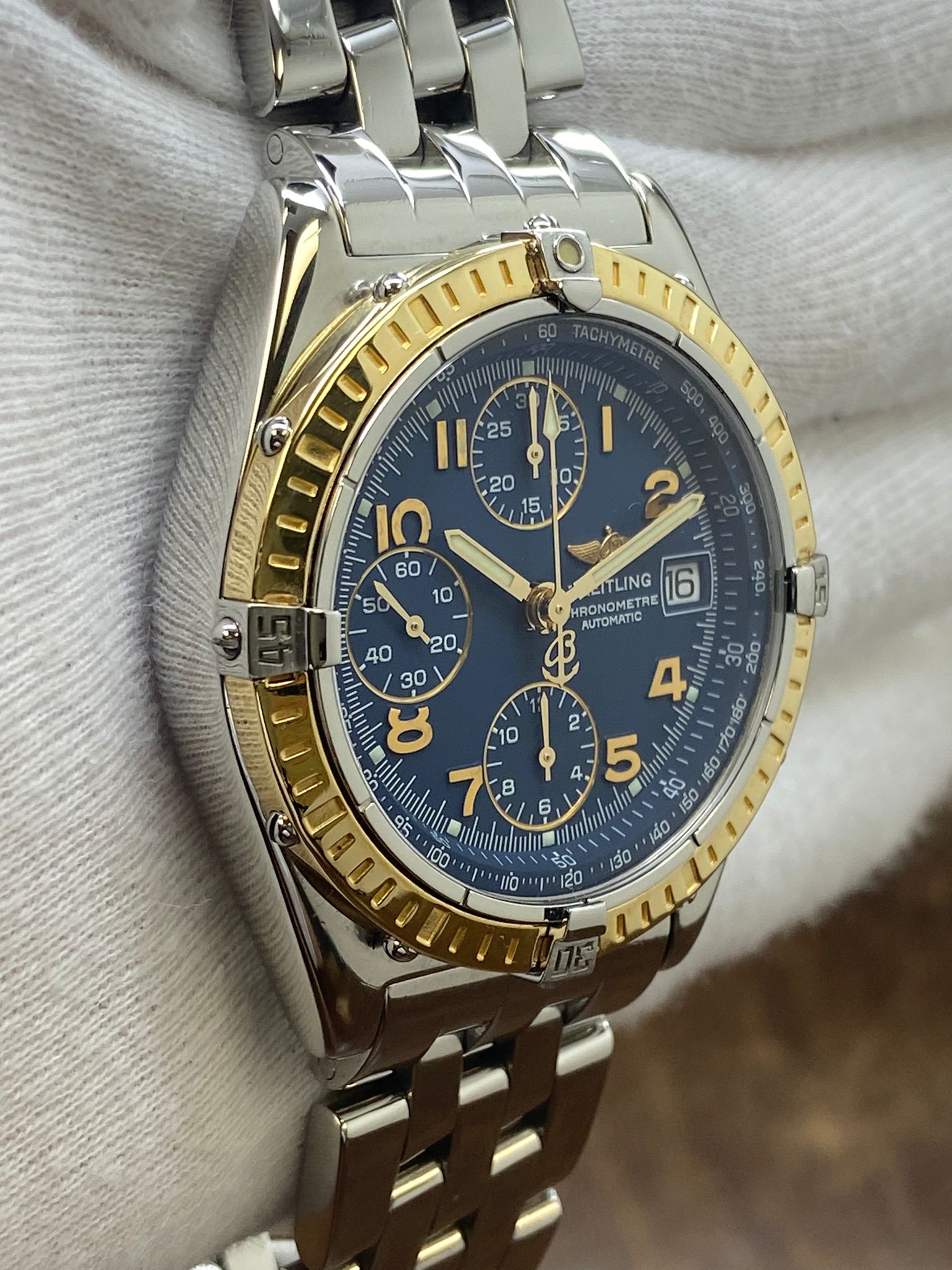 Stainless steel case with a stainless steel bracelet. Uni-directional rotating 18k yellow gold bezel. Blue dial with luminous gold-tone hands and Arabic numerals hour markers. Dial type: analog. Breitling 13 automatic movement with about 42 hours of power reserve. Scratch resistant sapphire crystal. Screw down crown. Solid case back. Case size: 39 mm. Case thickness: 14,5 mm. Round case shape. Band width: mm. Fold over with safety release clasp. Water resistant at 100 meters / 330 feet. Functions: chronograph, date, hour, minute, seconds, tachymeter. Breitling Chronomat Factory Warranty D13352 Blue Dial Automatic Men's Watch.