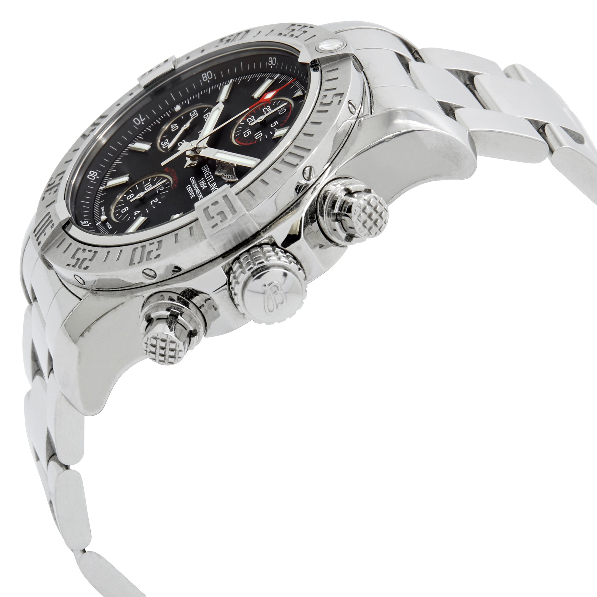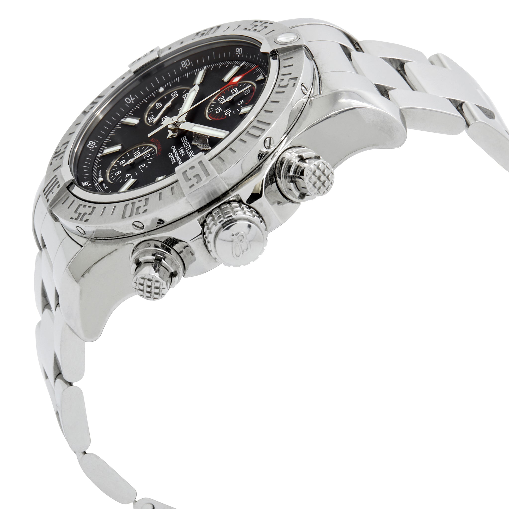 Stainless steel case with a stainless steel bracelet. Unidirectional rotating stainless steel bezel. Black dial with luminous silver-tone hands and index hour markers. Dial type: analog. Luminescent hands and markers. Breitling calibre 13 automatic movement with about 42 hours of power reserve. Scratch resistant sapphire crystal. Screw locked - two gaskets crown. Solid case back. Case size: 43 mm. Case thickness: 16.5 mm. Round case shape. Band width: 22 mm. Deployment clasp. Water resistant at 300 meters / 1000 feet. Functions: chronograph, chronometer, date, hour, minute, second. Breitling Super Avenger II A1338111 Black Dial Automatic Men's Watch.