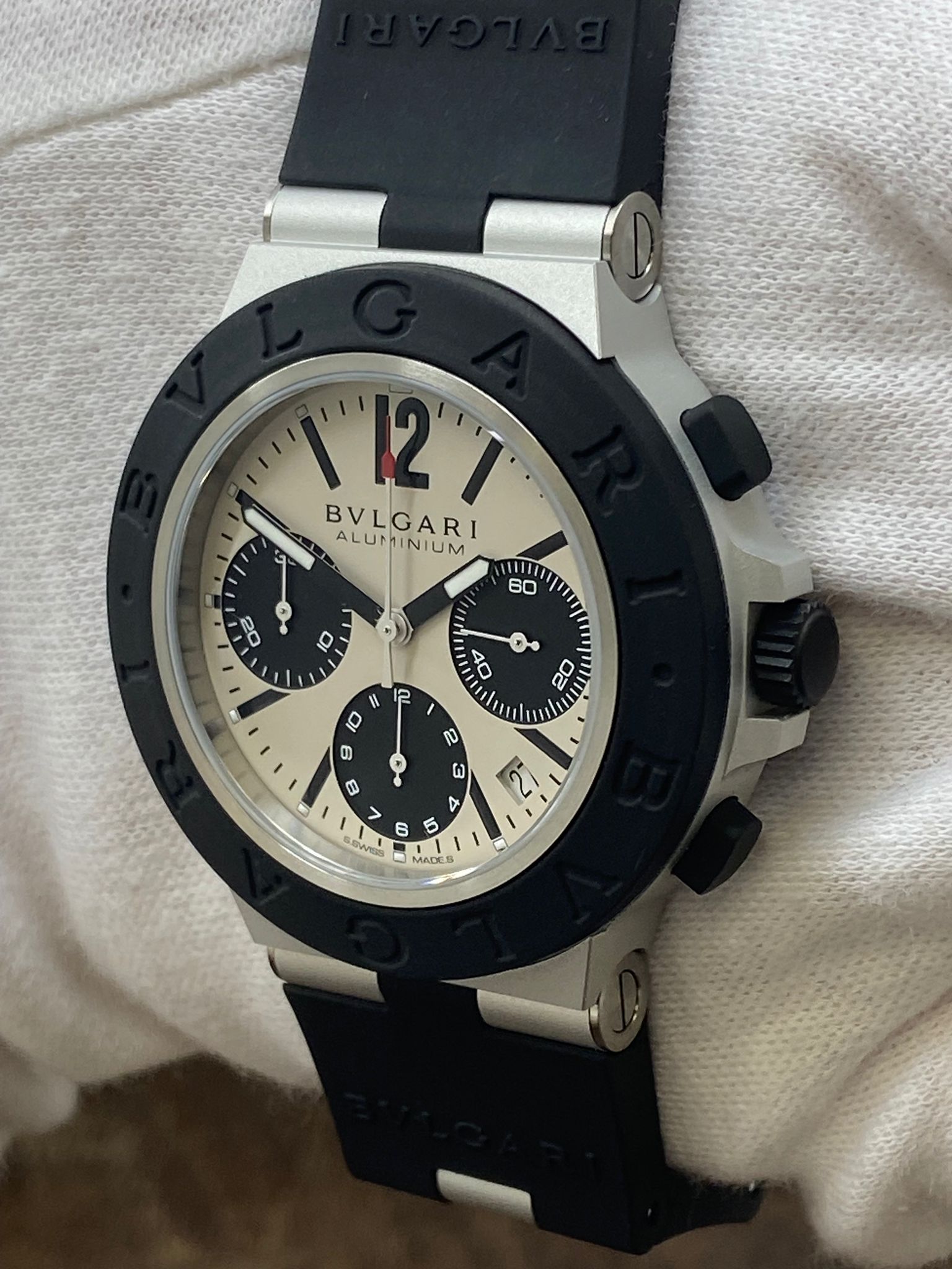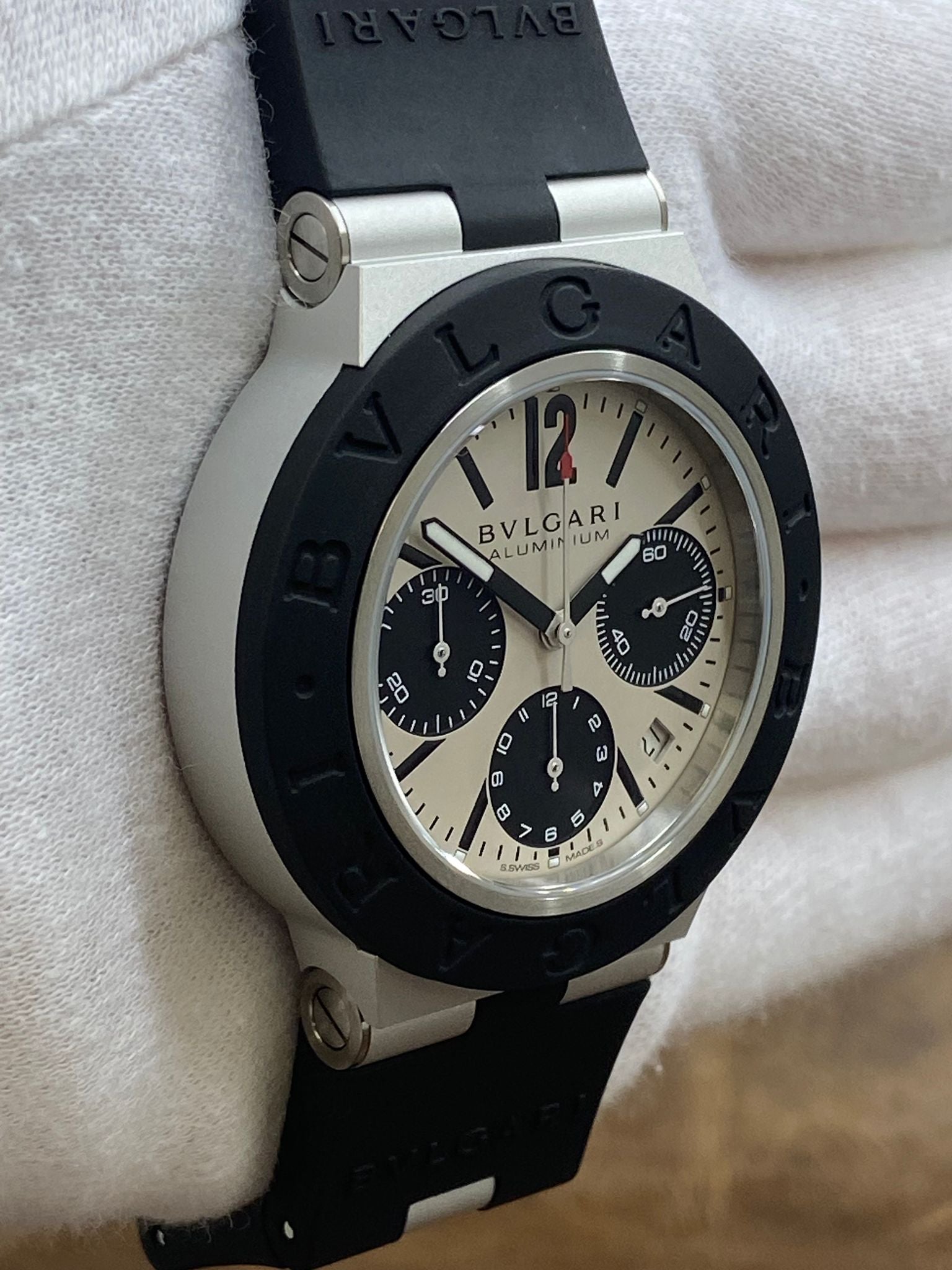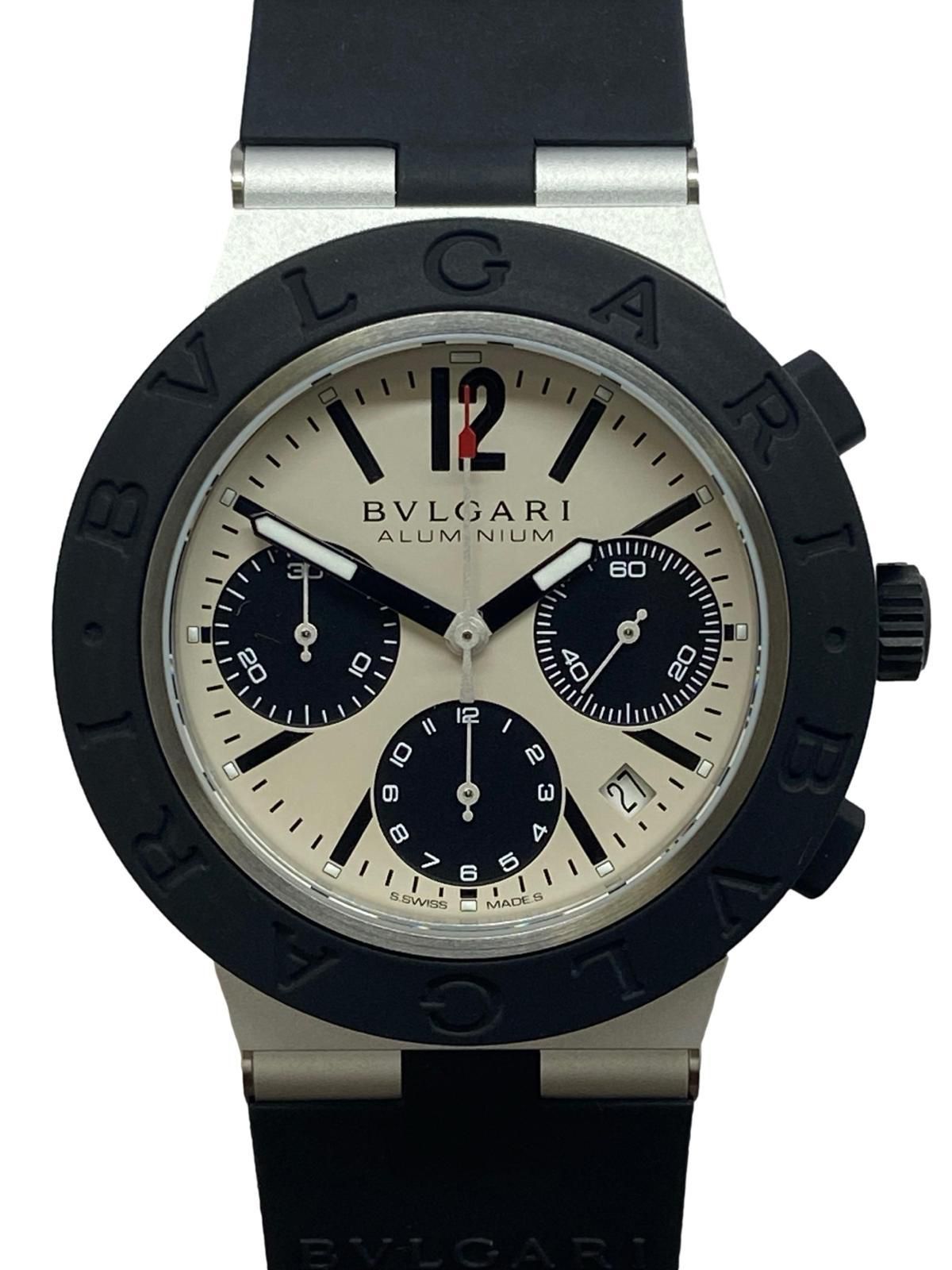 Aluminum & titanium case with a rubber strap. Fixed rubber bezel. Off white dial with luminous black hands and index & 12 Arabic hour markers. Dial type: analog. Automatic movement with about 42 of power reserve. Sapphire crystal. Crown. Solid case back. Case size: 41 mm. Case thickness: mm. Round case shape. Band width: mm. Tang buckle clasp. Water resistant at 100 meters / 330 feet. Functions: date, hour, minute, seconds, chronograph. Bulgari Aluminum Chronograph BB41ATCH Off white Dial Automatic Men's Watch.