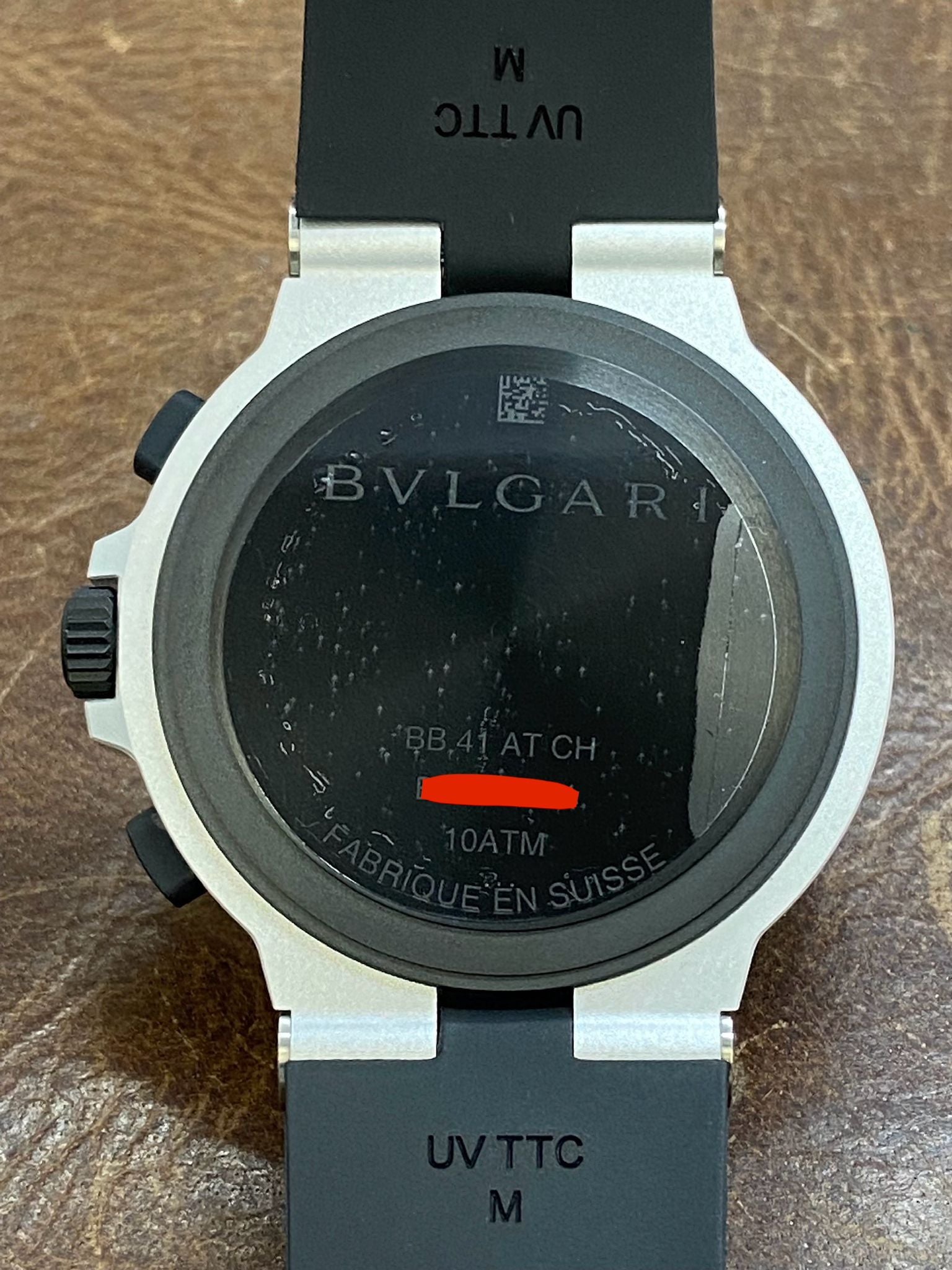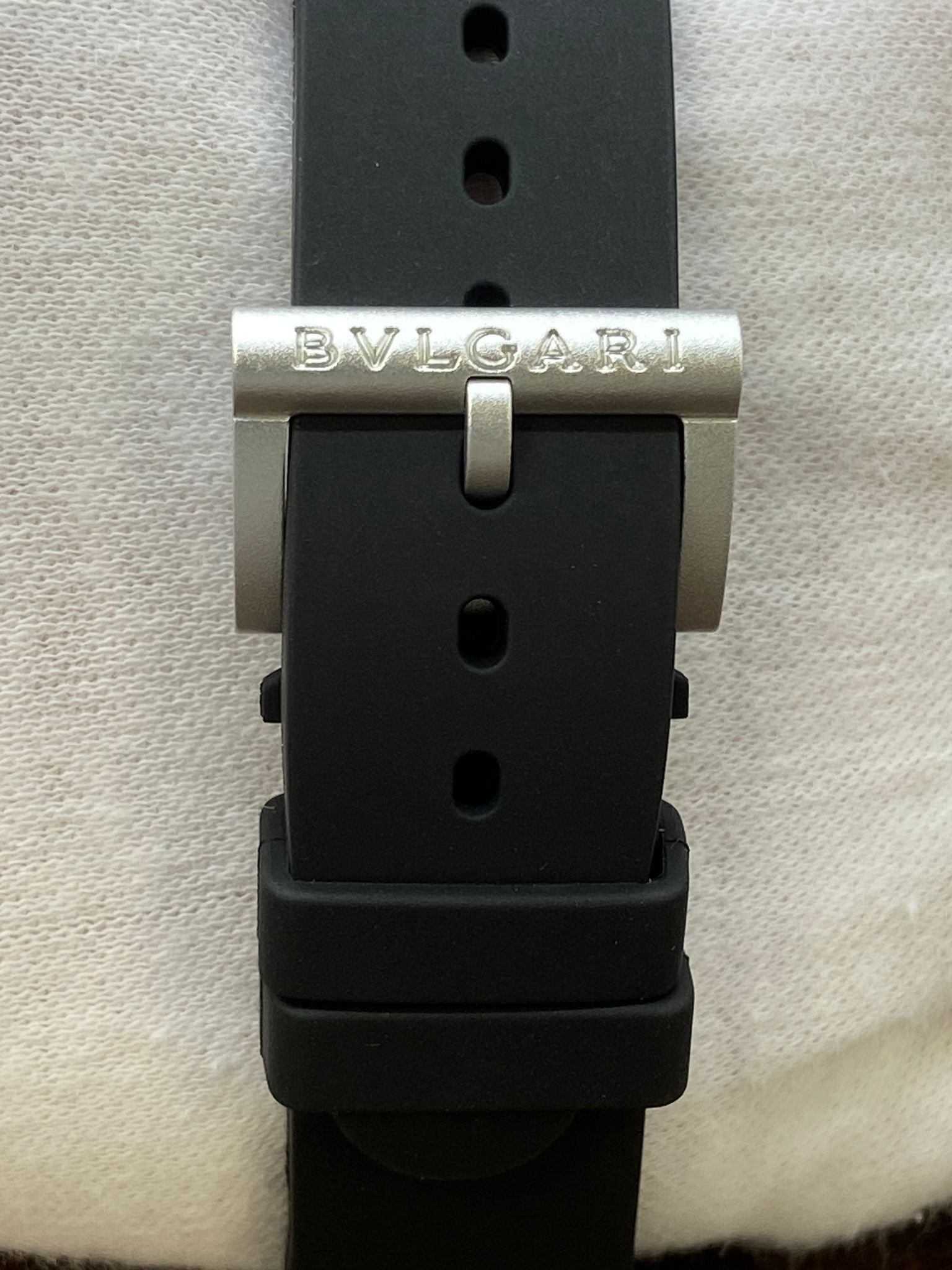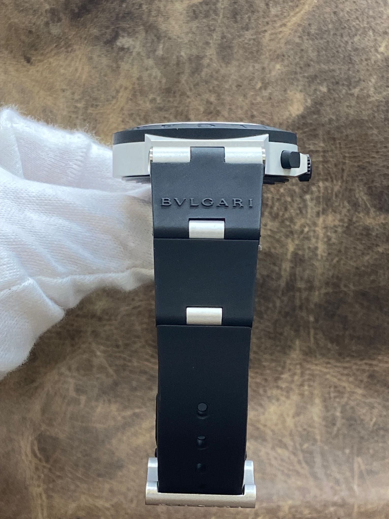 Aluminum & titanium case with a rubber strap. Fixed rubber bezel. Off white dial with luminous black hands and index & 12 Arabic hour markers. Dial type: analog. Automatic movement with about 42 of power reserve. Sapphire crystal. Crown. Solid case back. Case size: 41 mm. Case thickness: mm. Round case shape. Band width: mm. Tang buckle clasp. Water resistant at 100 meters / 330 feet. Functions: date, hour, minute, seconds, chronograph. Bulgari Aluminum Chronograph BB41ATCH Off white Dial Automatic Men's Watch.