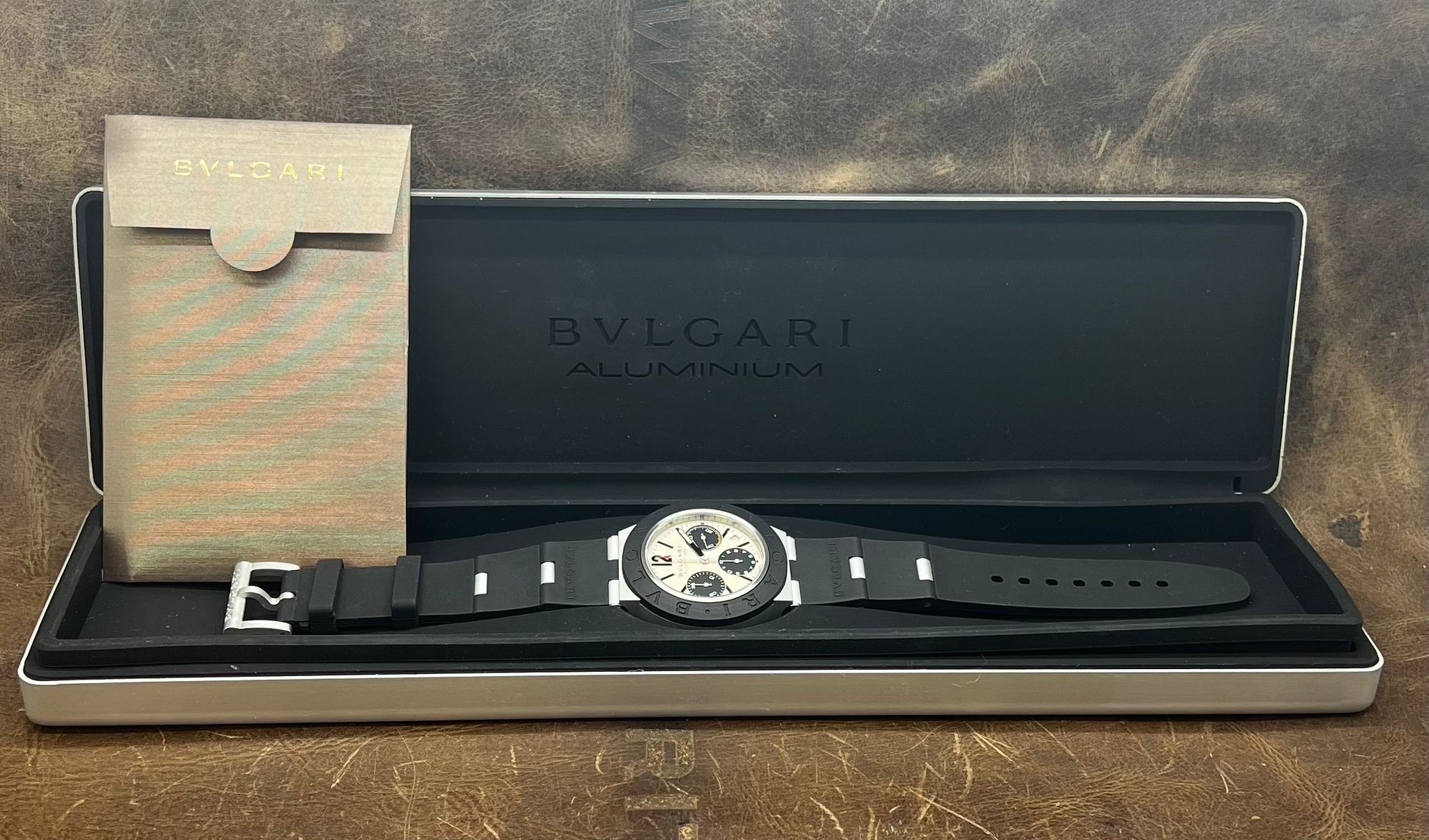 This pre-owned Bulgari Aluminum Chronograph BB41ATCH is in unworn condition and comes with: original Bulgari box and matching warranty papers dated March 2024. Max wrist size: 7.25 in.