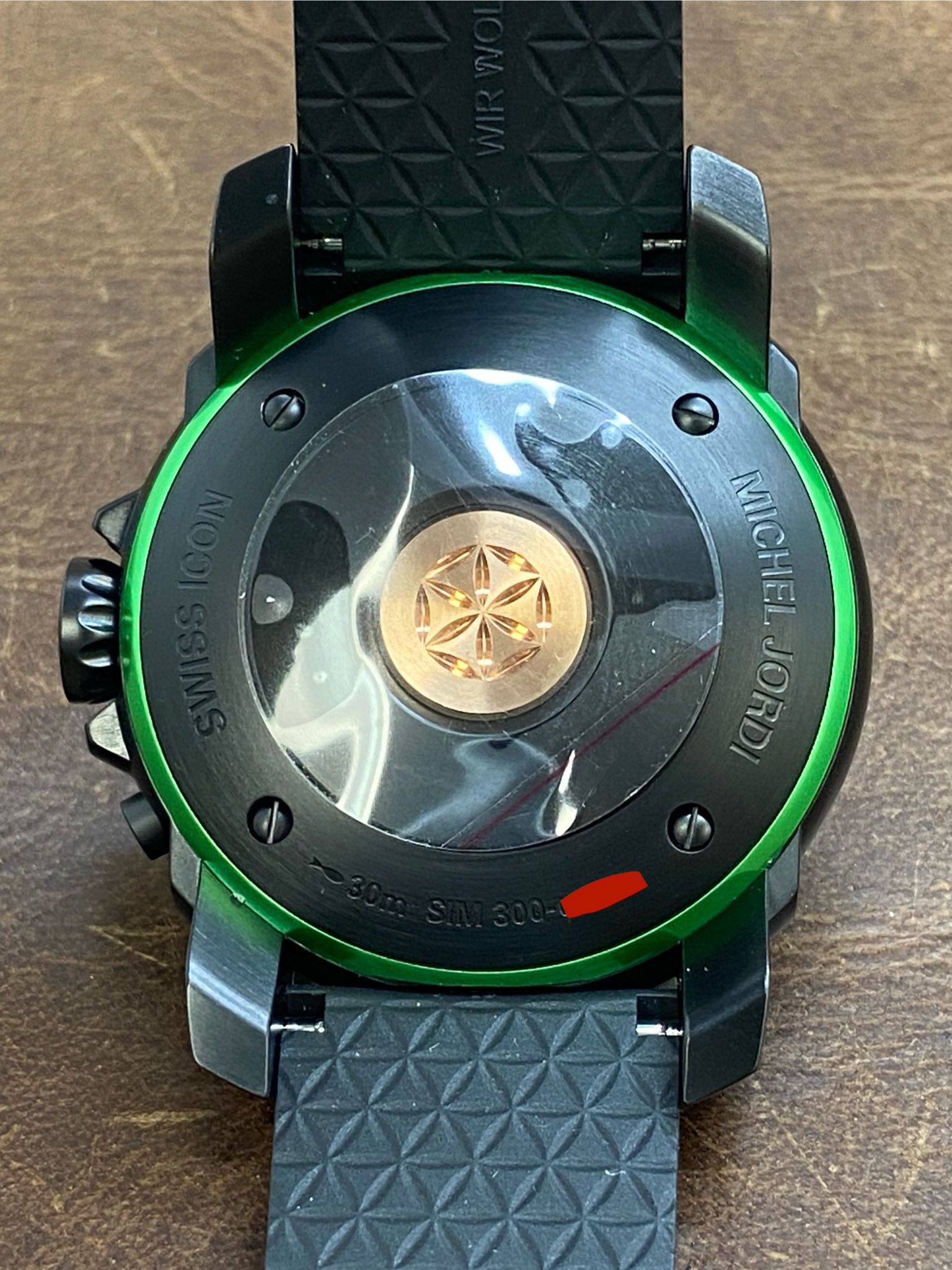 This pre-owned Michel Jordi Mega Icon Spicy Green 300.11.003.01 is in unworn condition and comes with: original Michel Jordi double box & warranty card.