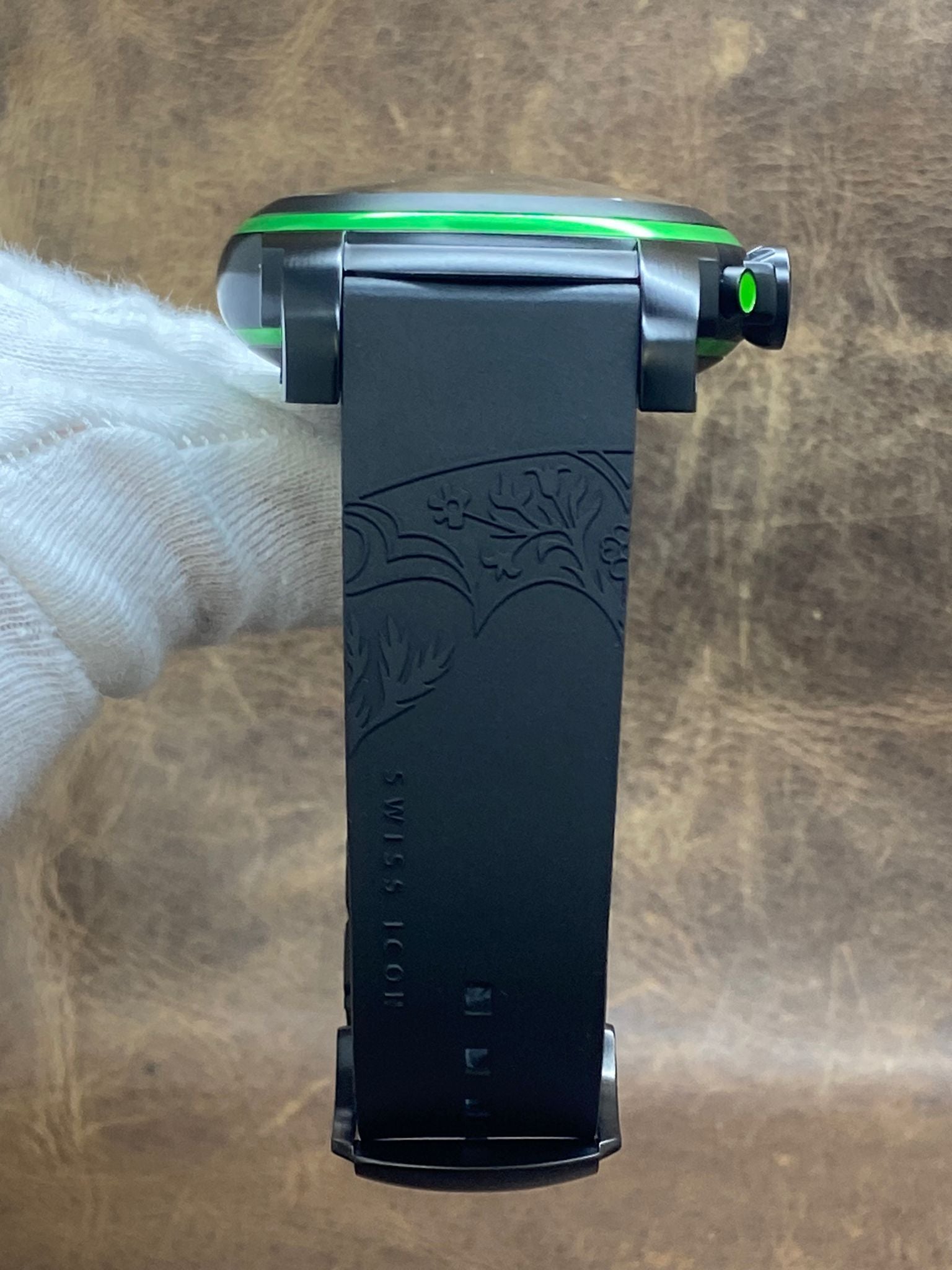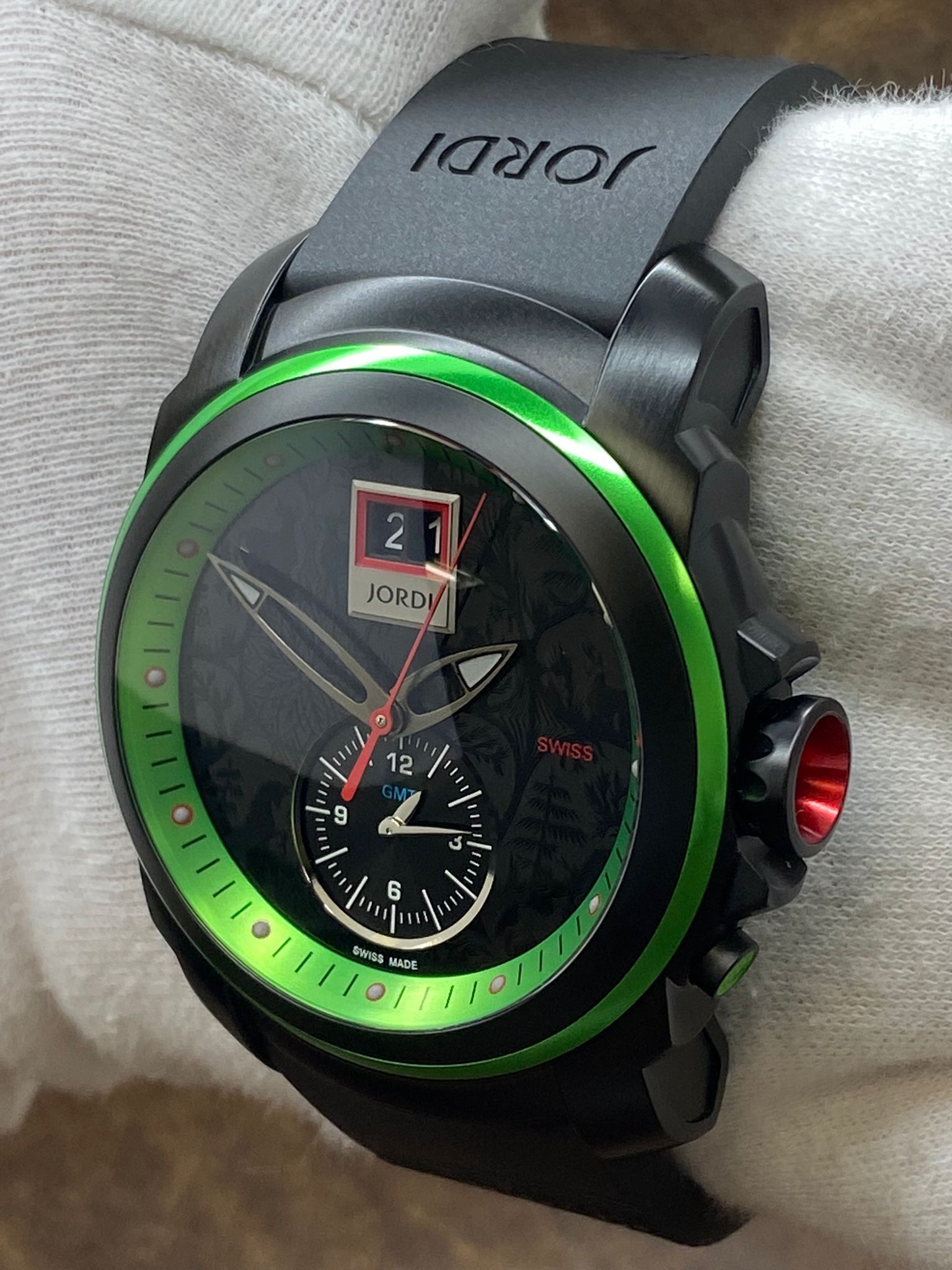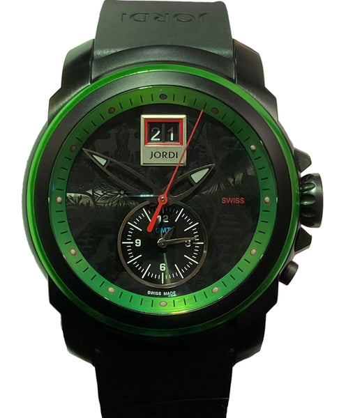 Pvd-coated stainless steel case with a rubber strap. Fixed stainless steel pvd coated bezel. Black & green dial with silver-tone skeleton hands and dot hour markers. Dial type: analog. Quartz movement with about of power reserve. Scratch resistant sapphire crystal. Push/pull crown. Solid case back. Case size: 45 mm. Case thickness: 19 mm. Round case shape. Band width: 20 mm. Buckle clasp. Water resistant at 30m. Functions: hours, minutes, seconds, date, gmt. Michel Jordi Mega Icon Spicy Green 300.11.003.01 Black & Green Dial Quartz Men's Watch.