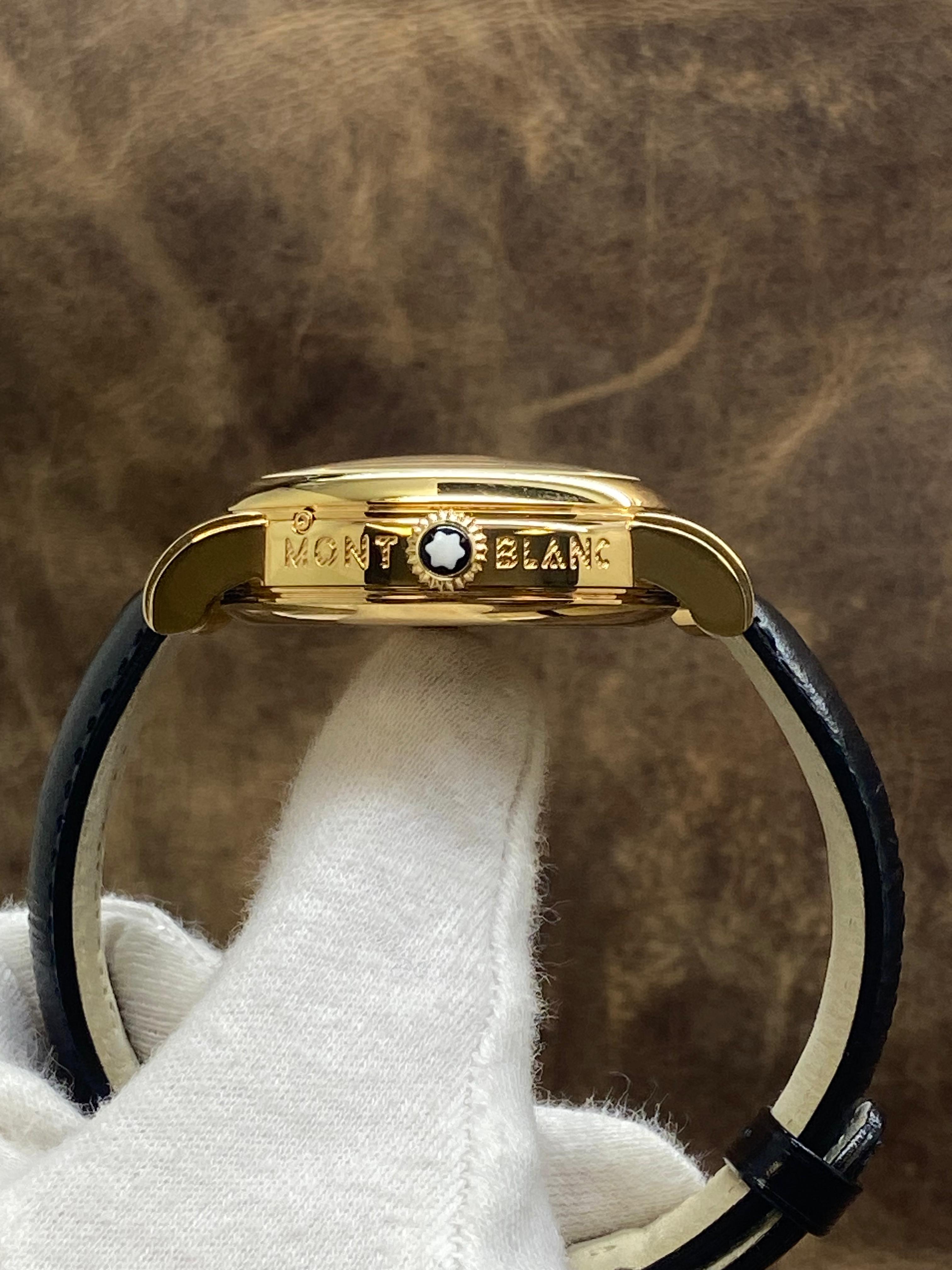 Gold plated stainless steel case with a leather strap. Smooth - fixed gold plated stainless steel bezel. White dial with luminous gold-tone hands and Arabic numerals hour markers. Dial type: analog. Montblanc caliber 4810.601 automatic movement with about 40 hours of power reserve. Scratch resistant sapphire crystal. Pull/push crown. Solid case back. Case size: 38 mm. Case thickness: 13 mm. Round case shape. Band width: mm. Tang buckle clasp. Water resistant at 30 meters / 100 feet. Functions: day, date, 24 hour second time zone, hour, minute, seconds. Montblanc Meisterstuck Dual Time Day Date 7014 White Dial Automatic Men's Watch.