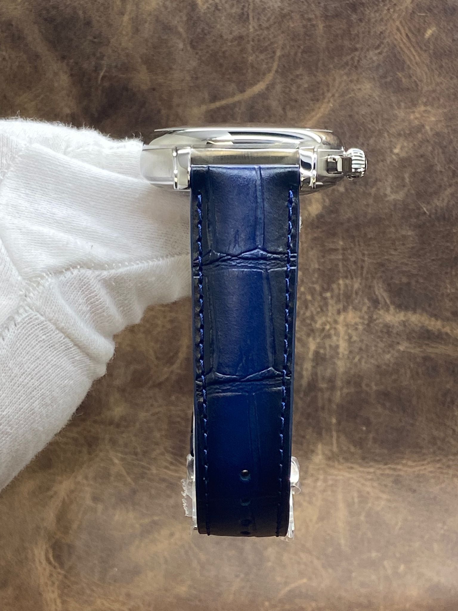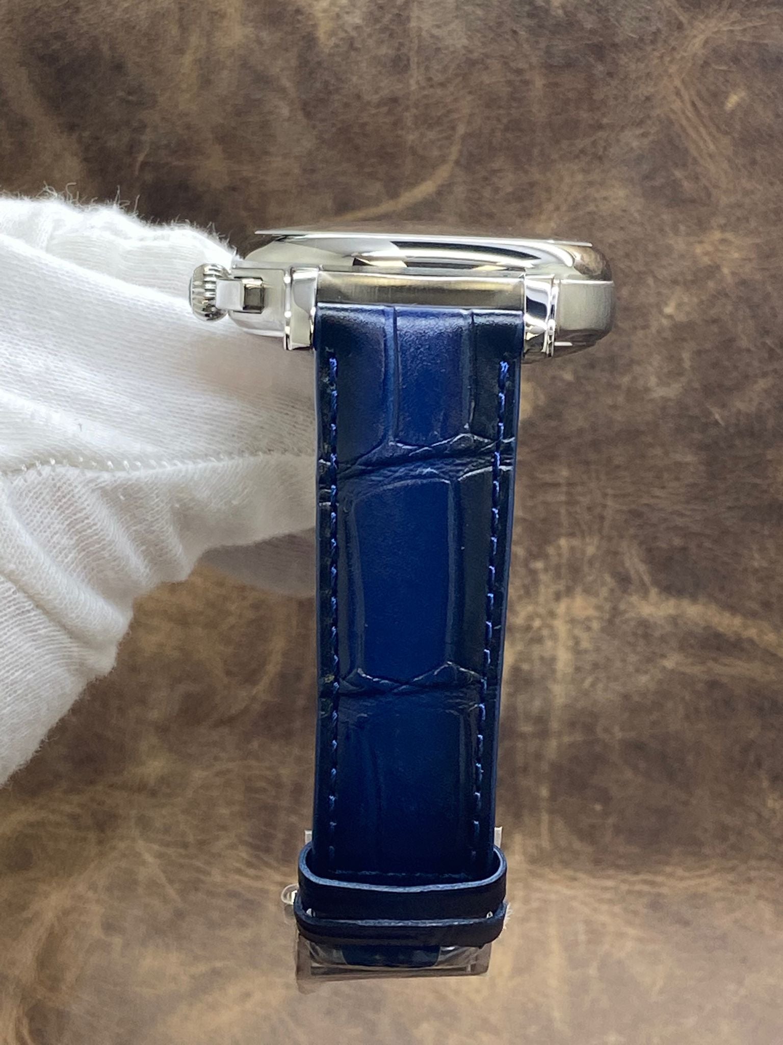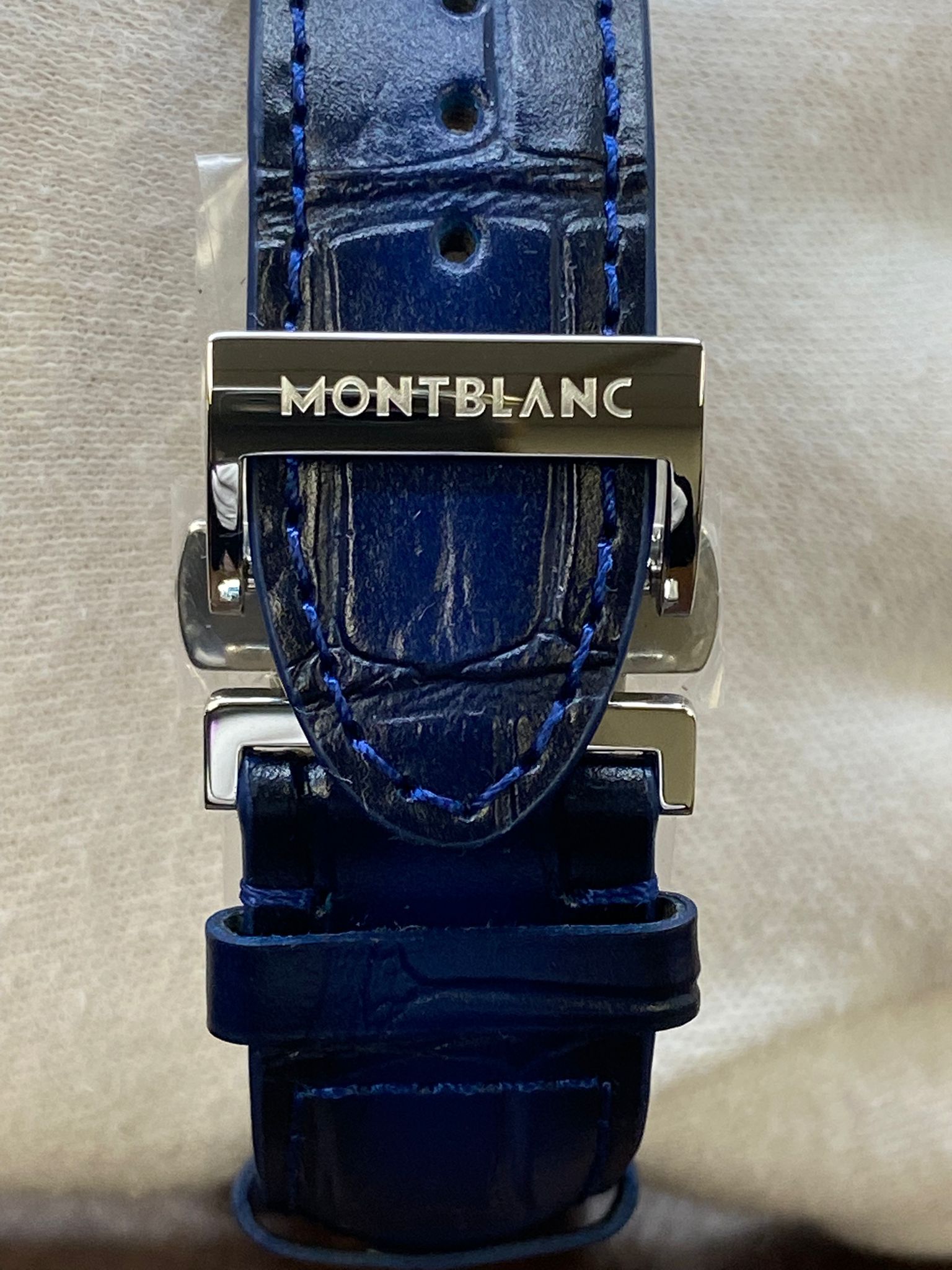 Stainless steel case with a leather strap. Smooth - fixed stainless steel bezel. Blue dial with luminous gold-tone hands and index & Roman numeral hour markers. Dial type: analog. Mb 25.07 automatic movement with about 48 hours of power reserve. Scratch-resistant, domed sapphire crystal with anti-reflective coating crystal. Crown. Exhibition case back. Case size: 43 mm. Case thickness: 14.76 mm. Round case shape. Band width: mm. Fold over clasp. Water resistant at 50 meters / 165 feet. Functions: chronograph, day, date, hour, minute, seconds. Montblanc Star Legacy Chronograph Day & Date L.E 800pcs 130973 Blue Dial Automatic Men's Watch.