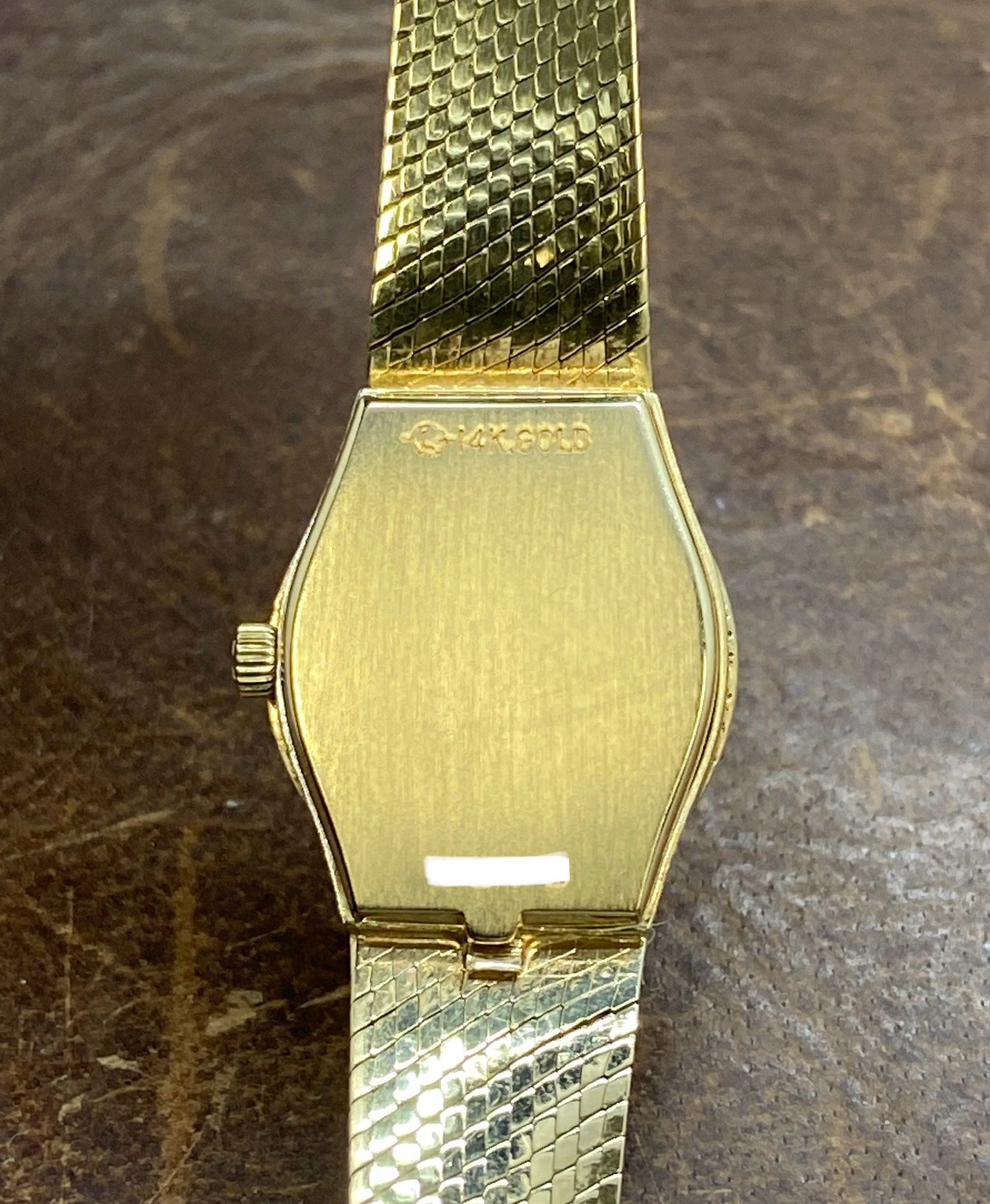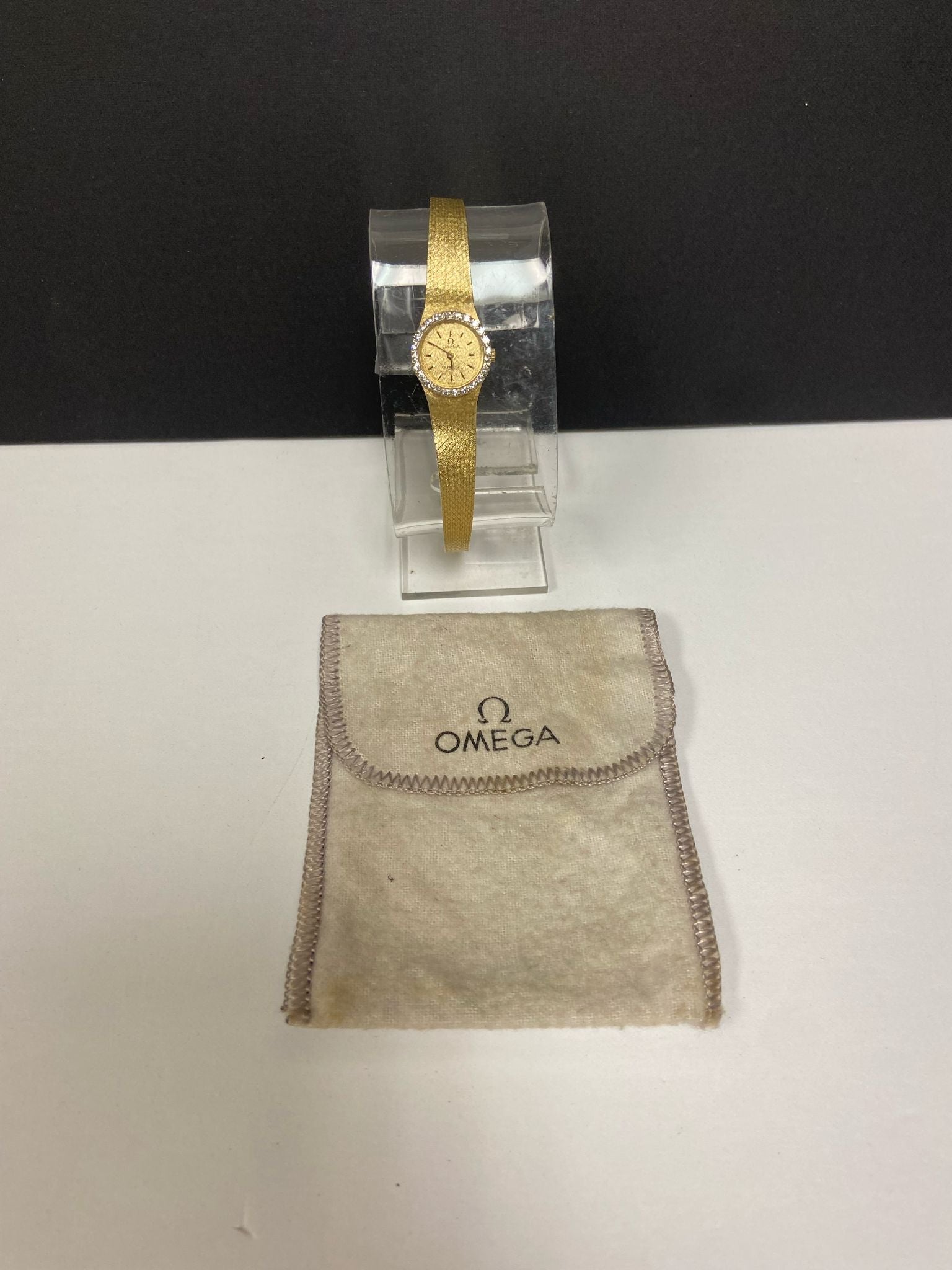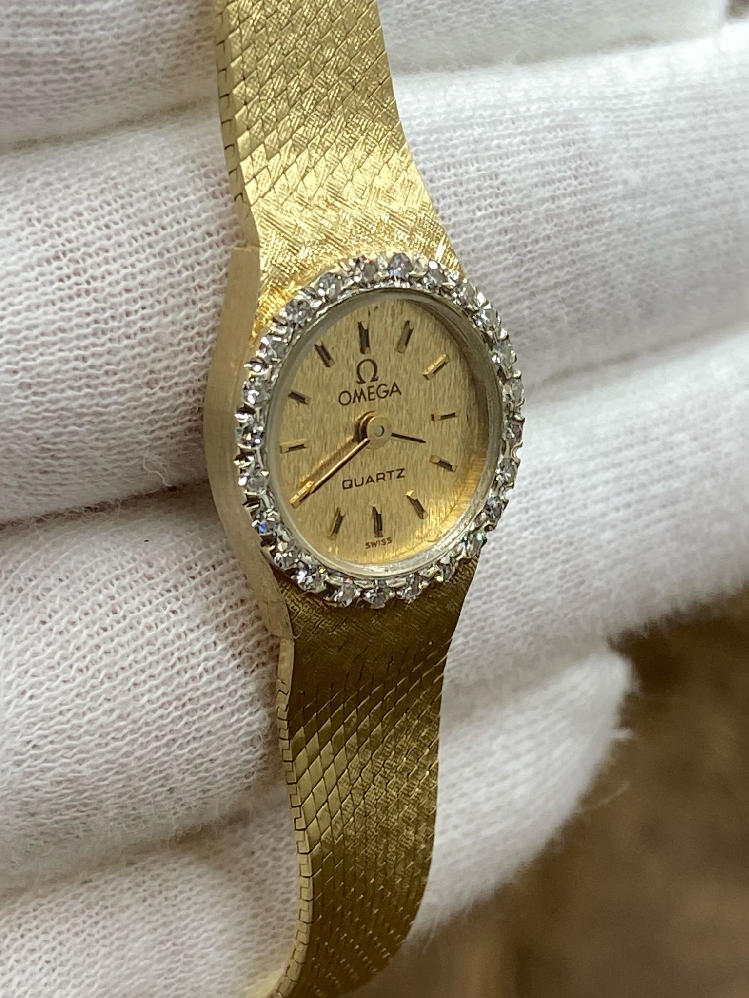 14k yellow gold case with a 14k gold bracelet. Fixed 14k gold with diamonds bezel. Champagne dial with gold-tone hands and index hour markers. Dial type: analog. Quartz movement with about of power reserve. Crystal. Pull/push crown. Solid case back. Case size: 16 mm. Case thickness: mm. Round case shape. Band width: mm. Jewelry clasp clasp. Water resistant at not waterproof. Functions: hour, minutes. Omega 16mm Solid 14k Yellow Gold Champagne Dial Quartz Women's Watch.