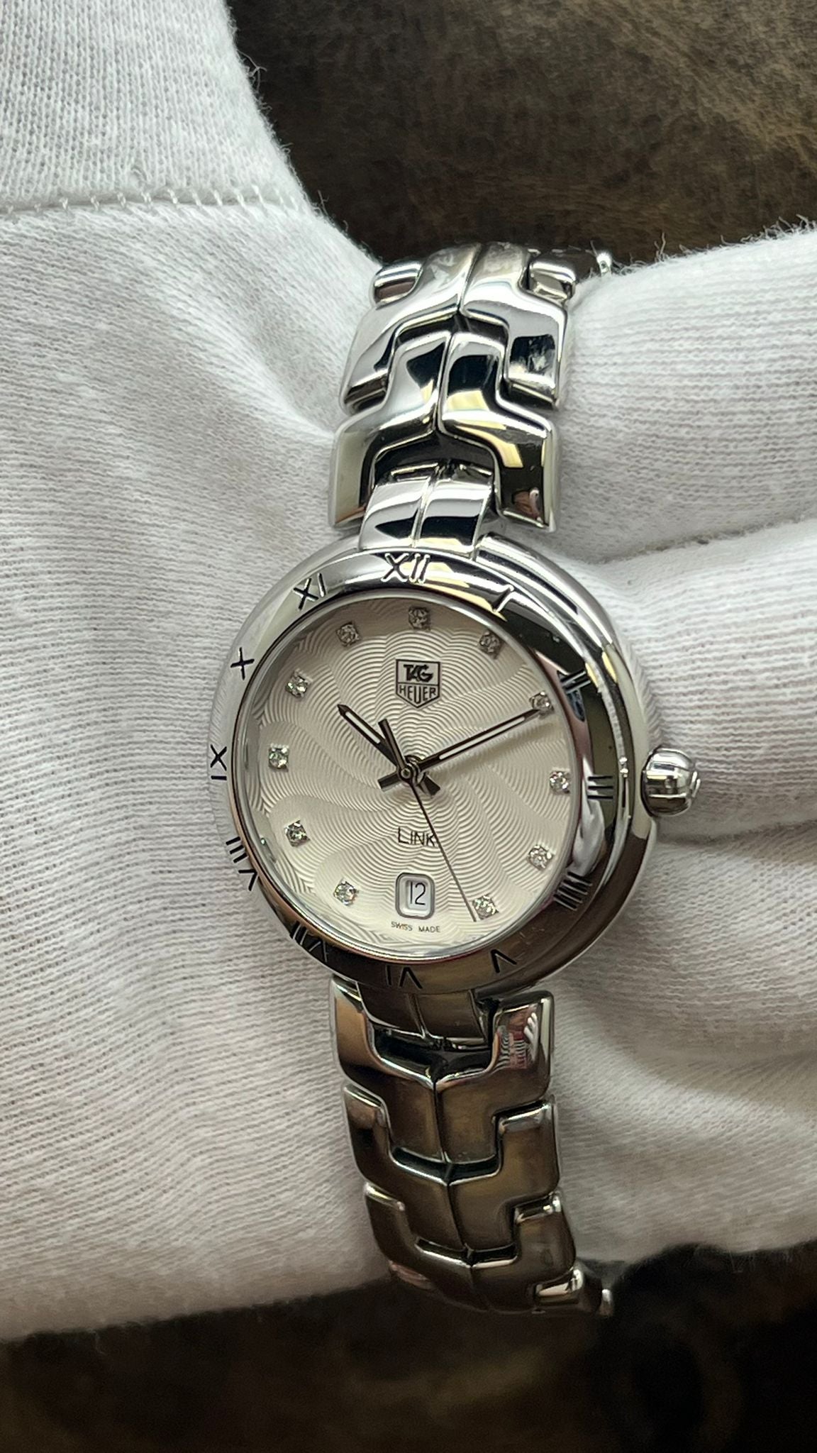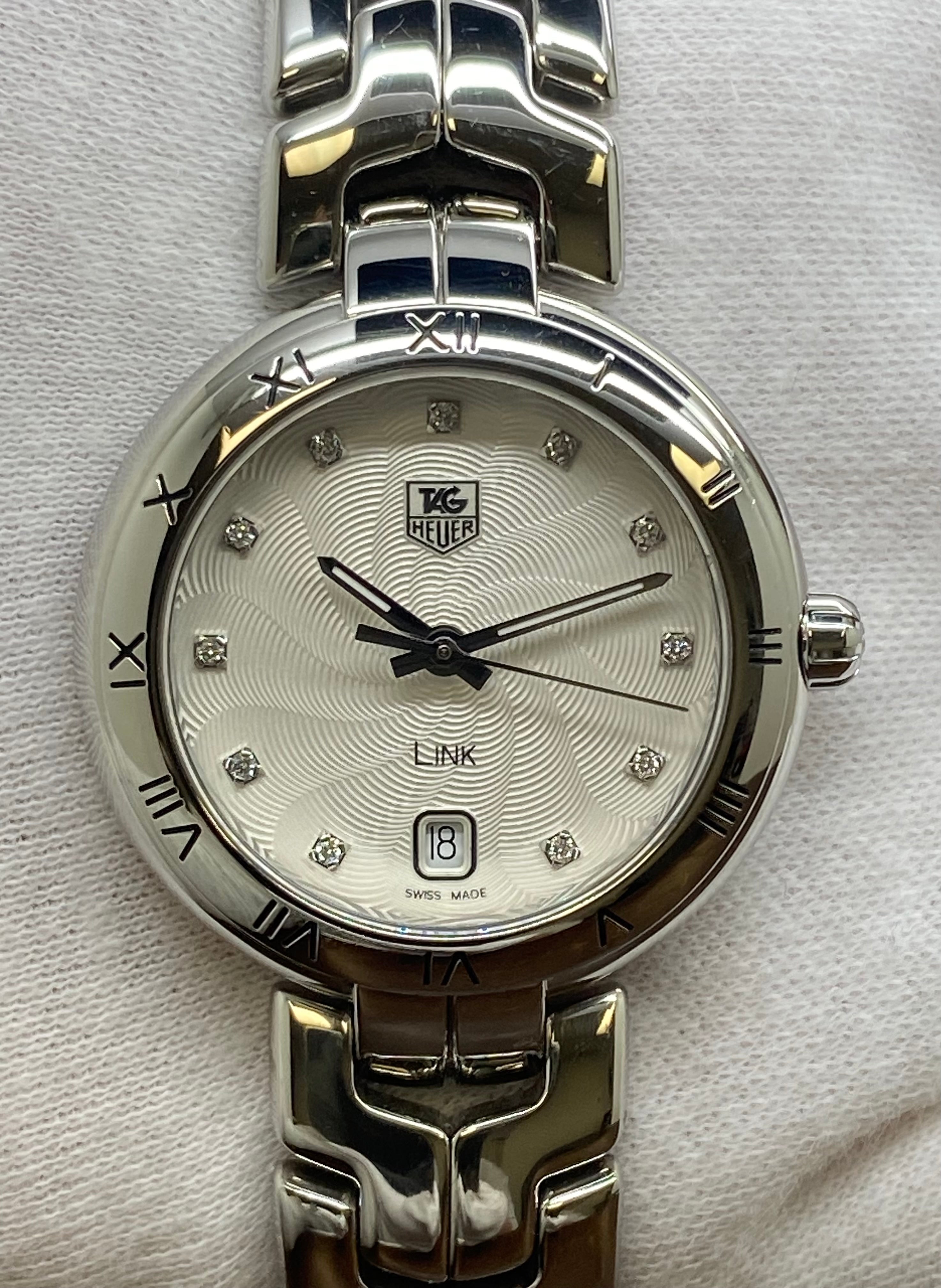 Polished stainless steel case with a polished stainless steel bracelet. Fixed stainless steel bezel. Silver guilloche dial with silver-tone hands and diamond hour markers. Dial type: analog. Luminescent hands. Quartz movement with about of power reserve. Scratch resistant sapphire crystal. Screw down crown. Solid case back. Case size: 34.5 mm. Case thickness: 9.6 mm. Round case shape. Band width: 16 mm. Deployment w/ push button release clasp. Water resistant at 100 meters / 330 feet. Functions: date, hour, minute, second. TAG Heuer Link WAT1311.BA0956 Silver Guilloche Dial Quartz Women's Watch.