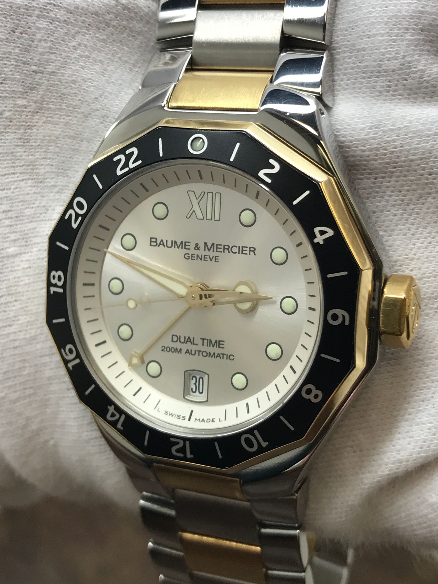 Stainless steel case with a stainless steel & gold plated bracelet. Fixed stainless steel & gold plated bezel. Silver dial with luminous gold-tone hands and luminous dot & Roman numeral 12 hour markers. Dial type: analog. Automatic movement with about of power reserve. Scratch resistant sapphire crystal. Crown. Solid case back. Case size: 40 mm. Case thickness: mm. Round case shape. Band width: mm. Hidden butterfly clasp. Water resistant at 200 meters / 660 feet. Functions: date, hour, minute, seconds, gmt, dual time zone. Baume & Mercier Riviera Dual Time 65626 Silver Dial Automatic Men's Watch.
