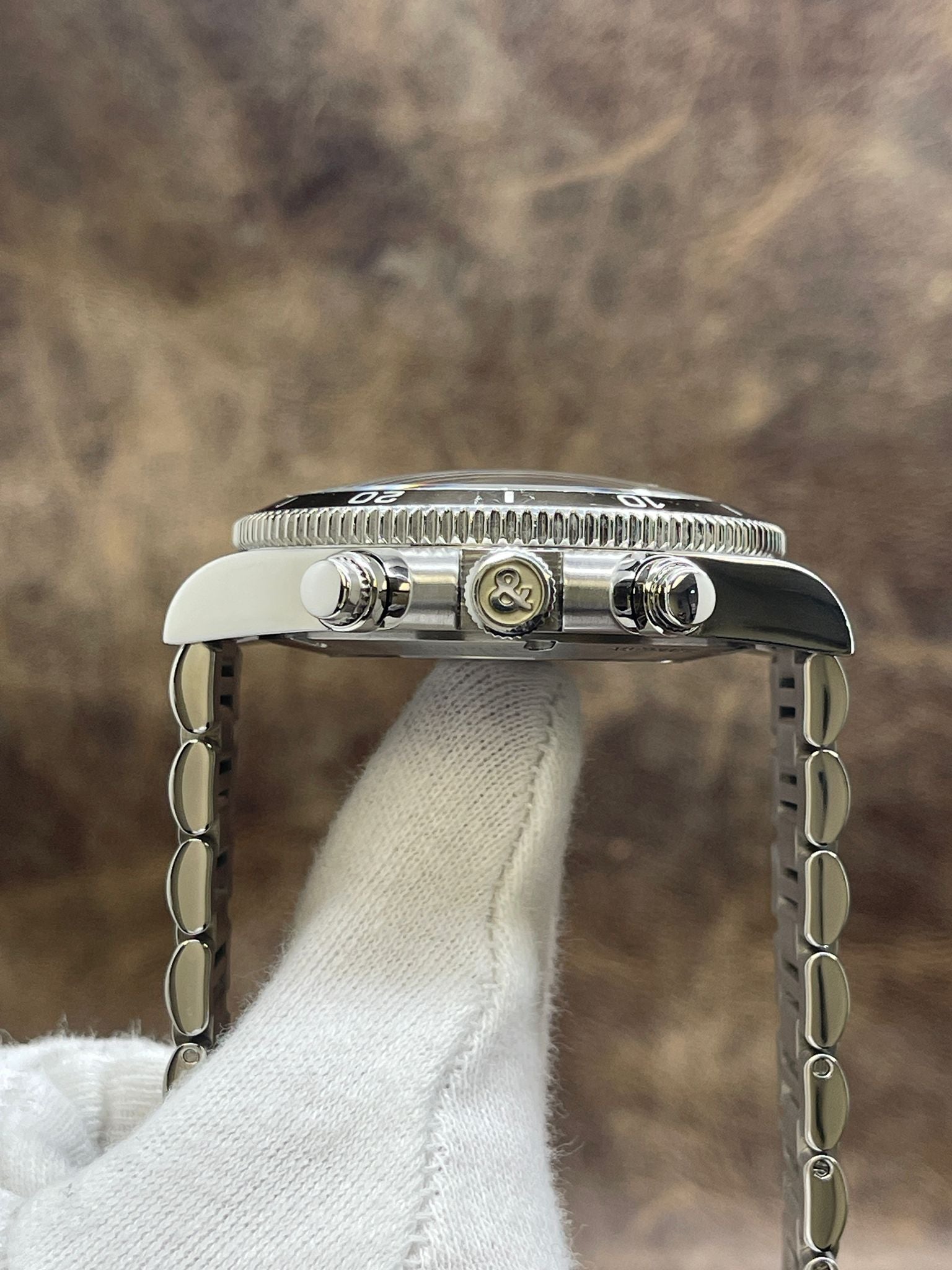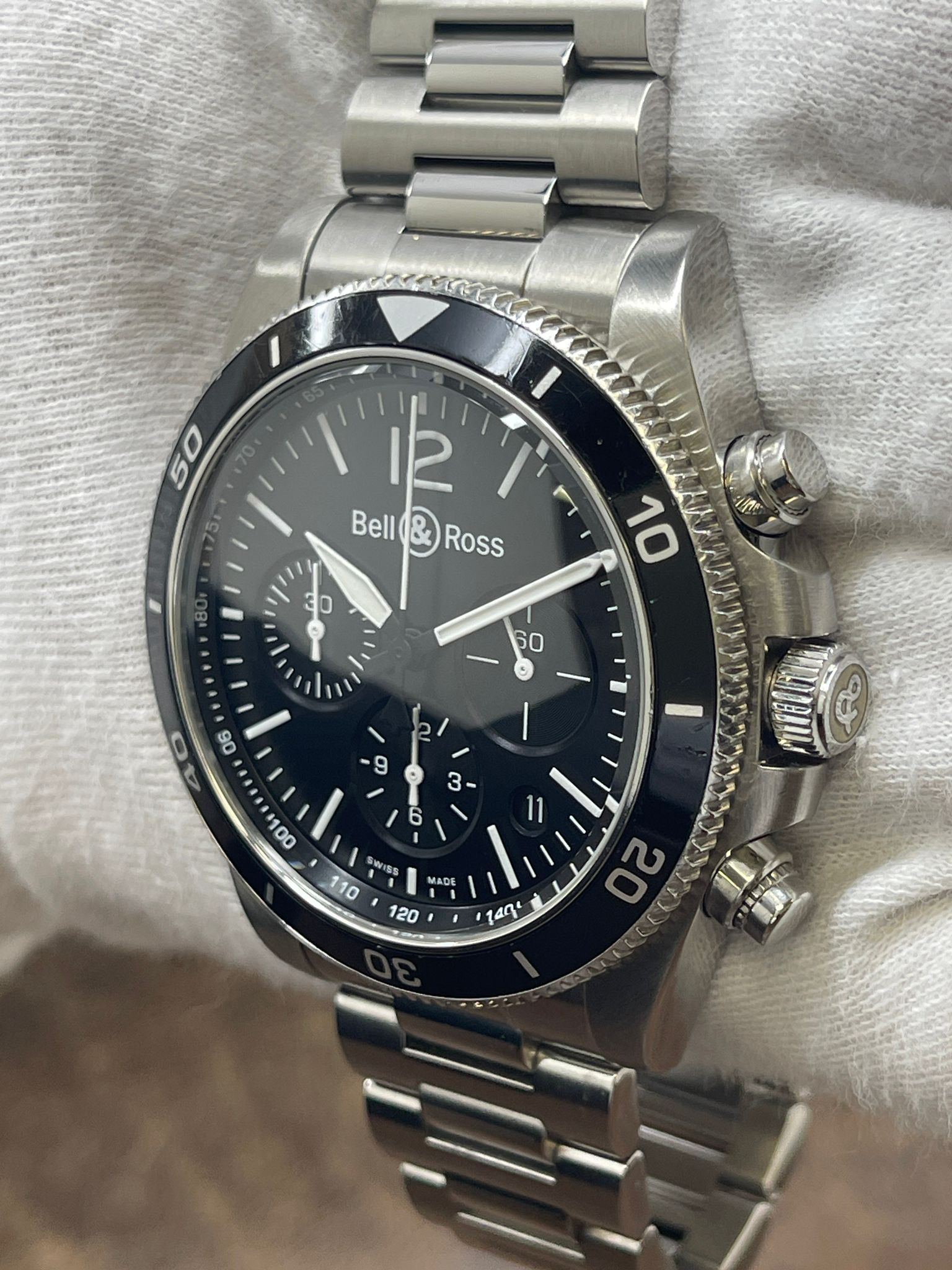 This pre-owned Bell & Ross Alpine Chronograph BRV394 is in excellent condition and comes with: original Bell & Ross double box, booklet and 3rd party warranty papers dated 2020. The black insert has scratches and tiny chips - most visible between 12-3 o'clock. Max wrist size: 8 in.