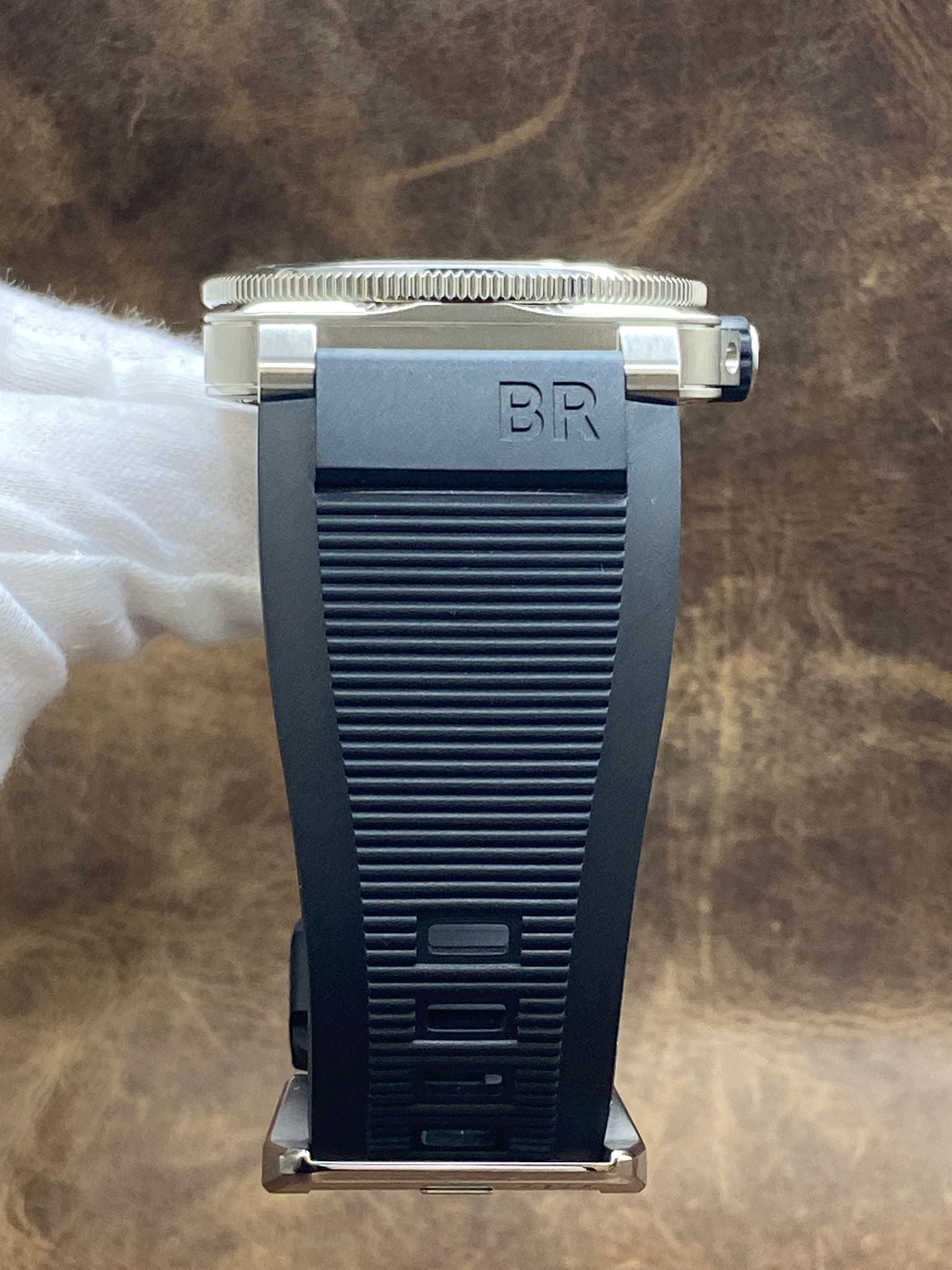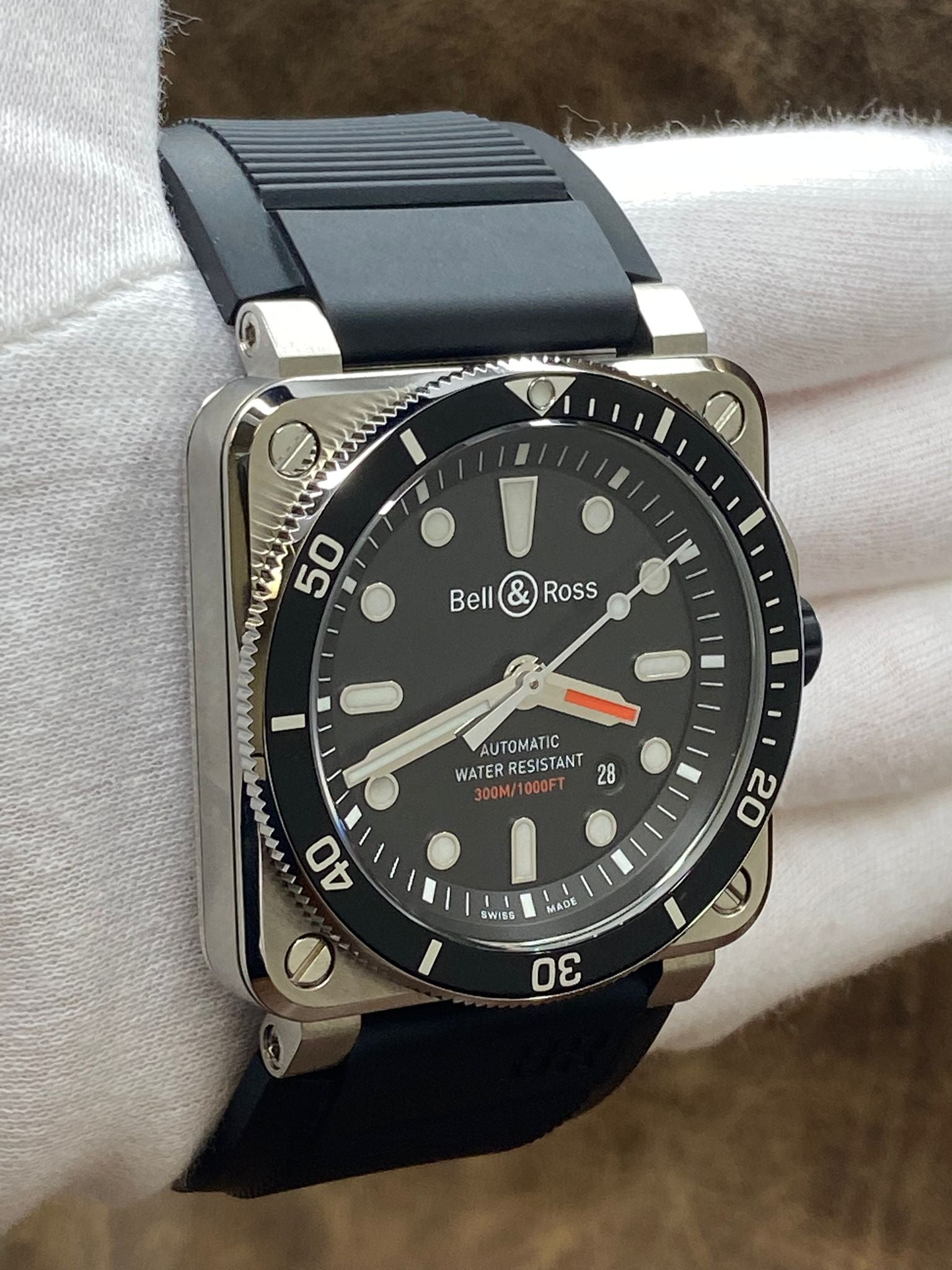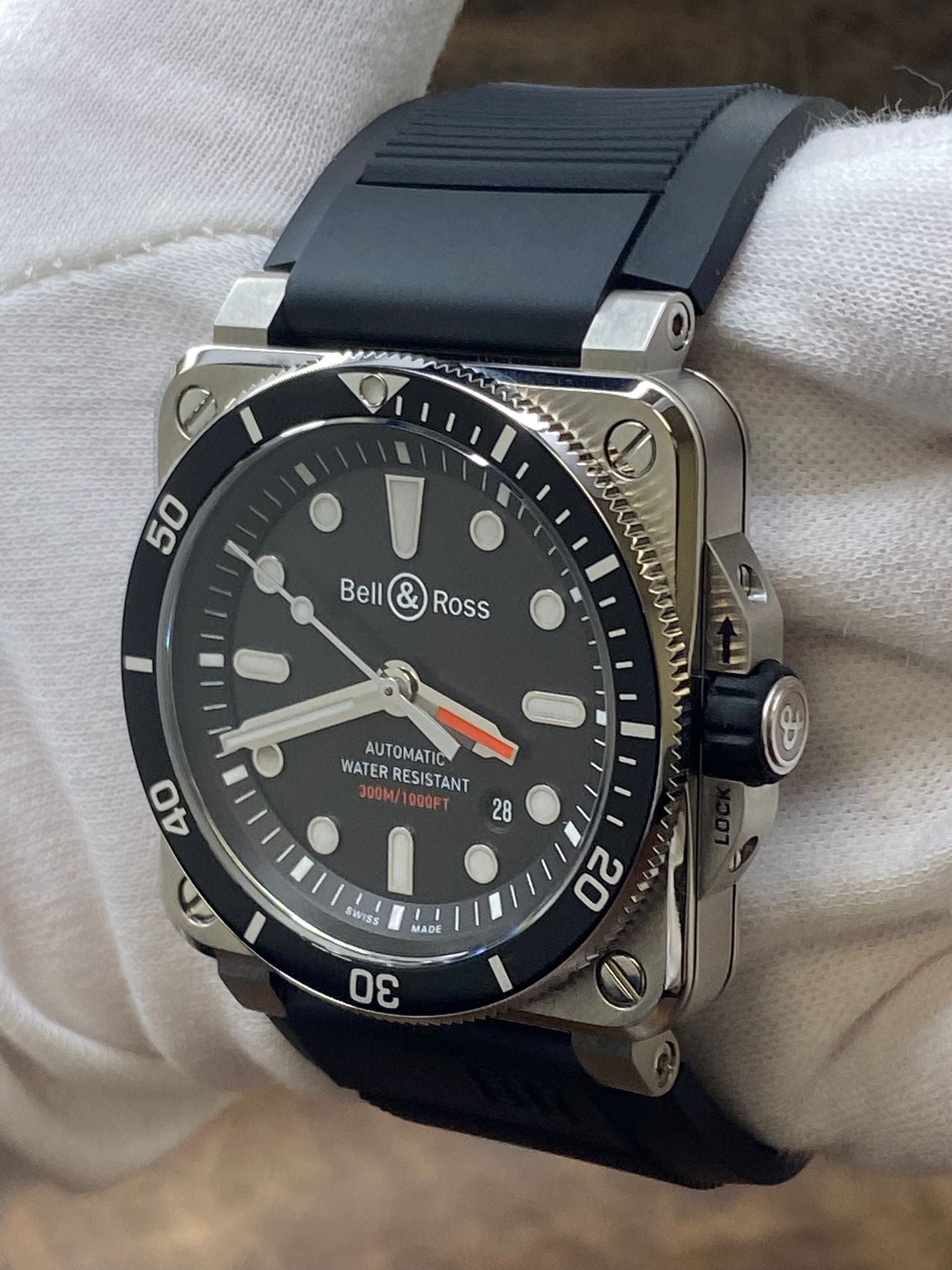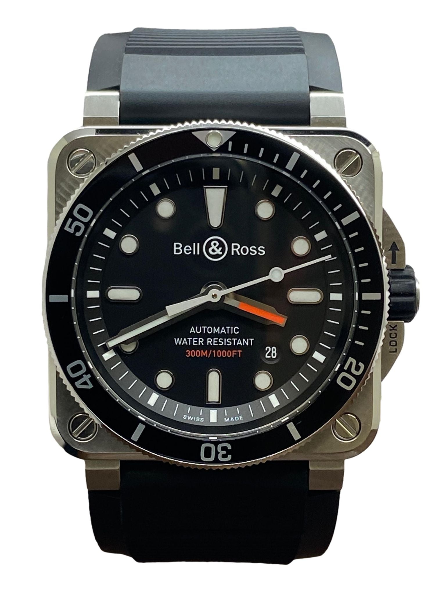Stainless steel case with a rubber strap. Uni-directional rotating stainless steel with a black anodized aluminum ring bezel. Black dial with luminous silver-tone hands and luminous dot & index hour markers. Dial type: analog. Calibre br-cal.302 automatic movement with about 40 hours of power reserve. Sapphire with anti-reflective coating crystal. Pull/push crown. Solid case back. Case size: 42 mm. Case thickness: 12.05 mm. Square case shape. Band width: mm. Tang clasp. Water resistant at 300 meters / 1000 feet. Functions: date, hour, minute, second. Bell & Ross BR03-92 Diver BR03-92-Diver Black Dial Automatic Men's Watch.