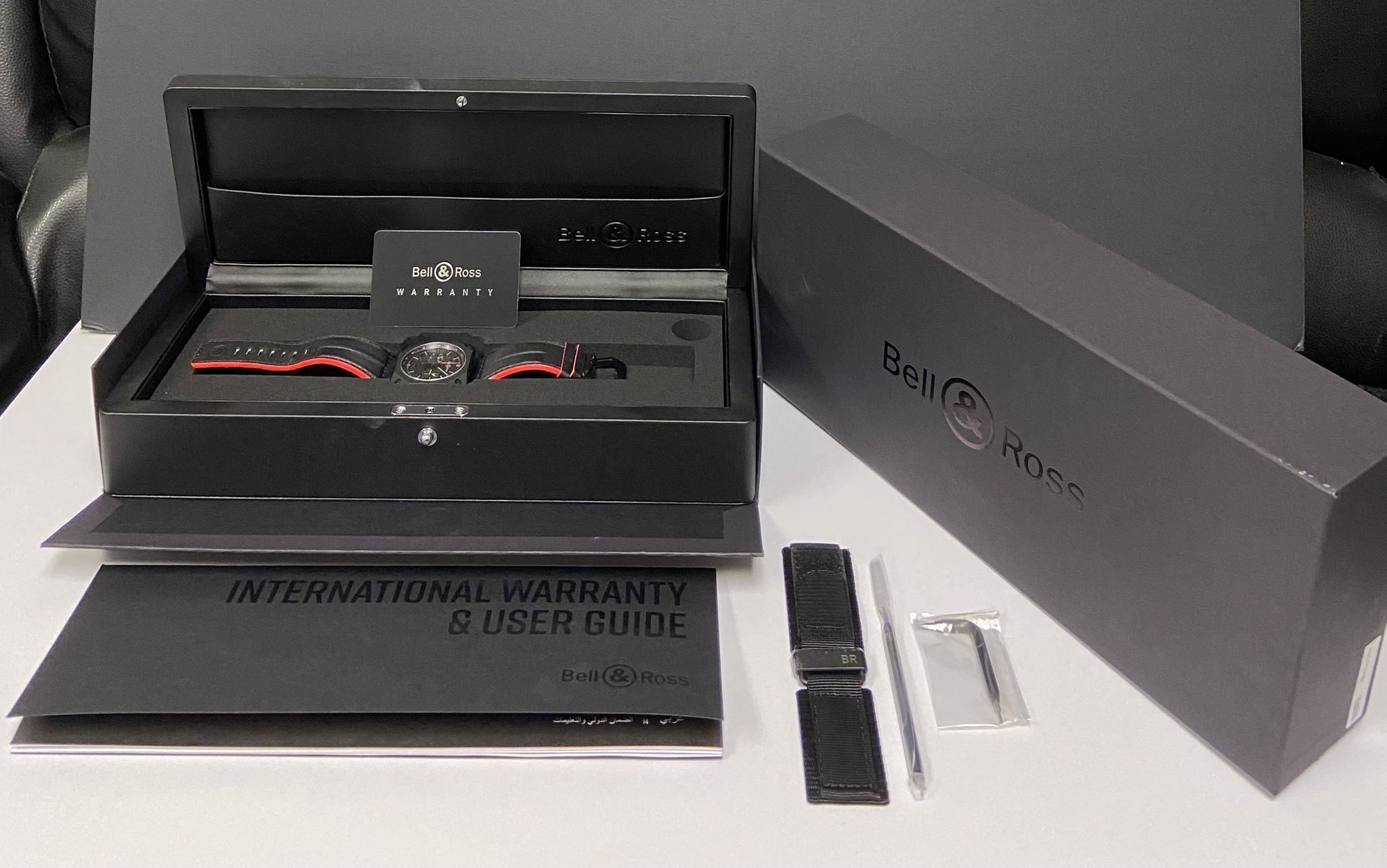 • Checkmark original Bell & Ross double box, booklet, tools, extra strap and matching warranty card dated Dec 2023 with valid factory warranty until Dec 2025