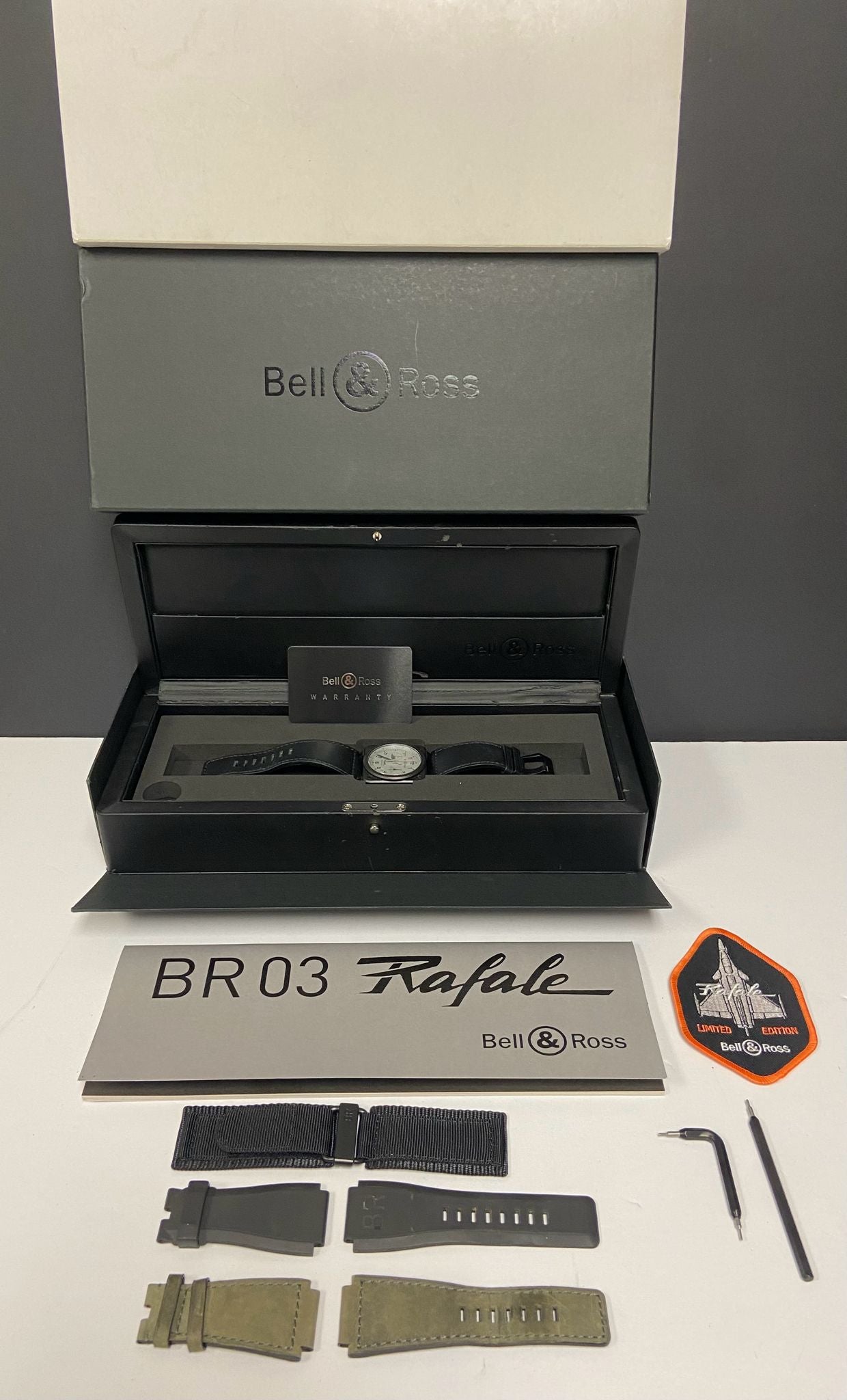 - original Bell & Ross double box,booklets, tools, patch, 3 extra strap and matching warranty card dated 2016