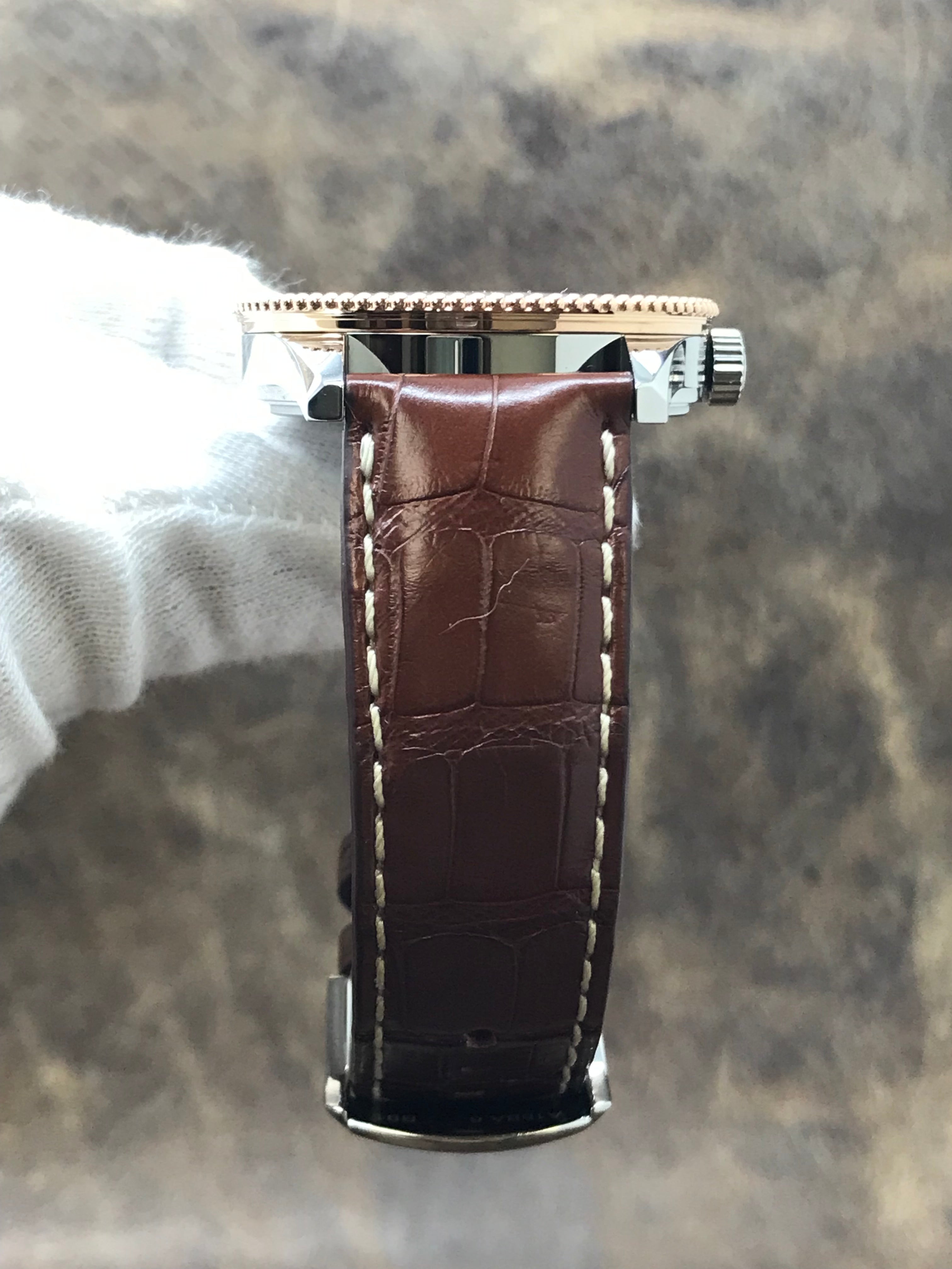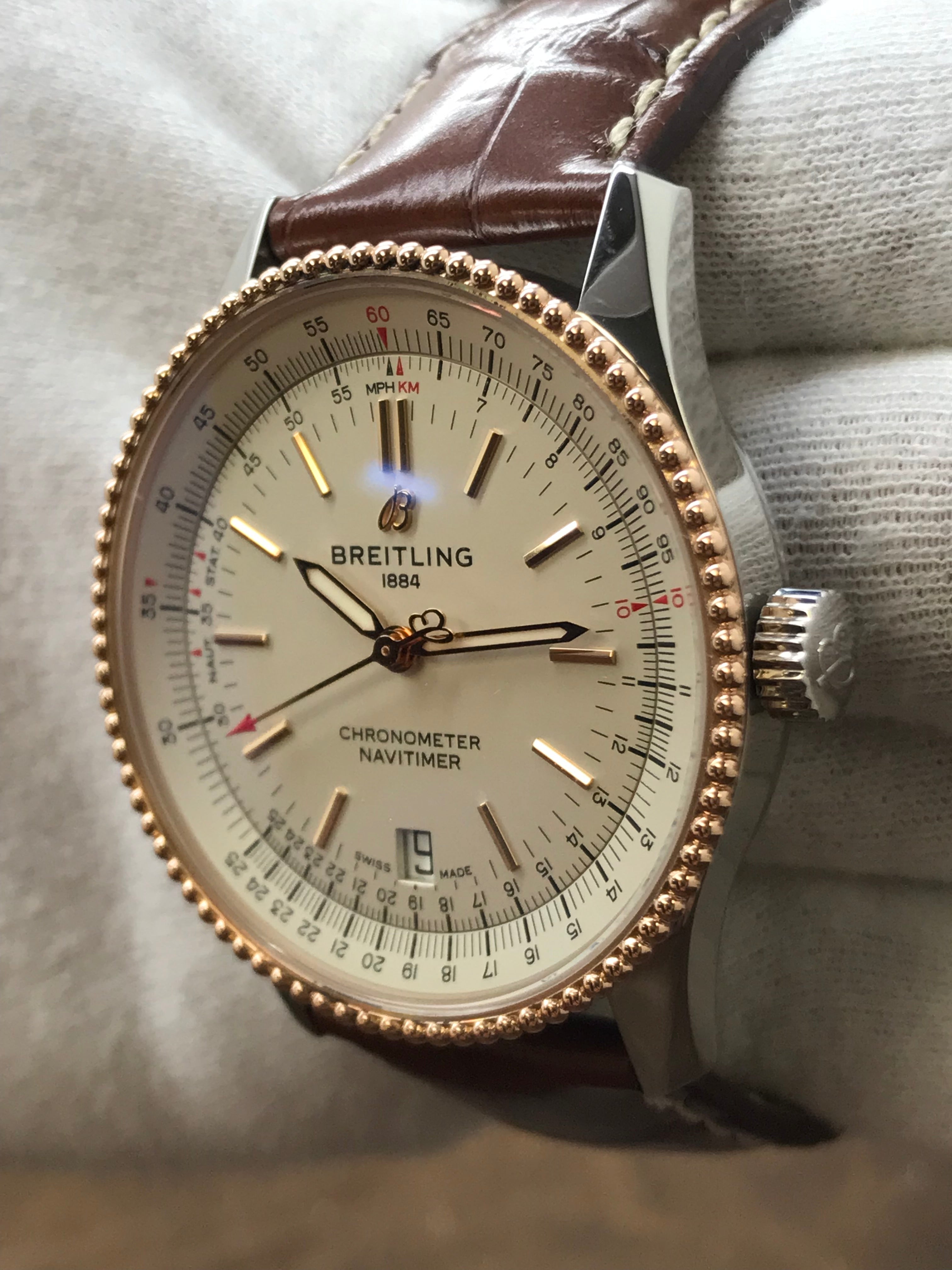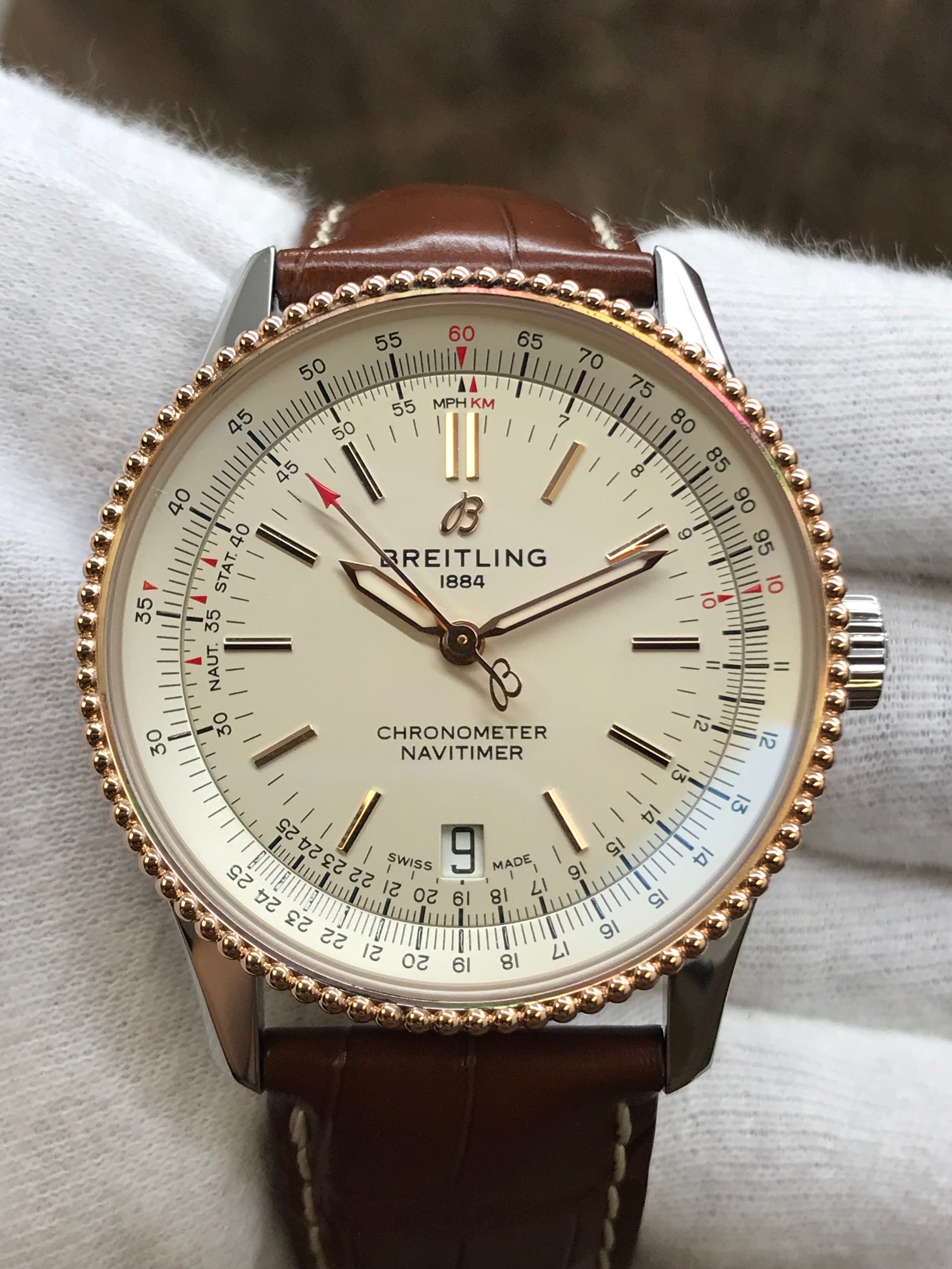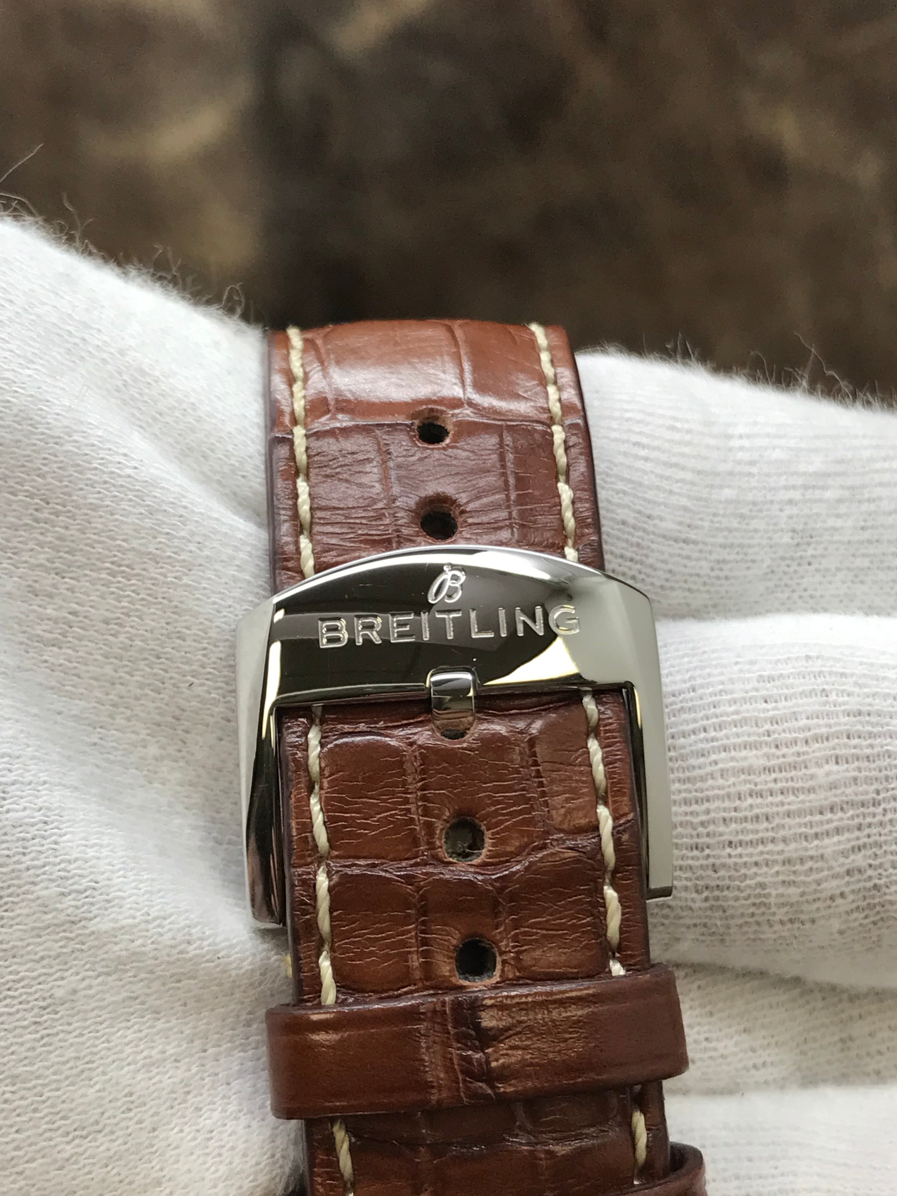 Stainless steel case with a leather strap. Bi-directional rotating slide rule 18k rose gold bezel. White dial with luminous gold-tone hands and index hour markers. Dial type: analog. Breitling calibre 17 automatic movement with about 38 of power reserve. Scratch resistant sapphire crystal. Pull/push crown. Solid case back. Case size: 38 mm. Case thickness: 10.10 mm. Round case shape. Band width: mm. Steel tang clasp. Water resistant at 30 meters / 100 feet. Functions: date, hour, minute, second, chronometer. Breitling Navitimer U17325 White Dial Automatic Men's Watch.