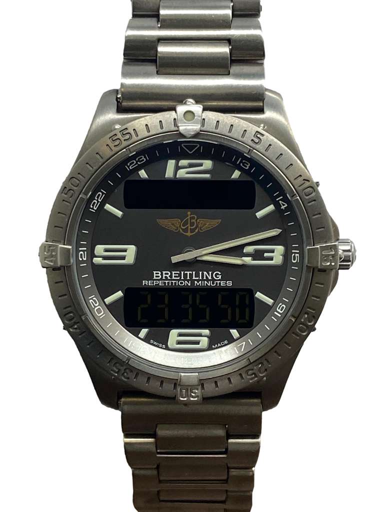 Titanium case with a stainless steel bracelet. Uni-directional rotating titanium bezel. Black dial with luminous silver-tone hands and index & 3, 6, 9, 12 Arabic numeral hour markers. Dial type: analog & digital. Breitling 65 quartz movement with about of power reserve. Scratch resistant anti-reflective sapphire crystal. Pull/push crown. Solid case back. Case size: 40 mm. Case thickness: 9 mm. Round case shape. Band width: mm. Fold over clasp. Water resistant at 100 meters / 330 feet. Functions: chronograph, timer/countdown, alarm, second time zone, perpetual calendar, minute repeater, hour, minute, seconds. Breitling Aerospace Titanium E65362 Black Dial Quartz Men's Watch.