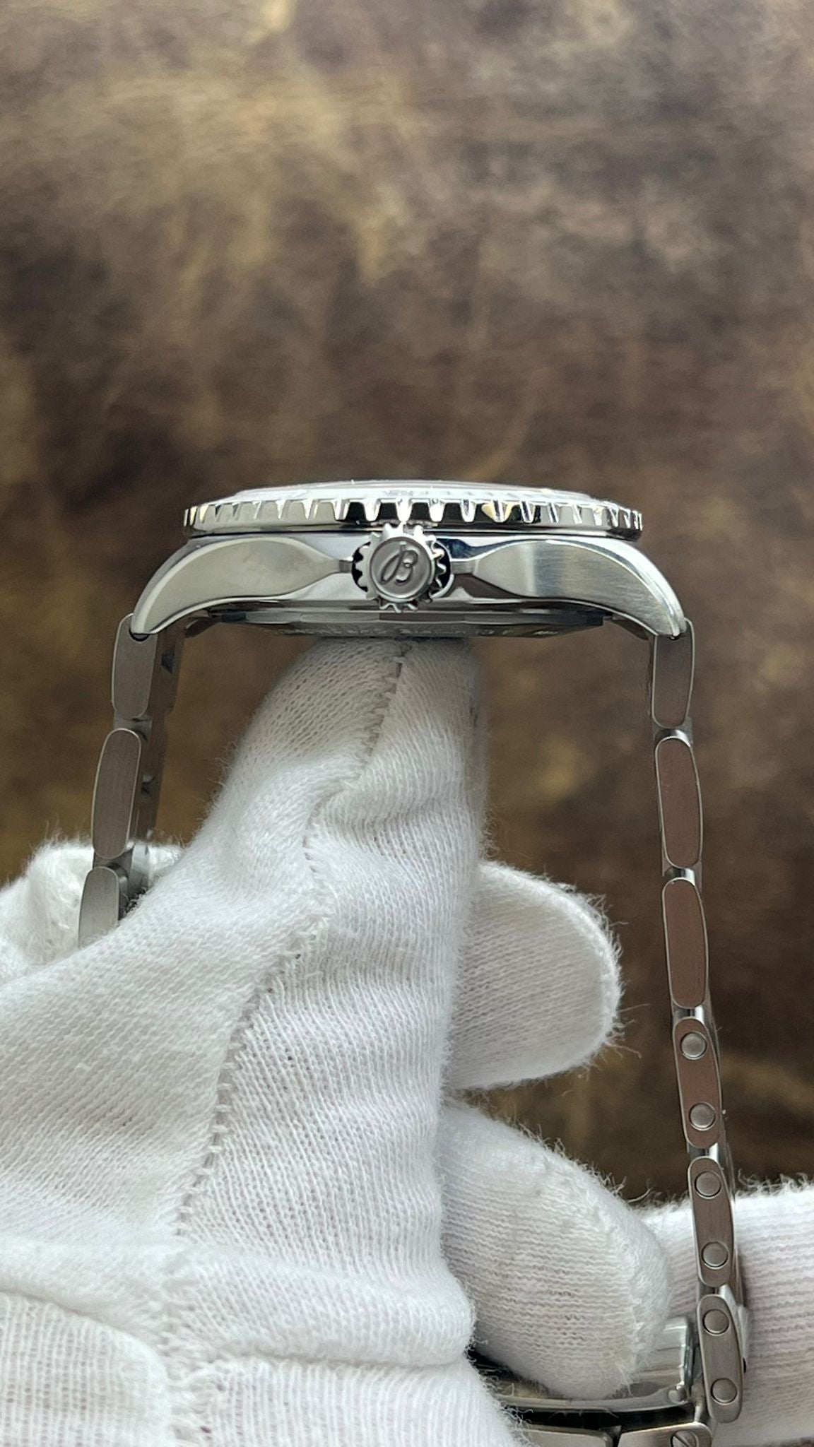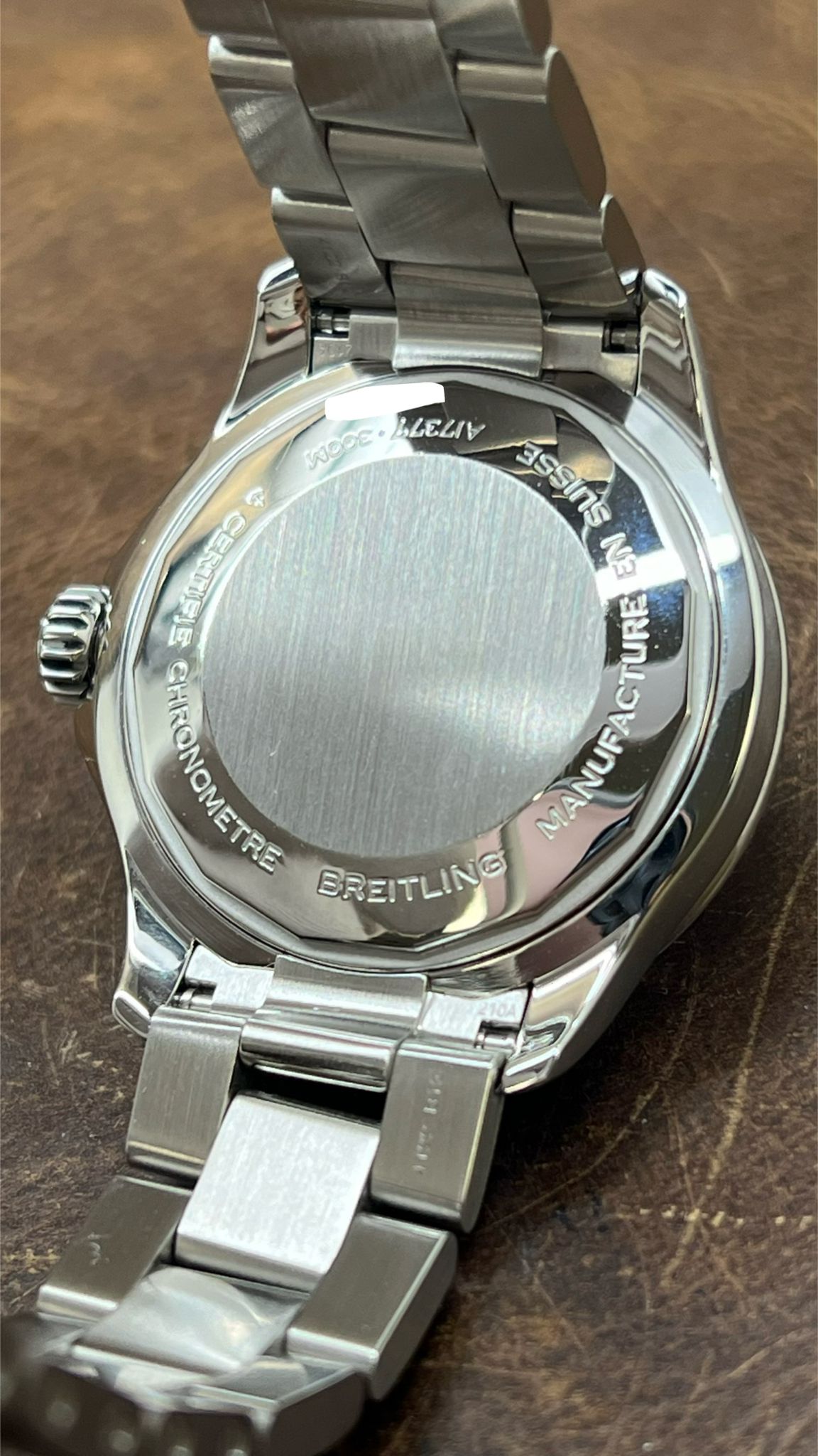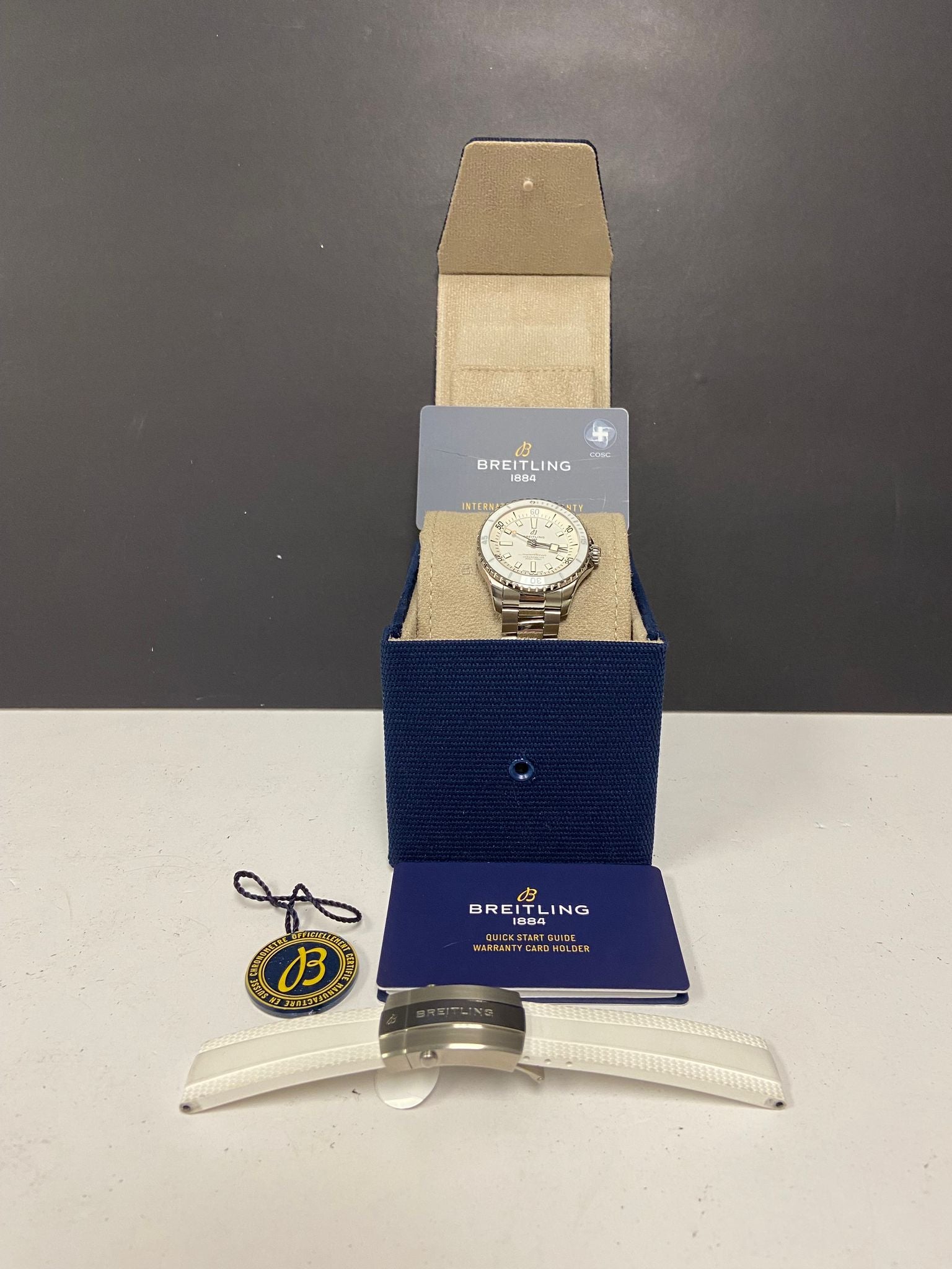 • Checkmark original Breitling box, tag, booklet, extra white rubber strap with deployment buckle and matching warranty card with valid factory warranty