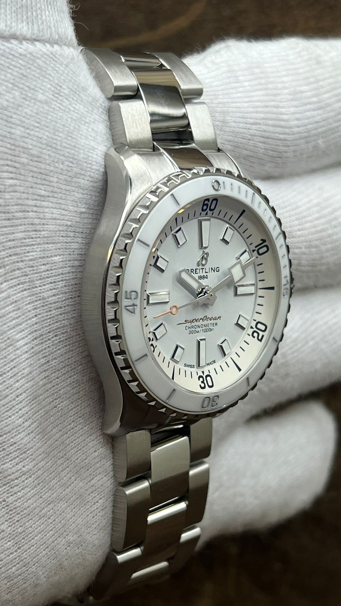 Stainless steel case with a stainless steel bracelet. Uni-directional rotating stainless steel with a ceramic top ring bezel. White dial with luminous silver-tone hands and index hour markers. Dial type: analog. Breitling 17 automatic movement with about 38 of power reserve. Cambered sapphire, glareproofed both sides crystal. Screw down crown. Solid case back. Case size: 36 mm. Case thickness: 12.2 mm. Round case shape. Band width: mm. Fold over with push button release clasp. Water resistant at 300 meters / 1000 feet. Functions: hour, minute, second, chronometer. Breitling SUPEROCEAN AUTOMATIC 36 A17377211A1S1 White Dial Automatic Watch.