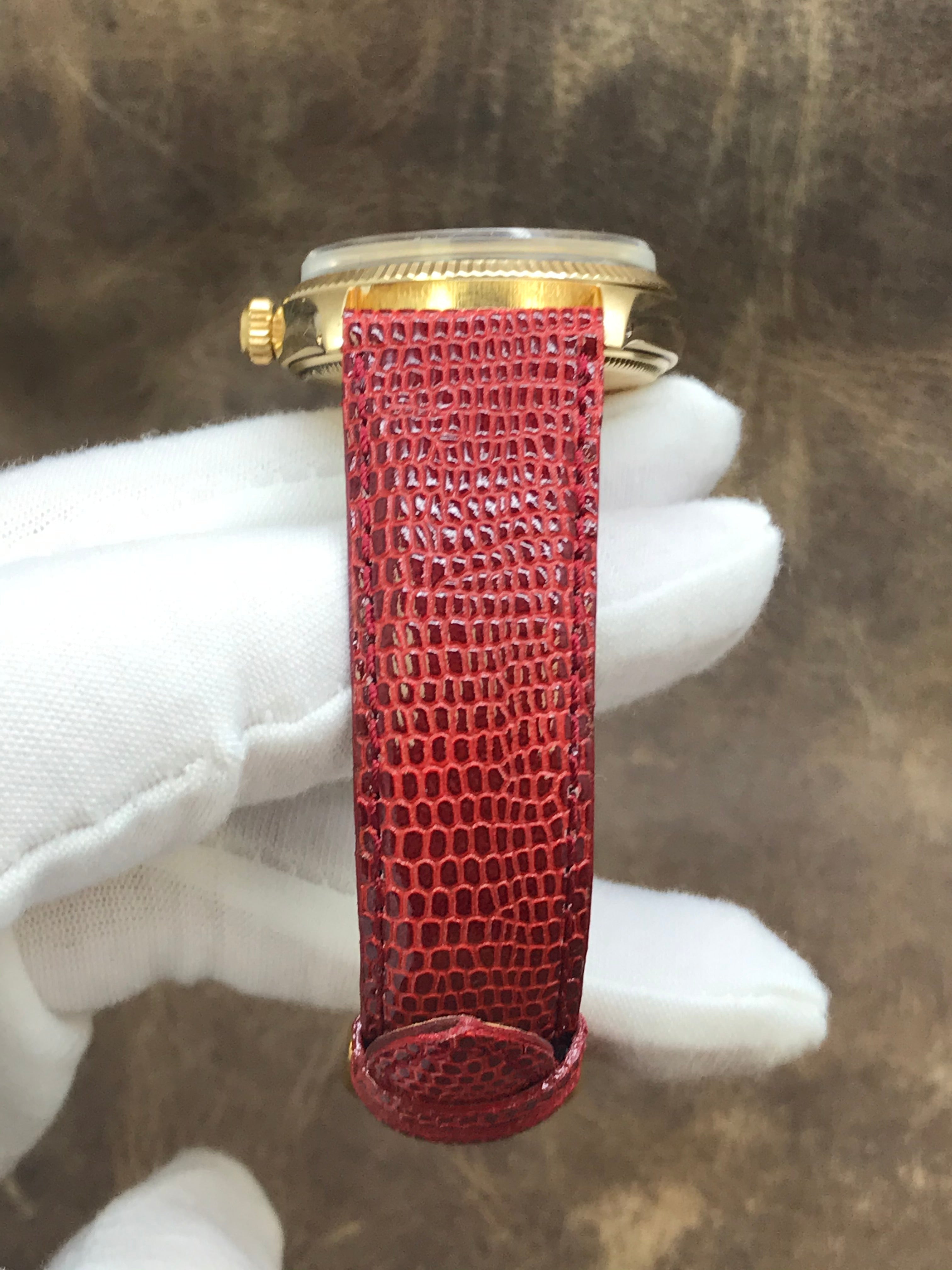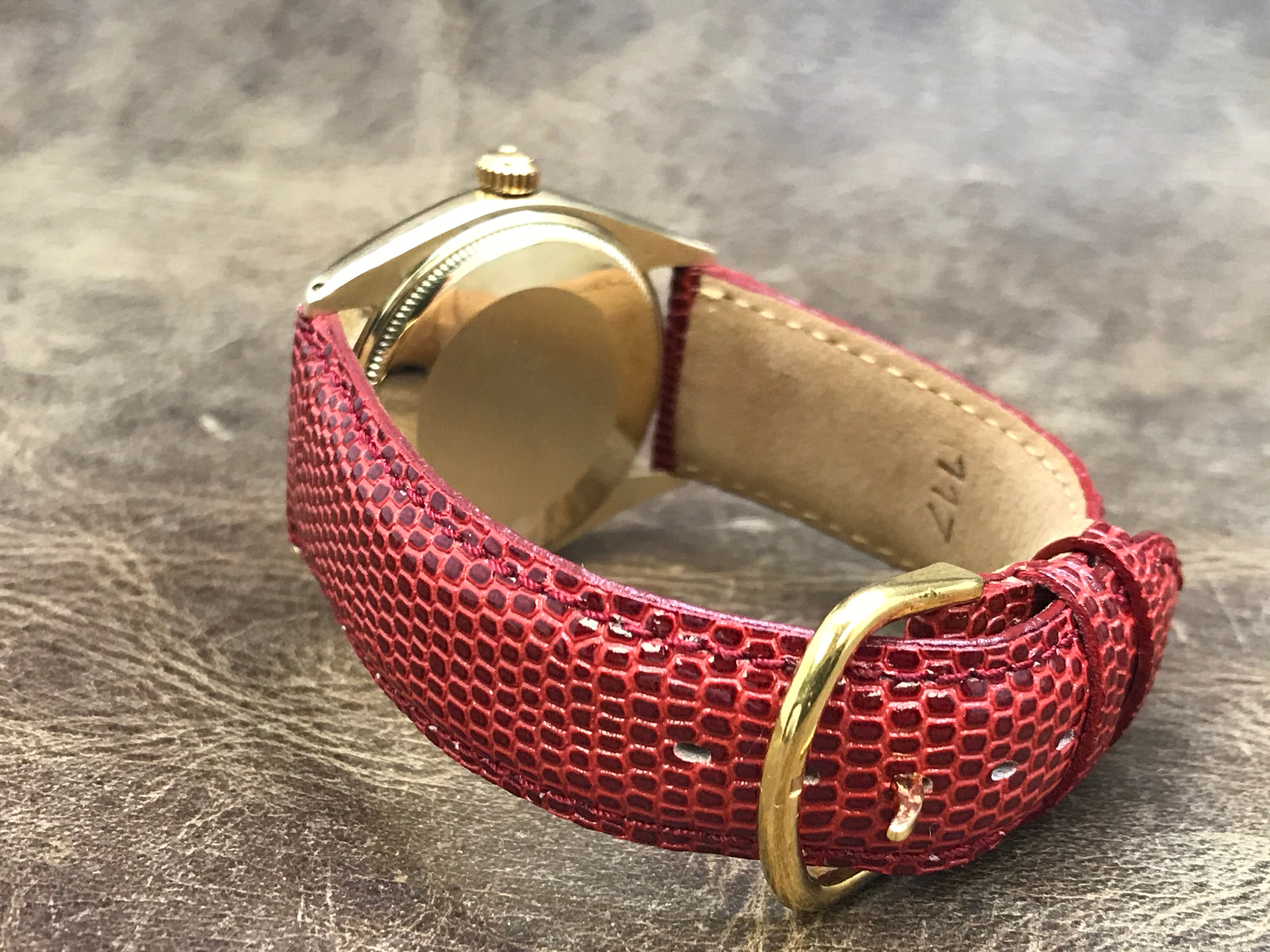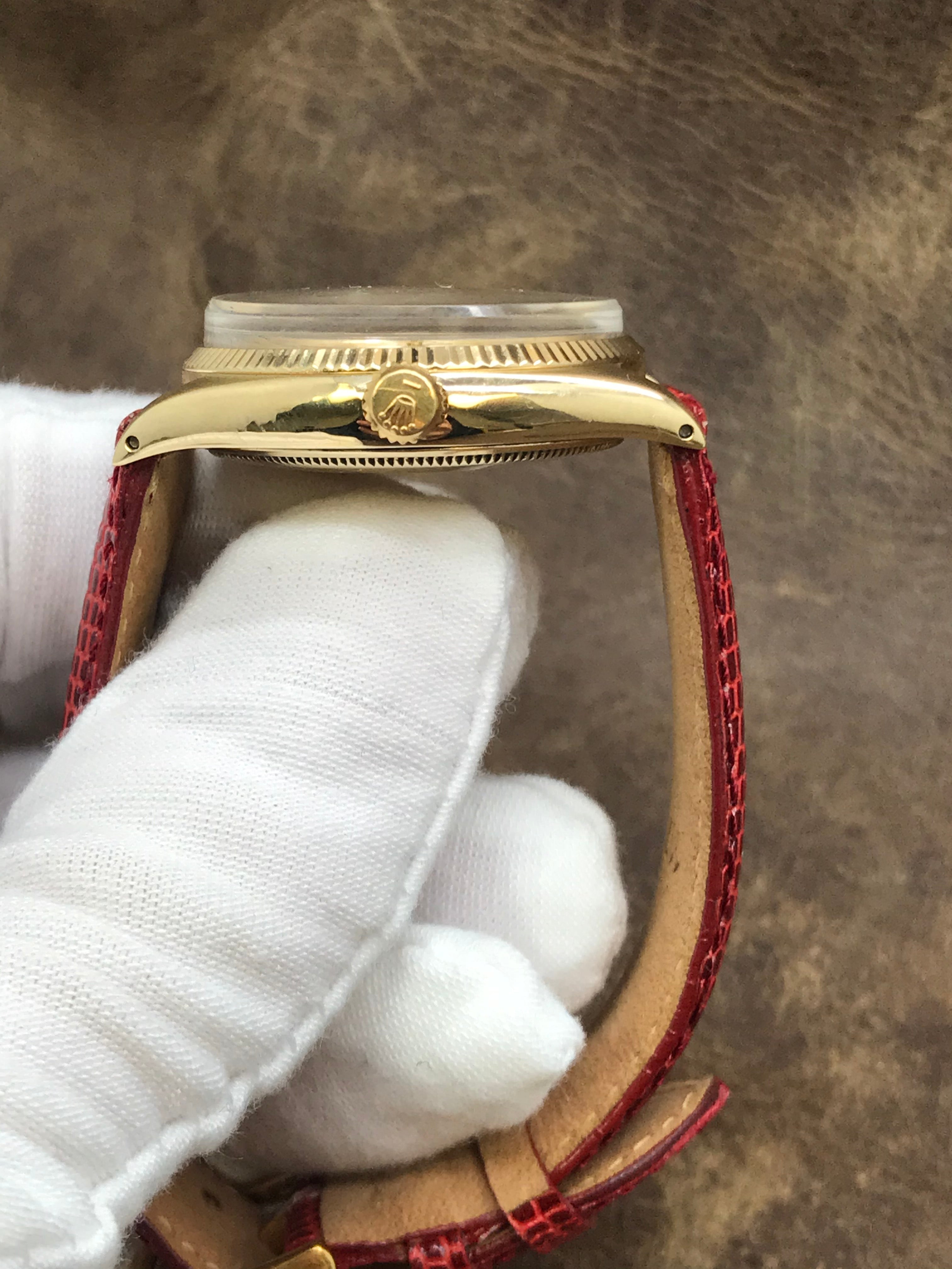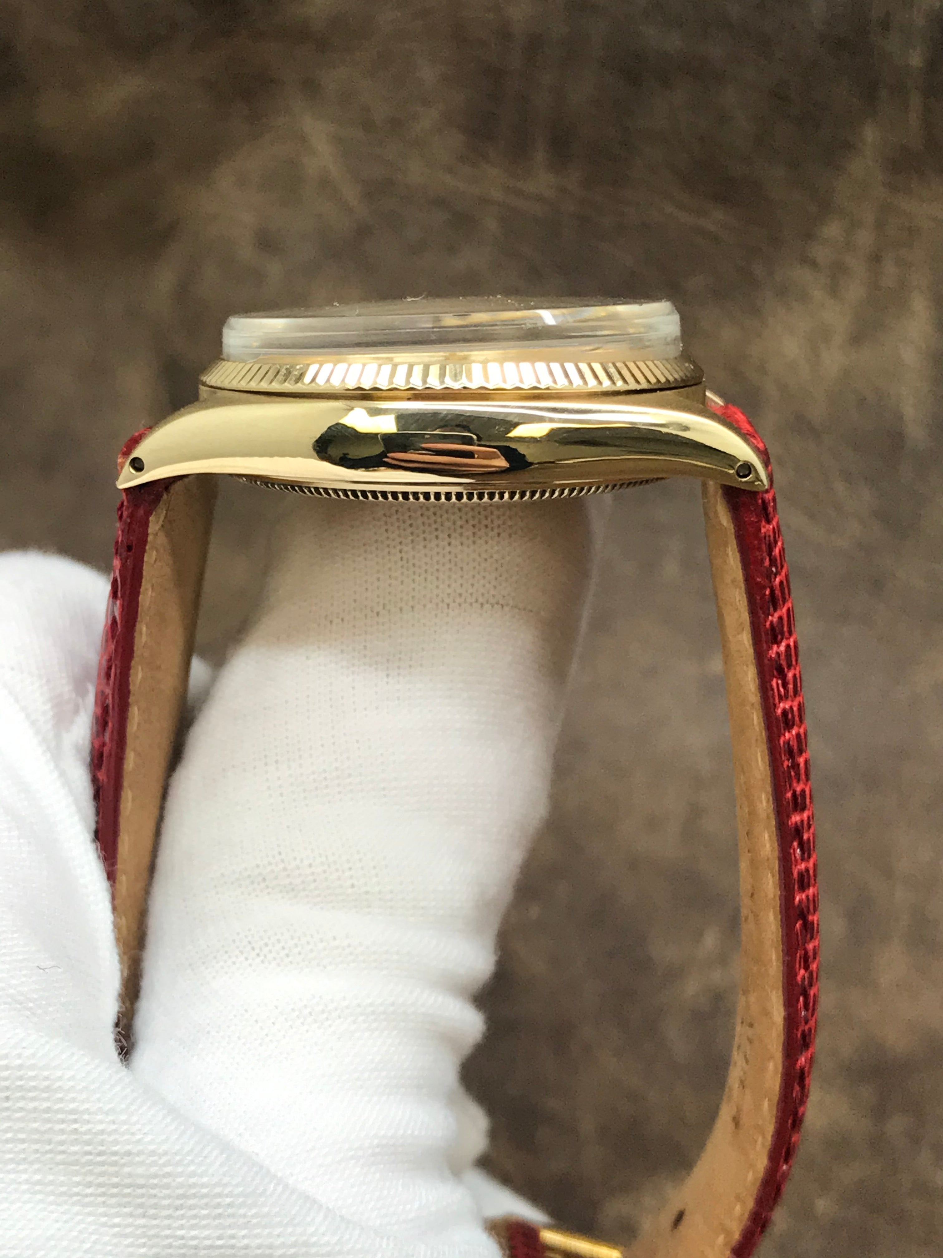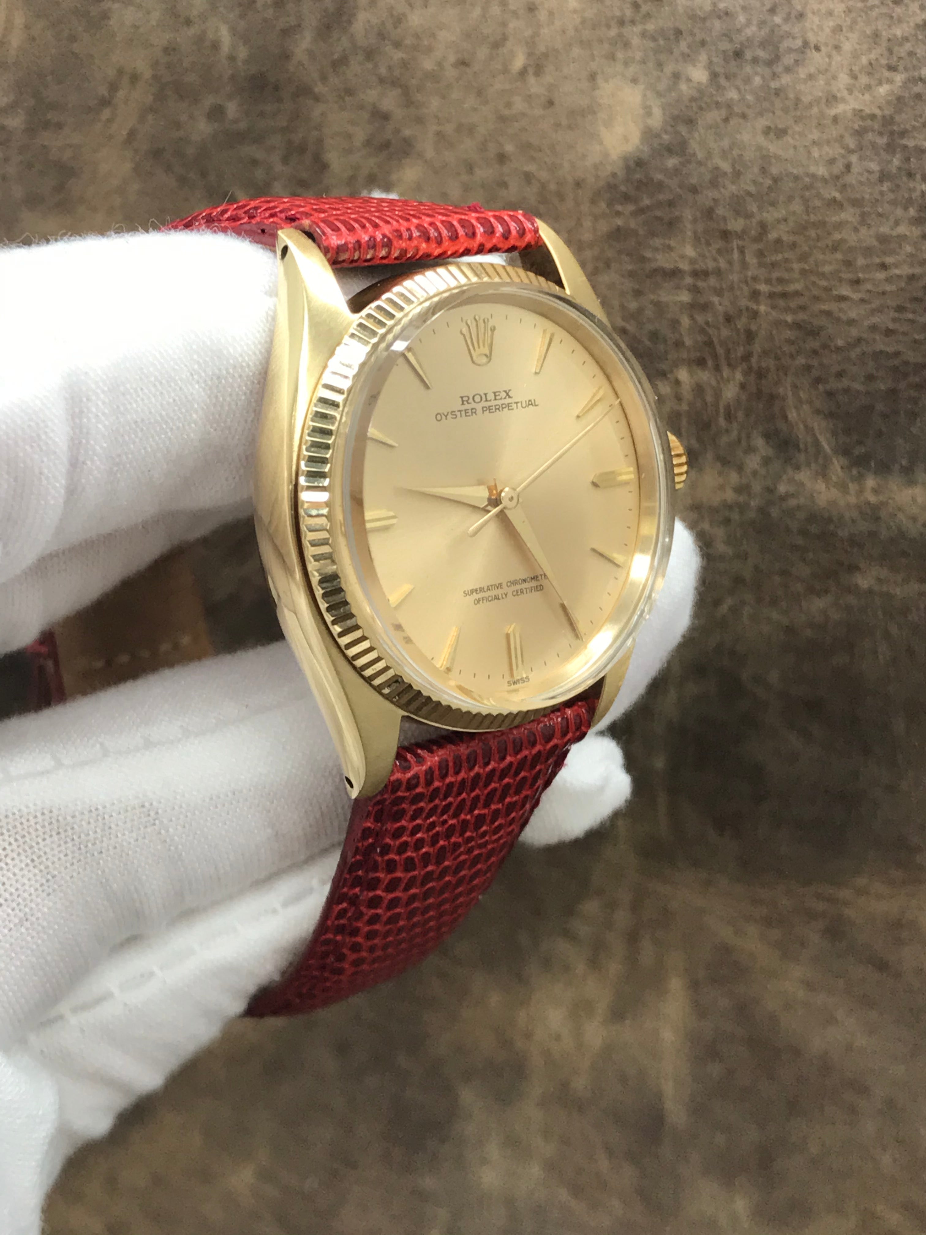 Solid 14k yellow gold case with a leather custom strap. Fixed fluted 14k yellow gold bezel. Champagne dial with gold tone hands and index hour markers. Dial type: analog. Rolex cal. 1570 automatic movement with about 48 hours of power reserve. Acrylic crystal. Screw-down crown. Solid case back. Case size: 34 mm. Case thickness: 11 mm. Round case shape. Band width: 19 mm. Custom tang clasp. Functions: hours, minutes, seconds. Rolex Oyster Perpetual 1005 Champagne Dial Automatic Watch.