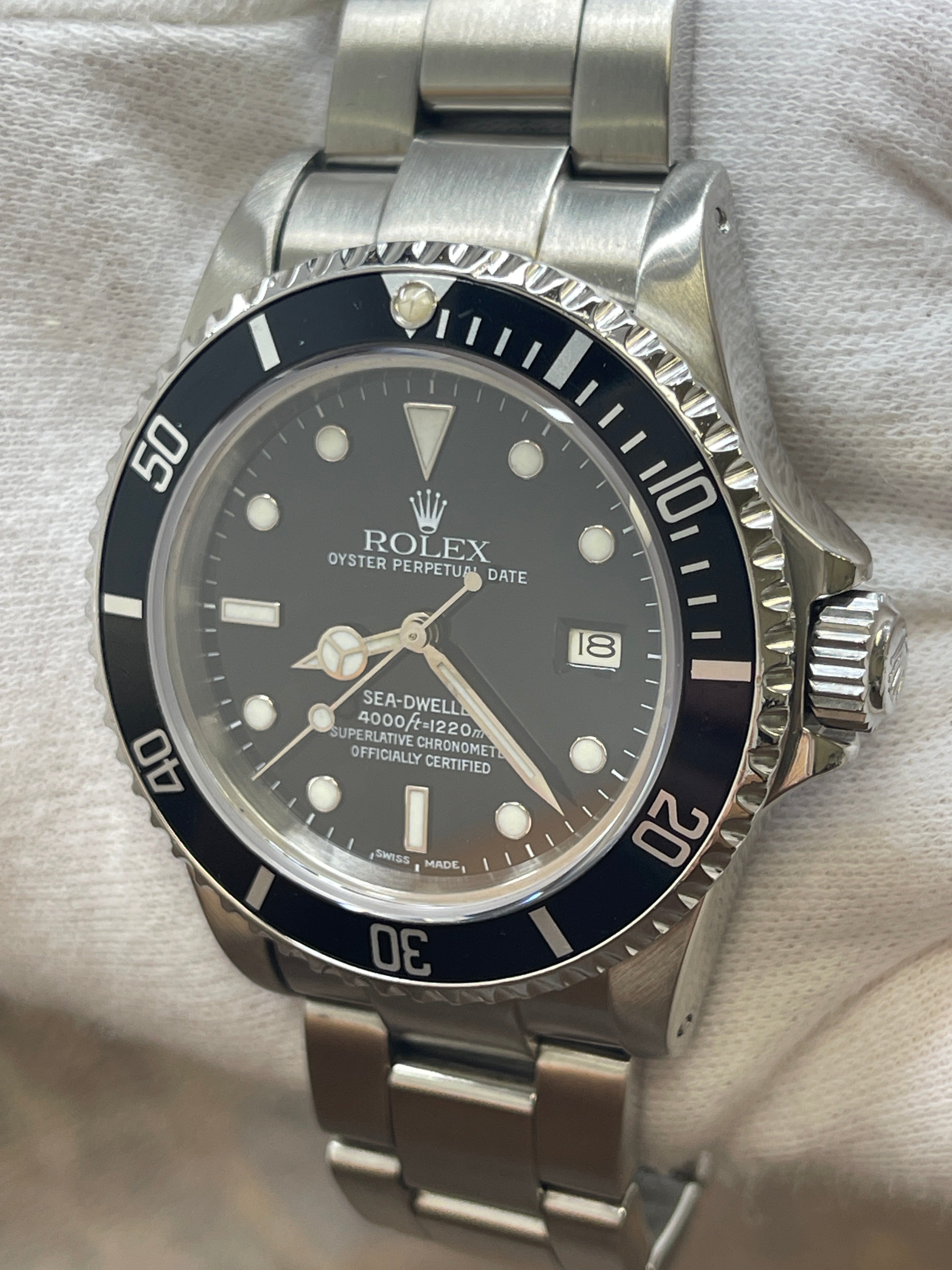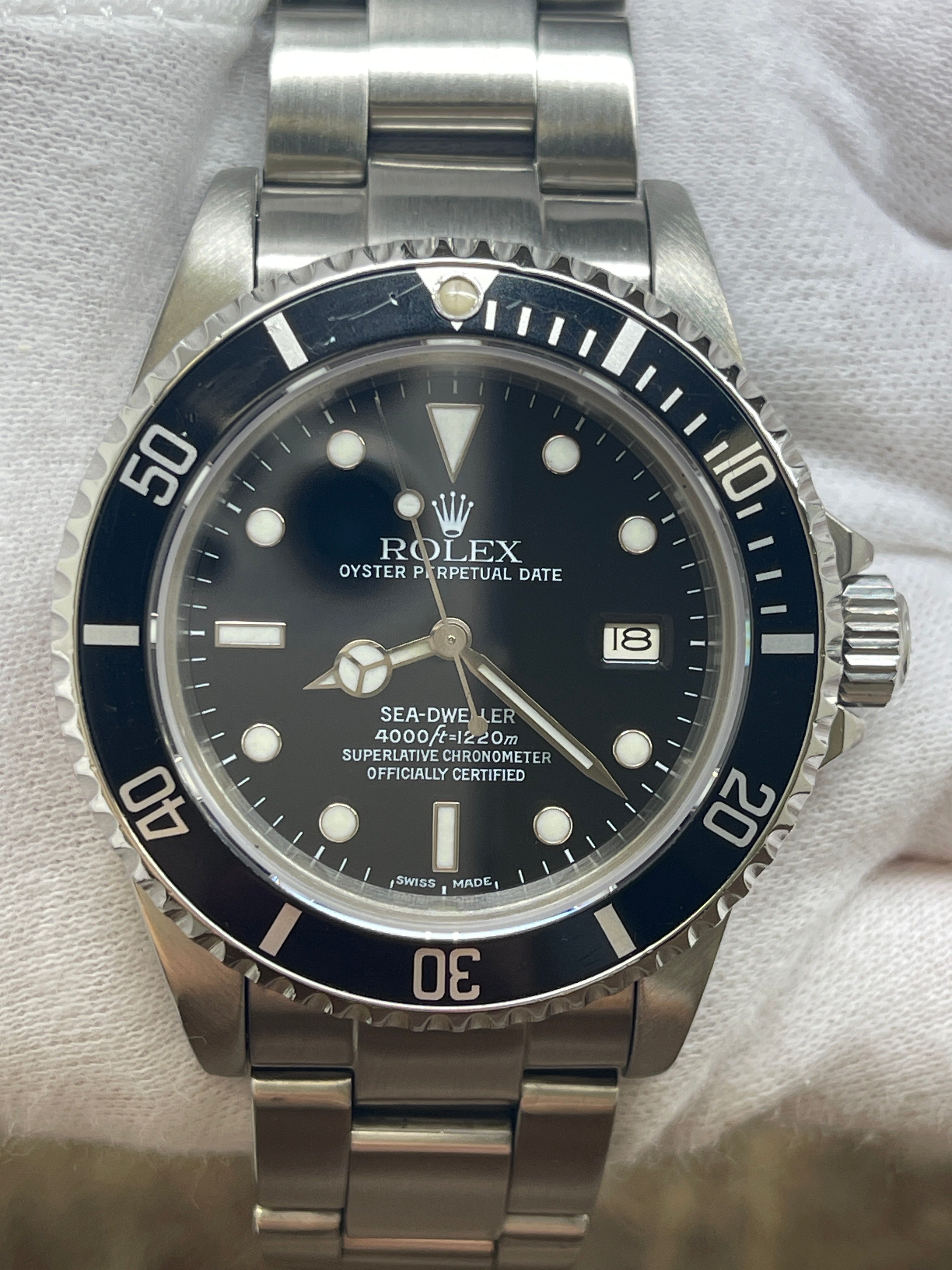 This pre-owned Rolex Sea-Dweller Triple Six 16660 is in very good condition and comes with: NO box or papers. the watch comes with a inchesSwiss Made inches SERVICE dial. The black insert on the bezel has several signs of wear mainly between 10-2 o'clock and the pear at 12 has a crack in it. The crown has some minor chips on the edges. Max wrist size: 7.25 in.