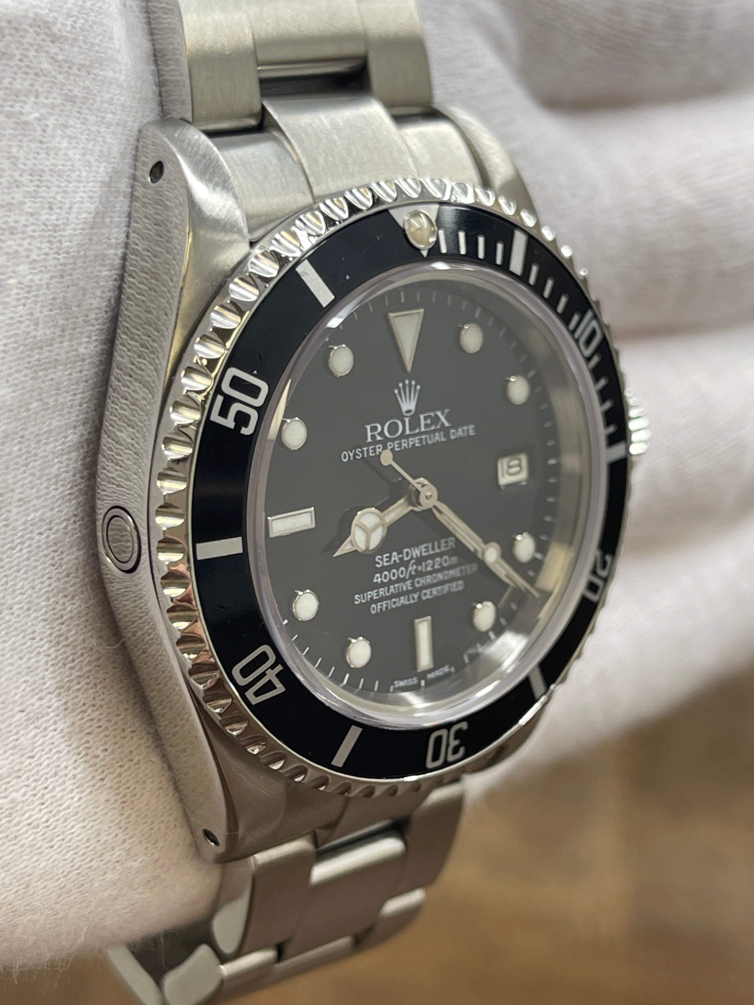 Stainless steel case with a stainless steel oyster bracelet. Uni-directional rotating stainless steel with a black aluminum ring bezel. Black dial with luminous silver-tone mercedes-logo, sword, and breguet-style shape hands and luminous dot hour markers. Dial type: analog. Cal. 3035 automatic movement with about 48 hours of power reserve. Scratch resistant sapphire crystal. Screw down crown. Solid case back. Case size: 40 mm. Case thickness: 15 mm. Round case shape. Band width: mm. Oysterlock clasp. Water resistant at 1220 meters / 4000 feet. Functions: hour, minute, seconds, date, chronometer. Rolex Sea-Dweller Triple Six 16660 Black Dial Automatic Men's Watch.