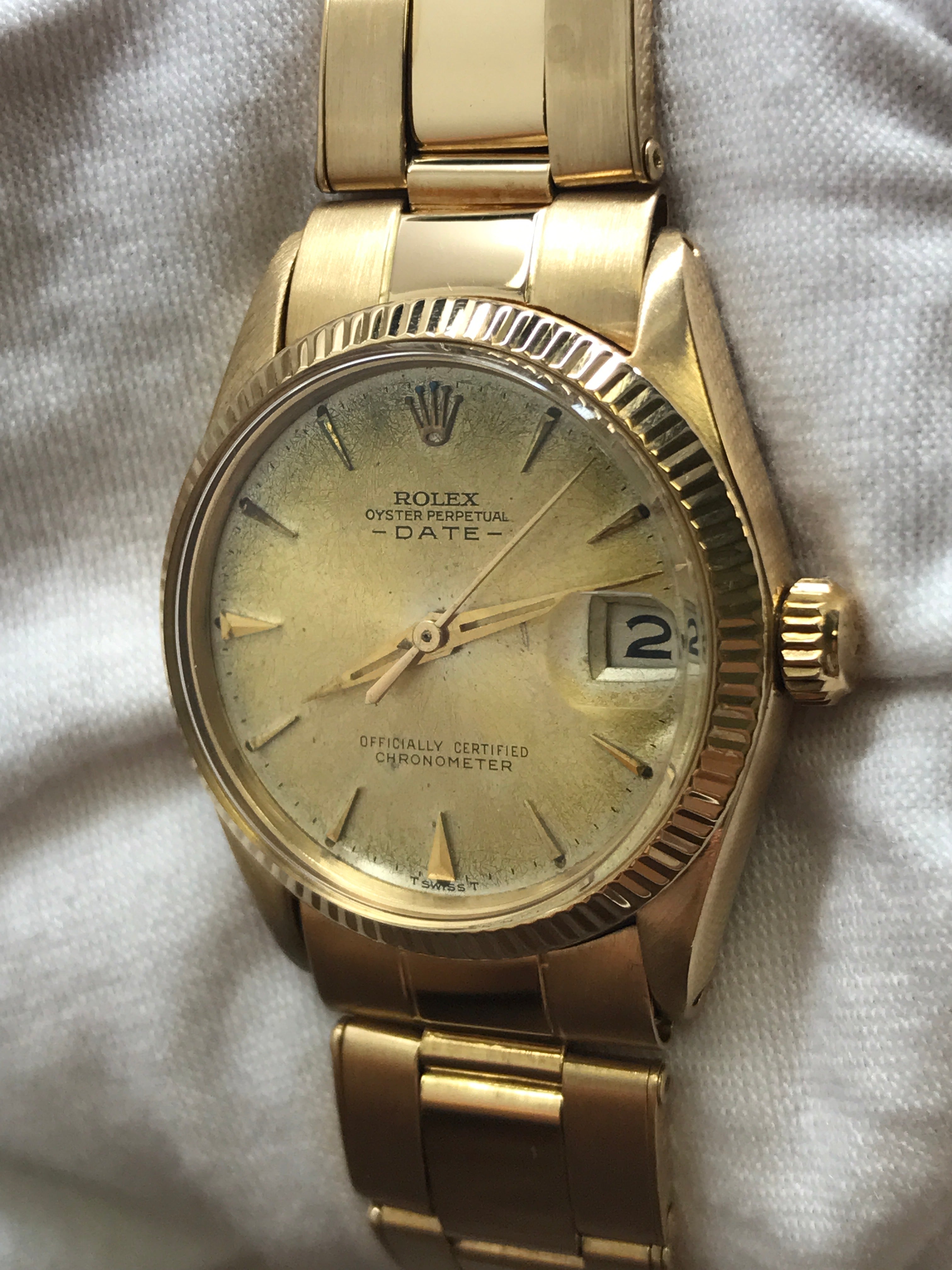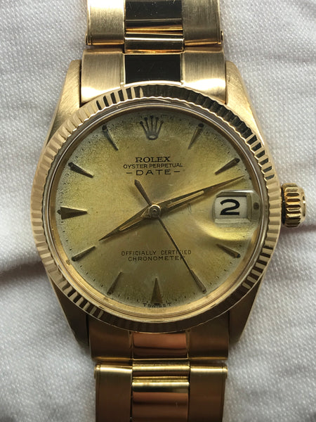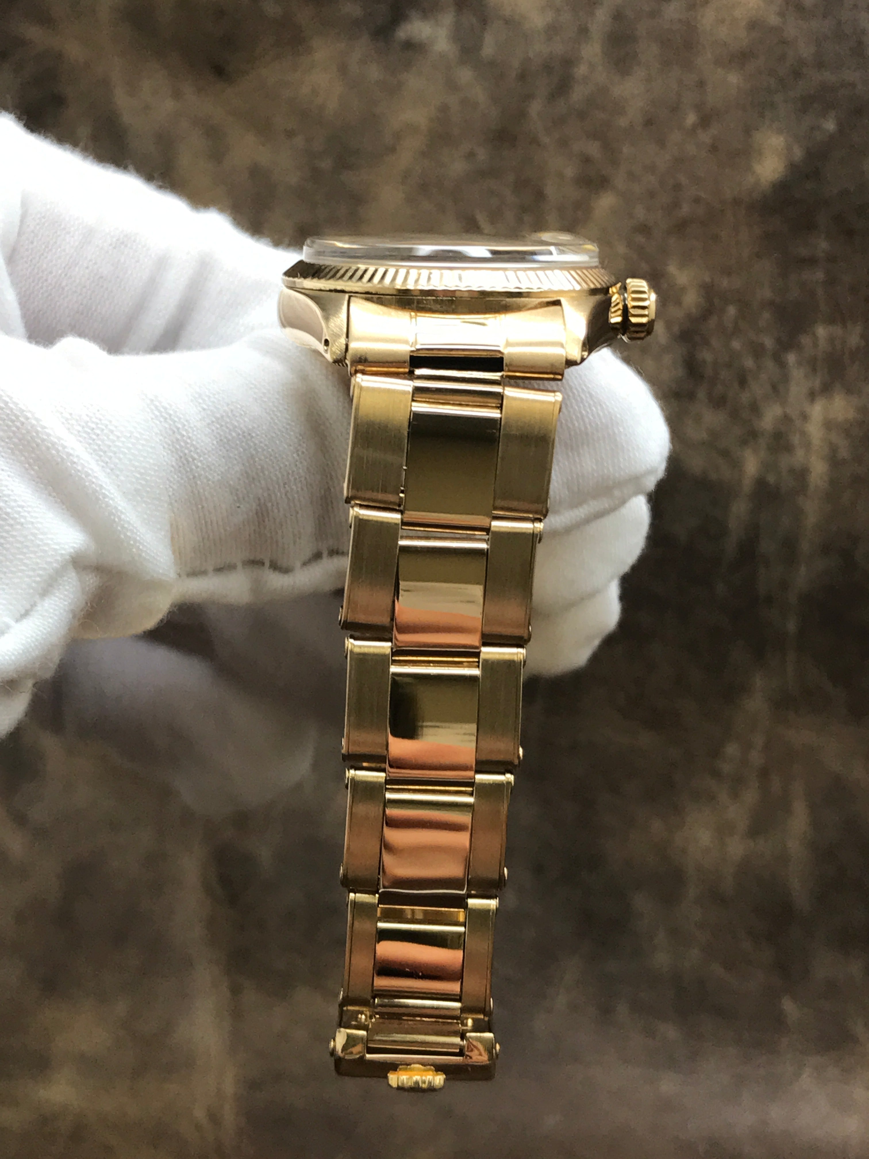 18k yellow gold case with a 18k yellow gold rivet stretchable bracelet. Fixed fluted 18k yellow gold bezel. Gold-tone dial with gold-tone hands and index hour markers. Dial type: analog. Automatic movement with about of power reserve. Scratch resistant sapphire crystal. Screw down crown. Solid case back. Case size: 31 mm. Case thickness: 11 mm. Round case shape. Band width: mm. Fold over clasp. Water resistant at not waterproof. Functions: hour, minute, seconds, date. Rolex Date 31mm 6627 Gold-tone Dial Automatic Watch.