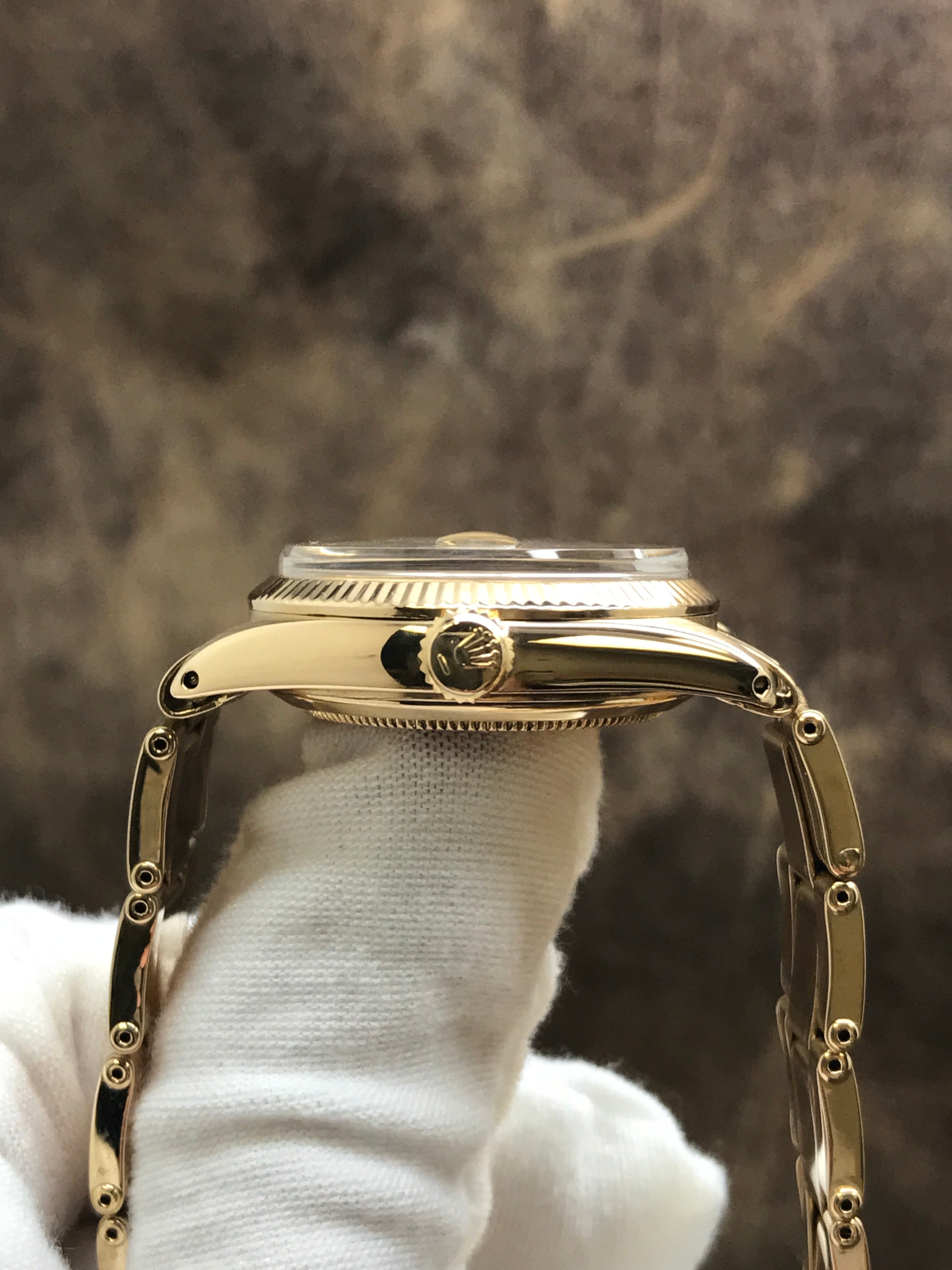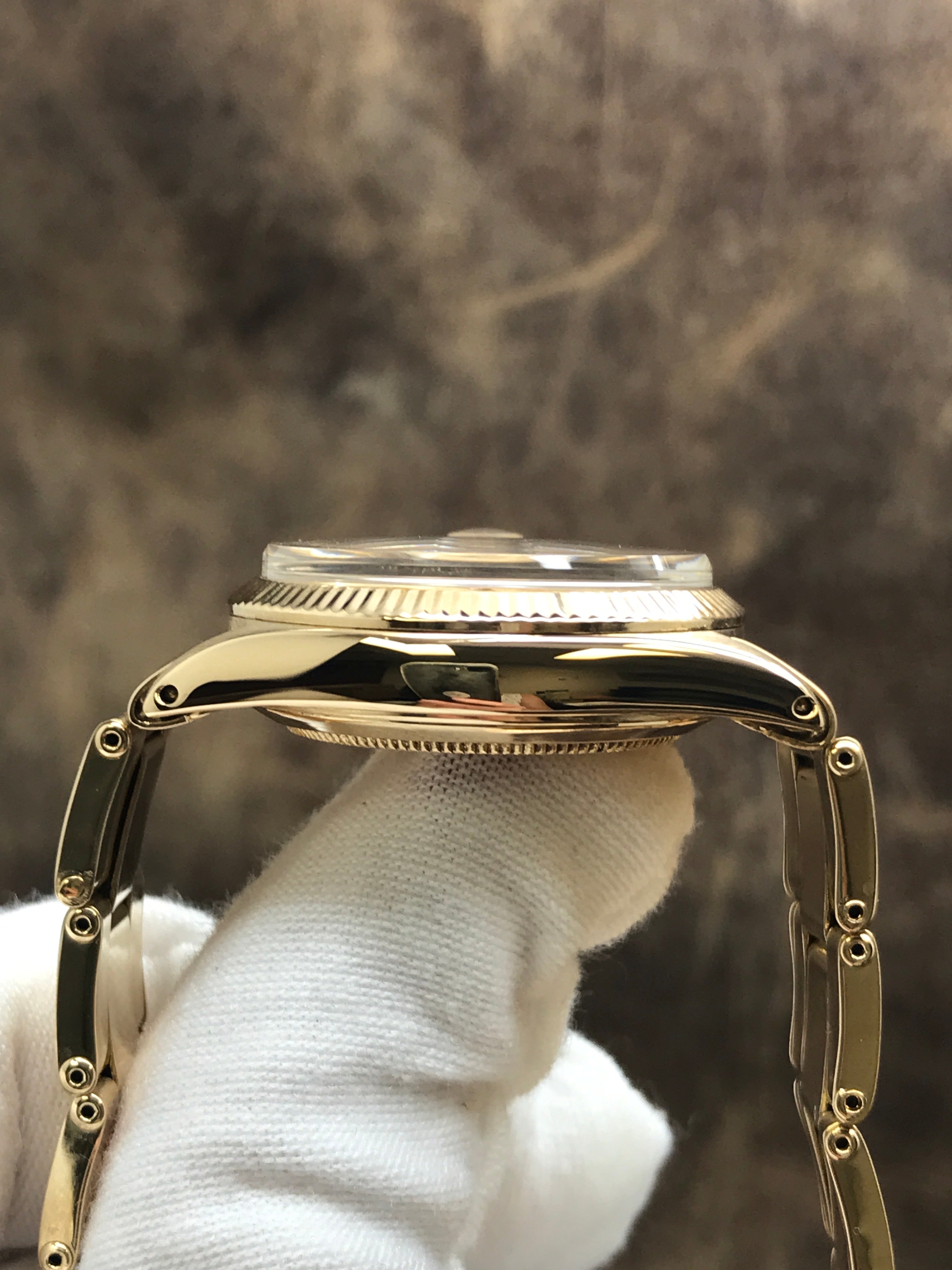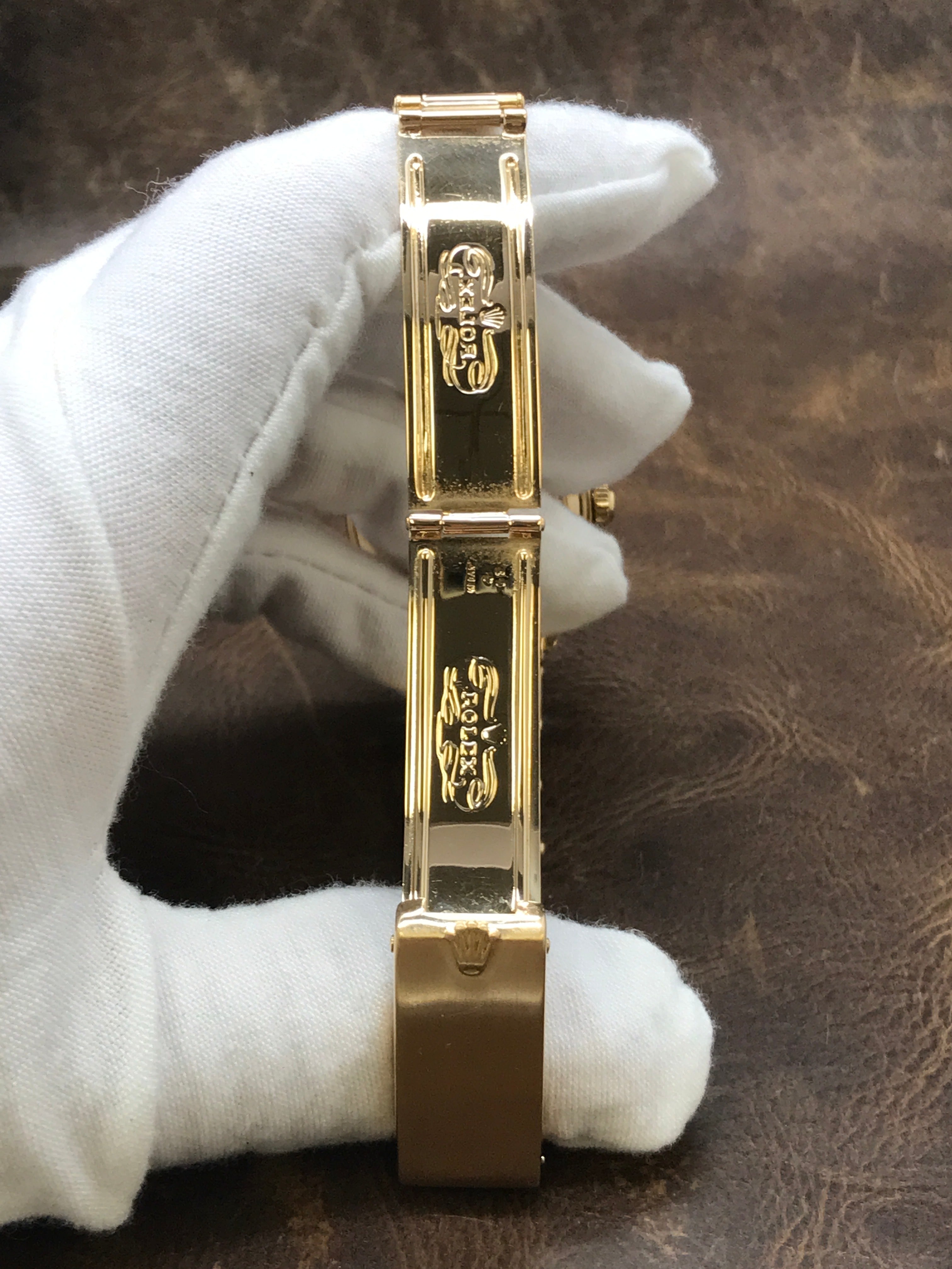 18k yellow gold case with a 18k yellow gold rivet stretchable bracelet. Fixed fluted 18k yellow gold bezel. Gold-tone dial with gold-tone hands and index hour markers. Dial type: analog. Automatic movement with about of power reserve. Scratch resistant sapphire crystal. Screw down crown. Solid case back. Case size: 31 mm. Case thickness: 11 mm. Round case shape. Band width: mm. Fold over clasp. Water resistant at not waterproof. Functions: hour, minute, seconds, date. Rolex Date 31mm 6627 Gold-tone Dial Automatic Watch.