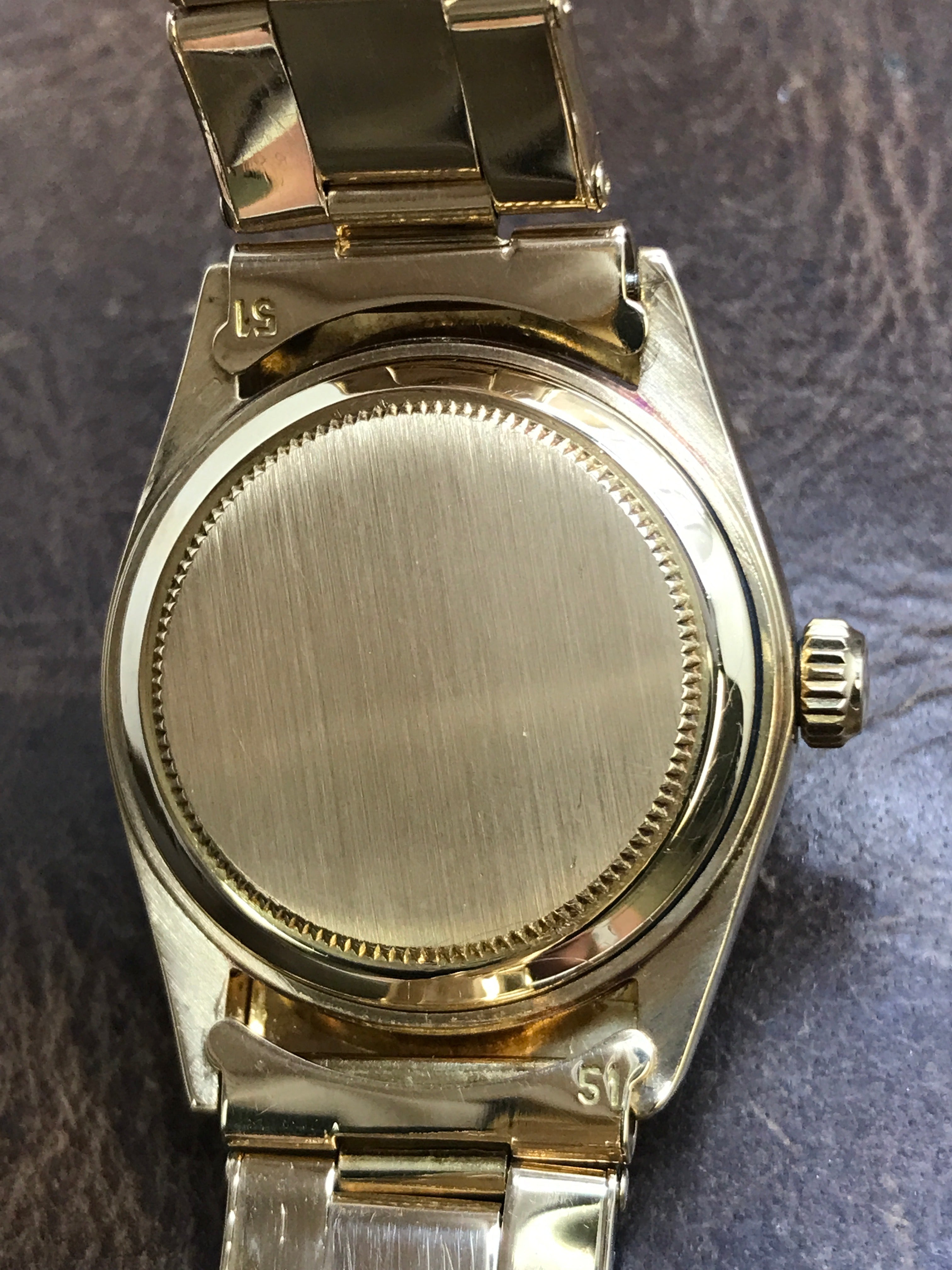 This pre-owned Rolex Date 31mm 6627 is in excellent condition and comes with: original Rolex box and papers. The dial is faded and has some marks. Comes on a stretchable rivet bracelet. Max wrist size: 7 in.
