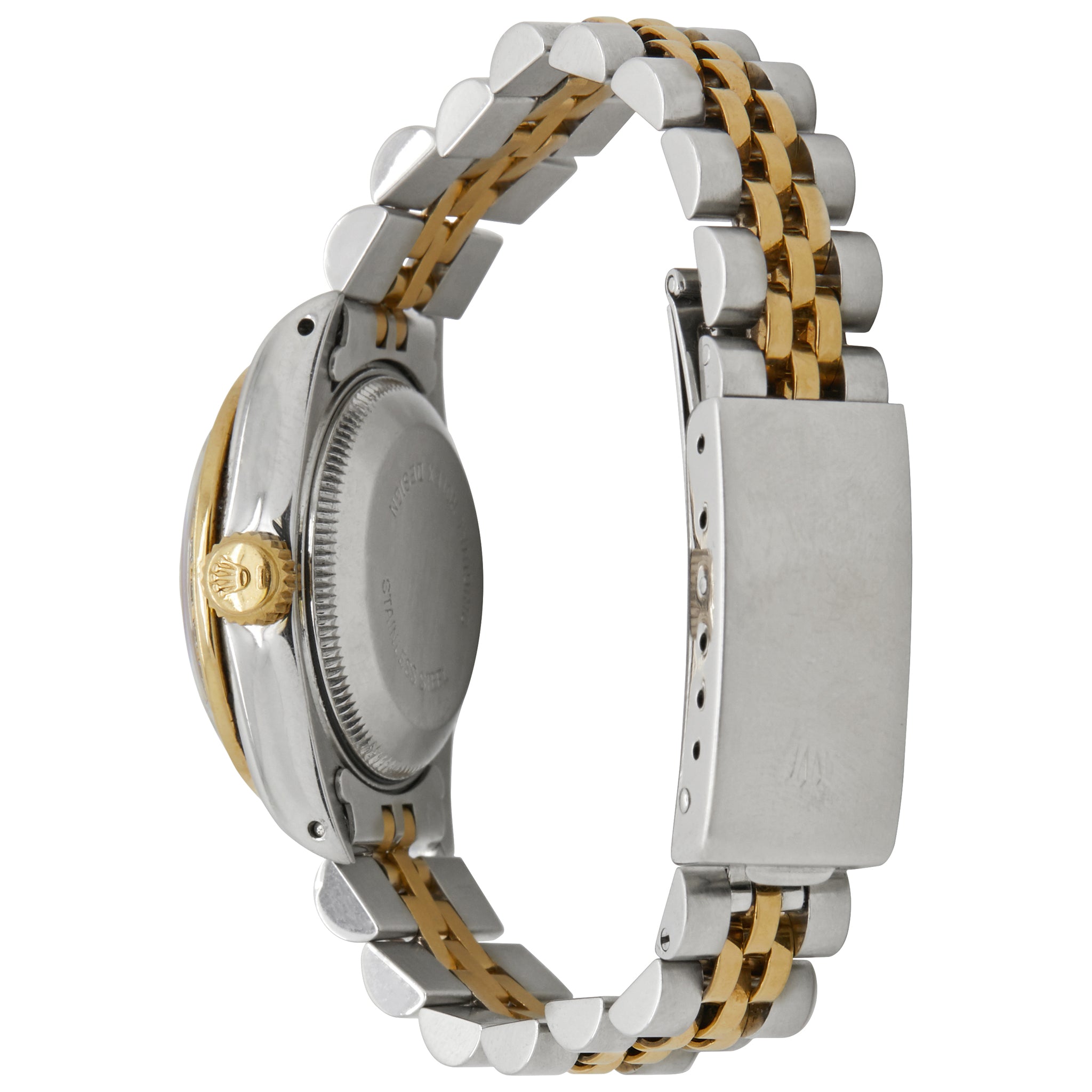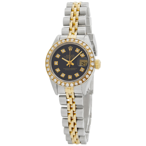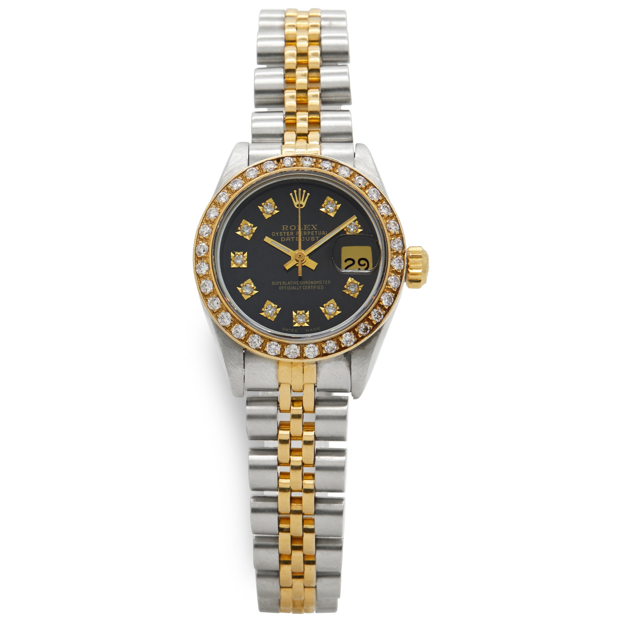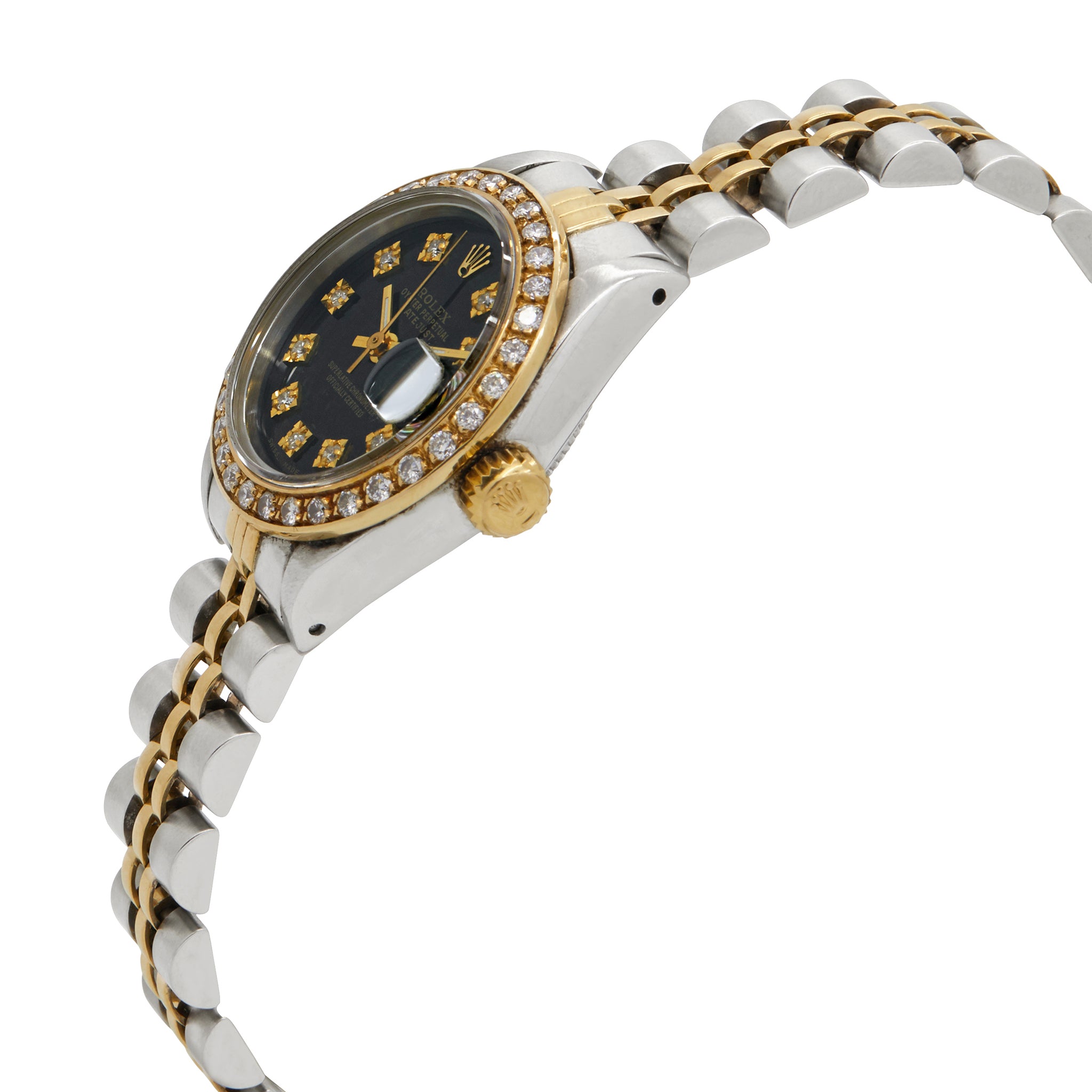Stainless steel case with a stainless steel jubilee bracelet. Fixed gold with custom added diamonds bezel. Black dial with gold-tone hands and custom added diamonds hour markers. Dial type: analog. Luminescent hands and markers. Rolex calibre 2135 automatic movement with about 42 hours of power reserve. Scratch resistant sapphire crystal. Screw down crown. Solid case back. Case size: 26 mm. Case thickness: 11.5 mm. Round case shape. Band width: mm. Deployment clasp. Water resistant at 100 meters / 330 feet. Functions: hours, minutes, seconds, date. Rolex Datejust 26mm 69173 Black Dial Automatic Women's Watch.