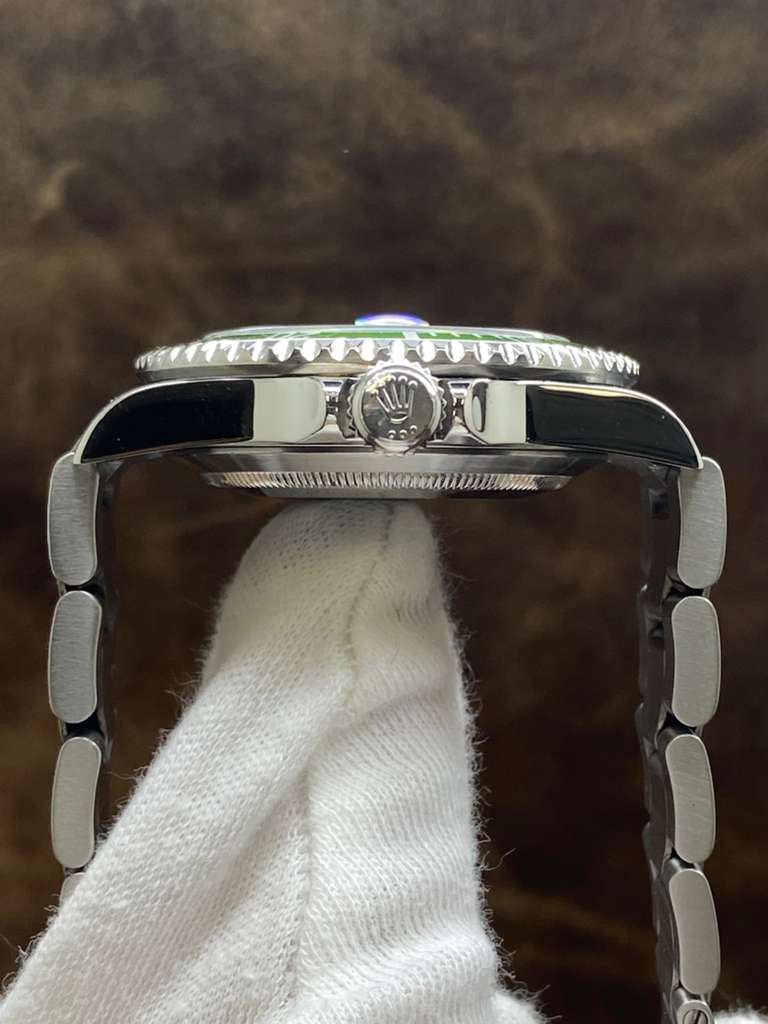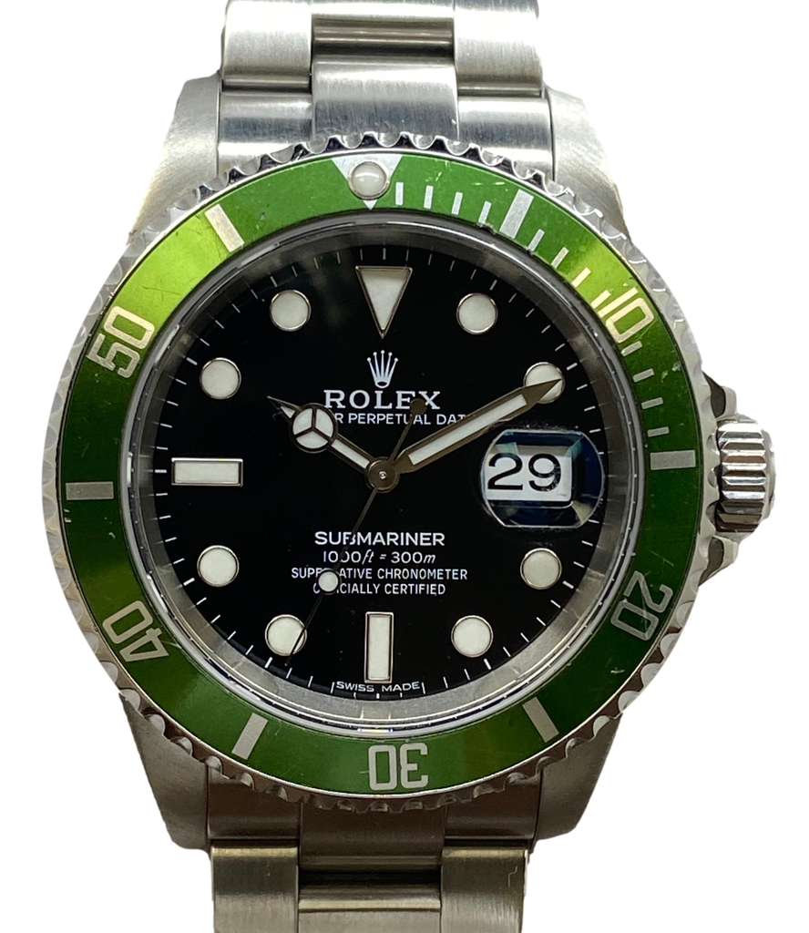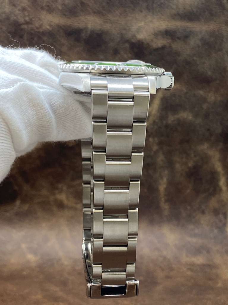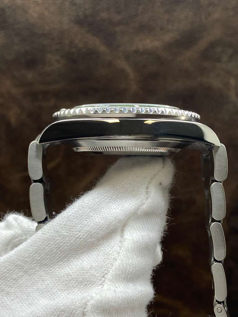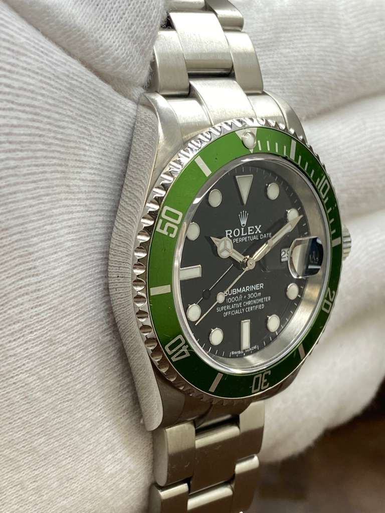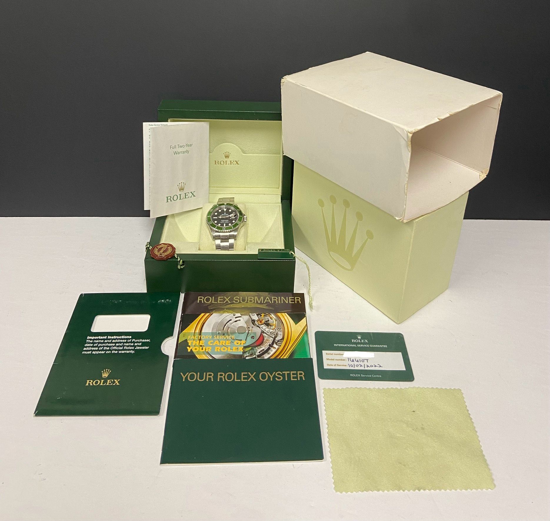 This pre-owned Rolex Submariner 50th Anniversary 116610V is in excellent condition and comes with: original Rolex double box, tags, booklet, service card dated 2022 and matching warranty papers dated 2006. The green insert has several signs of wear - most significant are visible between 12-4 o'clock. Max wrist size: 8.25 in.