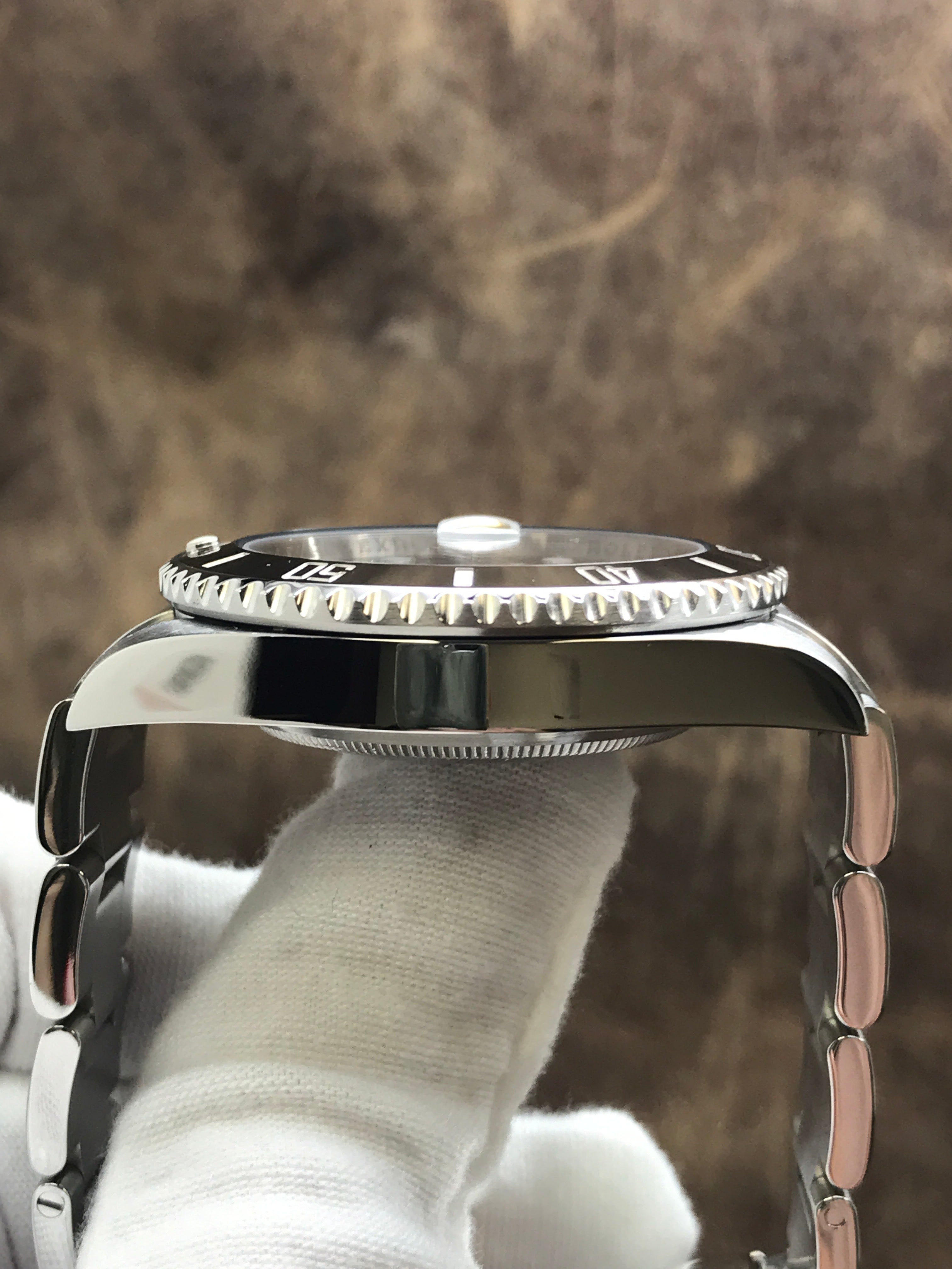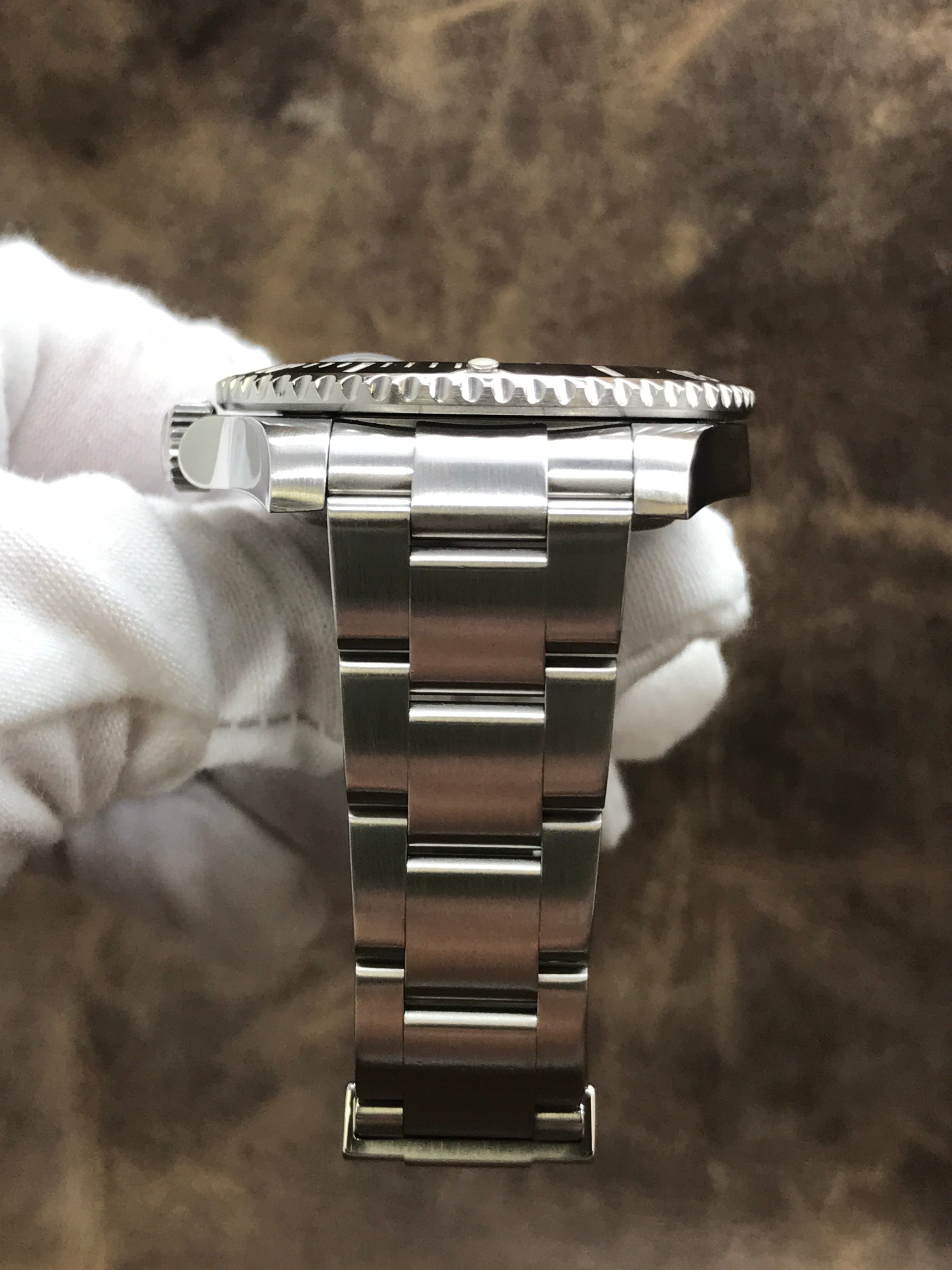 - Bezel Material stainless steel bezel with a black ceramic top ring