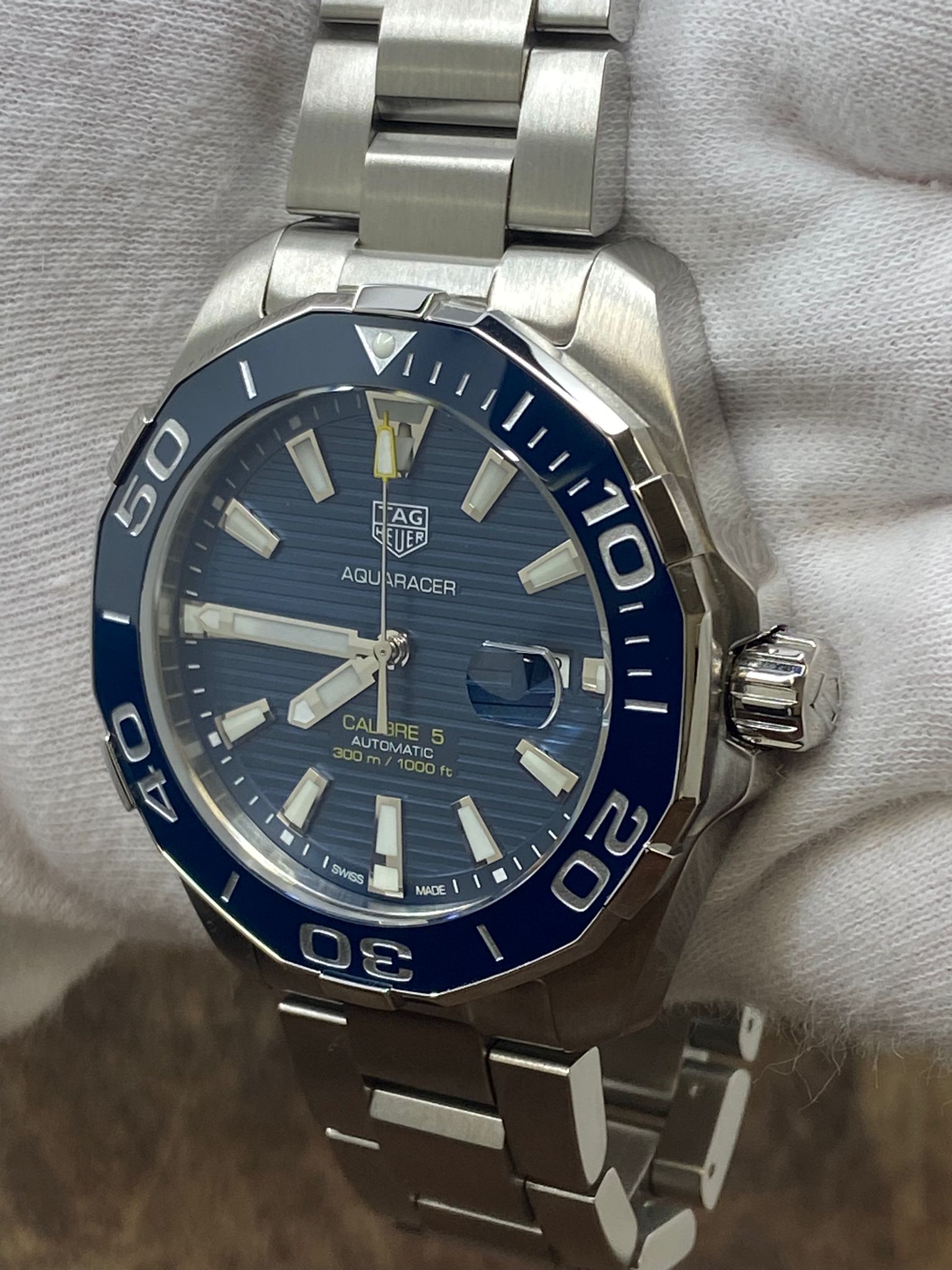 Stainless steel case with a stainless steel bracelet. Uni-directional rotating stainless steel with a blue ceramic (count-up elapsed time) top ring bezel. Blue dial with luminous silver-tone hands and index hour markers. Dial type: analog. TAG Heuer caliber 5 automatic movement with about 38 hours of power reserve. Scratch resistant sapphire crystal. Screw down crown. Solid case back. Case size: 43 mm. Case thickness: 12 mm. Round case shape. Band width: mm. Fold over with push button release clasp. Water resistant at 300 meters / 1000 feet. Functions: hours, minutes, seconds, date. TAG Heuer Aquaracer WAY201B.BA0927 Blue Dial Automatic Men's Watch.