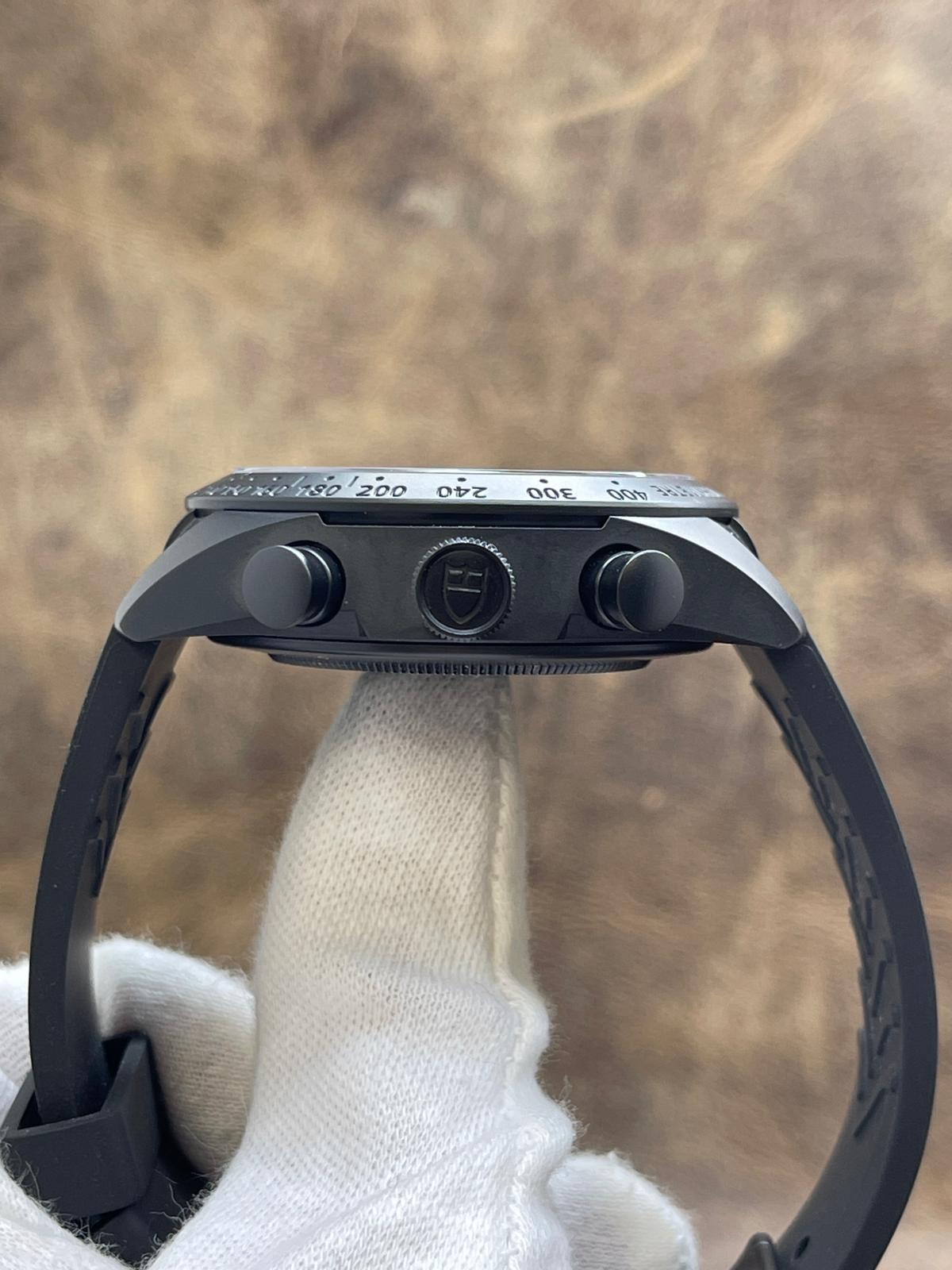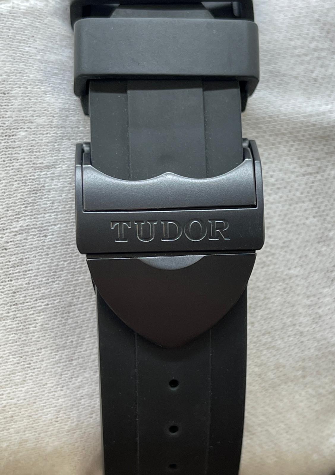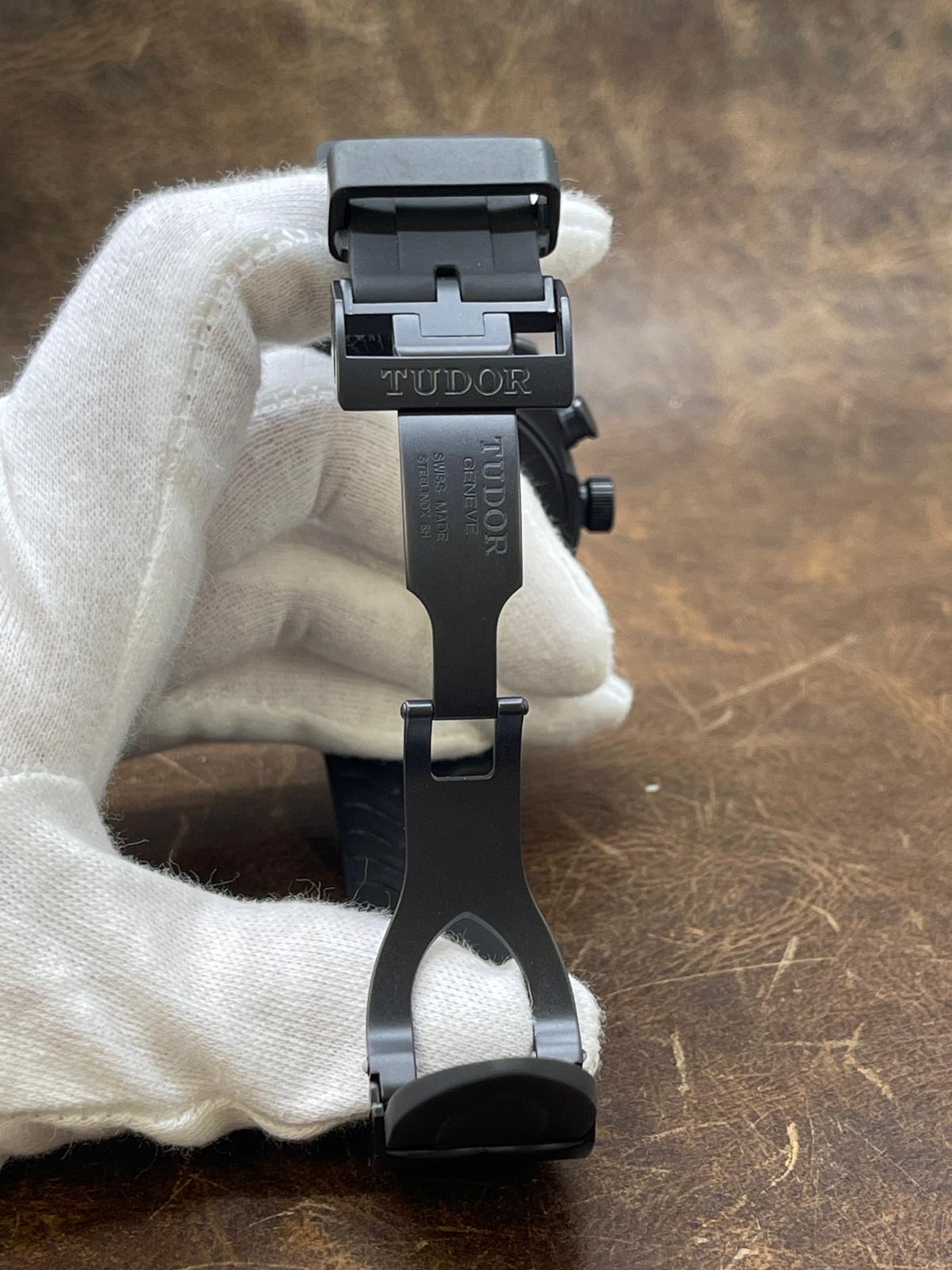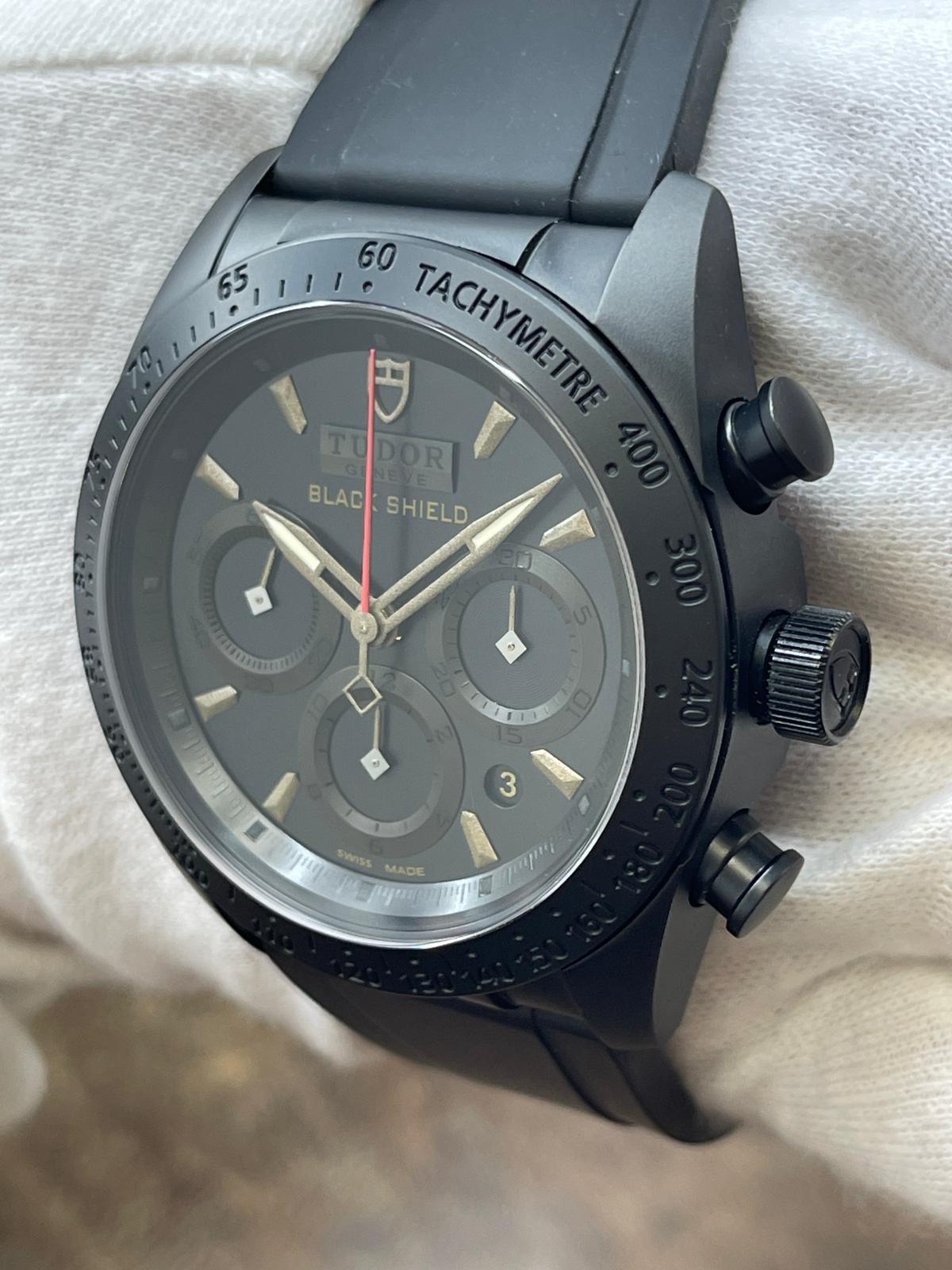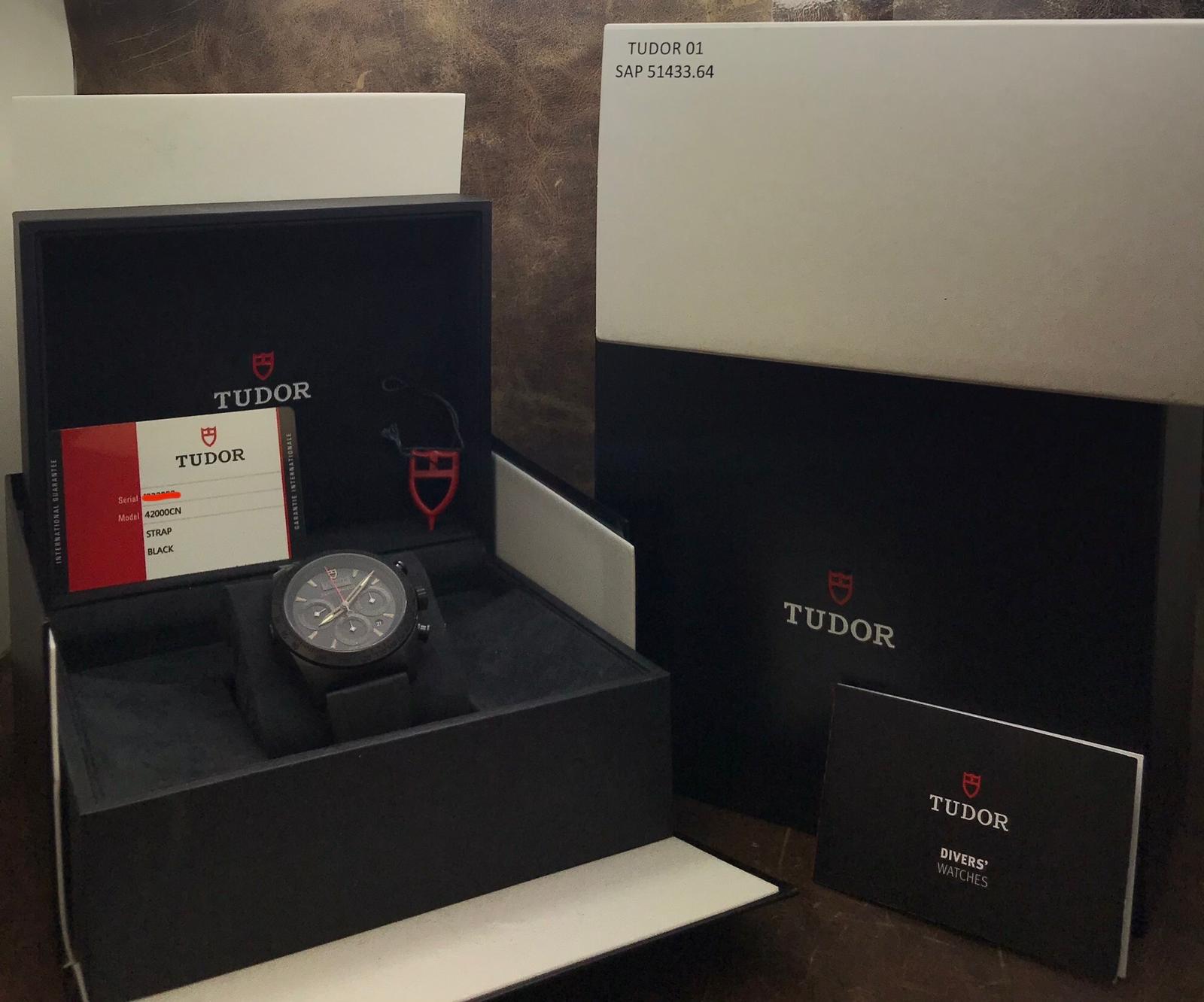 This pre-owned Tudor Fastrider Black Shield Chronograph 42000CN is in excellent condition and comes with: original Tudor double box, booklet and matching warranty card dated 2021. The watch has a few tiny hairlines on the bezel and case sides. Max wrist size: 7.25 in.