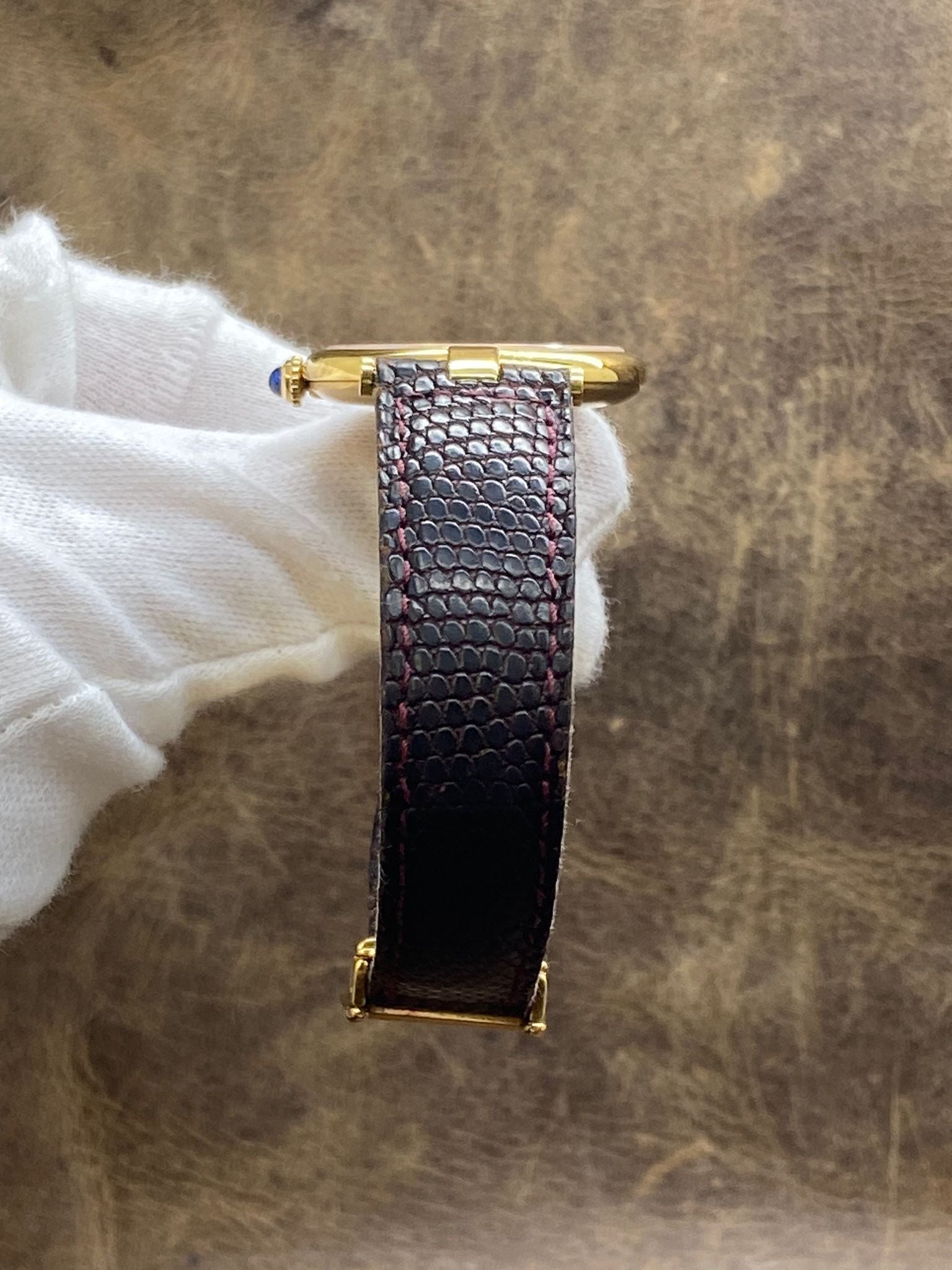 Gold vermeil over sterling silver case with a leather strap. Fixed gold plated 925 silver bezel. White & gold dial with black hands and index & 6, 12 Roman numeral hour markers. Dial type: analog. Quartz movement with about of power reserve. Sapphire crystal. Blue cabochon crown. Solid case back. Case size: 30 mm. Case thickness: 6 mm. Round case shape. Band width: mm. Fold over clasp. Water resistant at not waterproof. Functions: hour, minute. Cartier Must de Cartier Vermeil 590003 White & Gold Dial Quartz Women's Watch.
