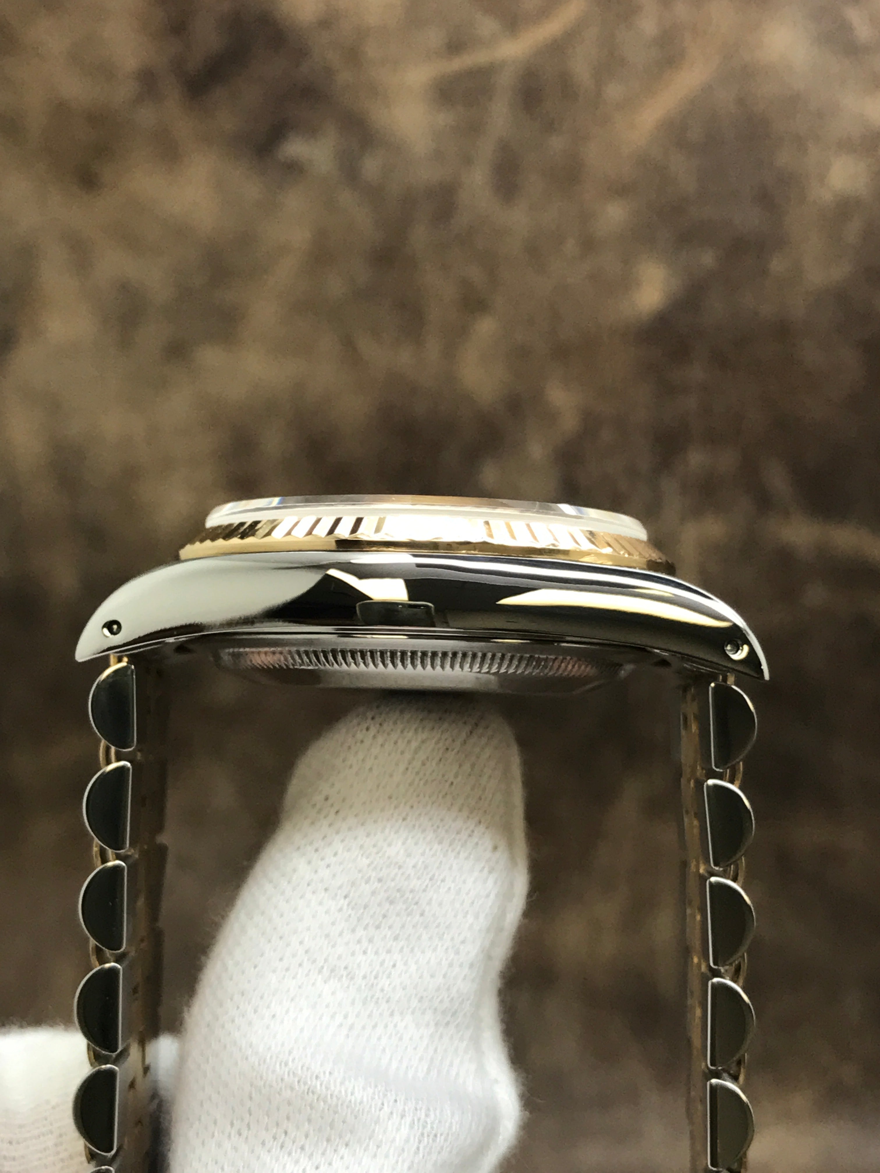 Stainless steel case with a stainless steel & 18k yellow gold jubilee bracelet. Fixed 18k yellow gold bezel. Champagne dial with luminous gold-tone hands and index hour markers. Dial type: analog. Luminescent hands and markers. Rolex calibre 3135 automatic movement with about 48 hours of power reserve. Synthetic sapphire crystal. Screw down crown. Solid case back. Case size: 36 mm. Case thickness: 12 mm. Round case shape. Band width: mm. Fold over w/ safety release clasp. Water resistant at 100 meters / 330 feet. Functions: date, hour, minute, second. Rolex Datejust 36mm 16233 Champagne Dial Automatic Watch.
