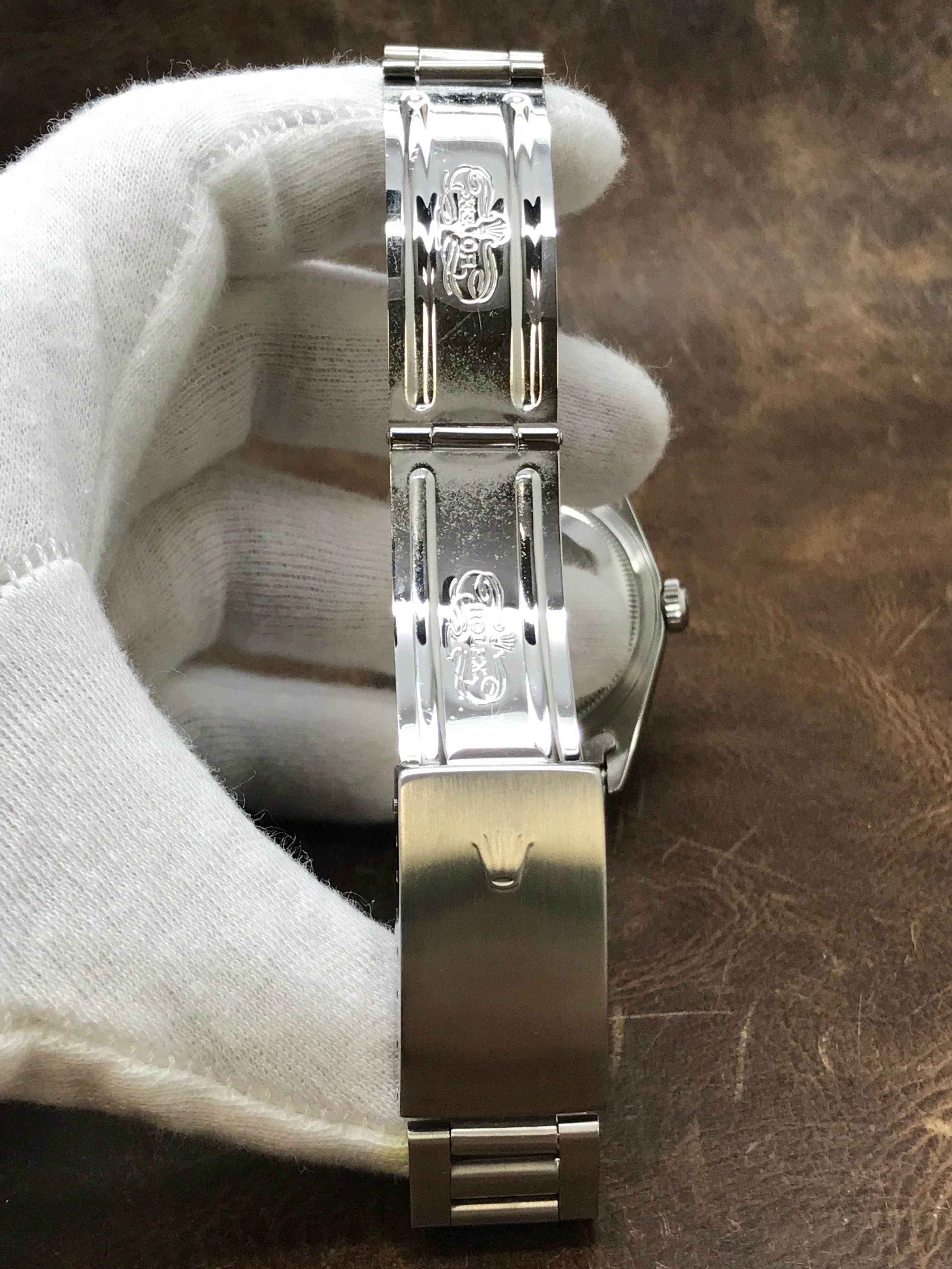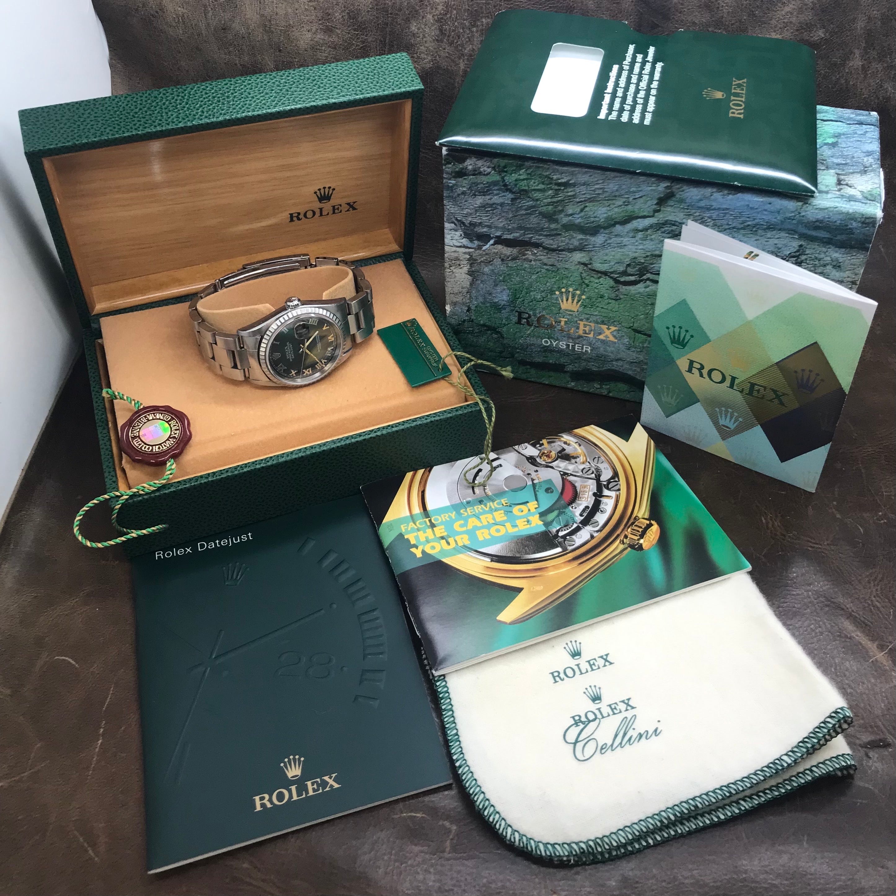 This pre-owned Rolex Datejust 36mm 16220 is in mint condition and comes with: original Rolex double box, tags, booklets and matching warranty papers. Max wrist size: 7 in.