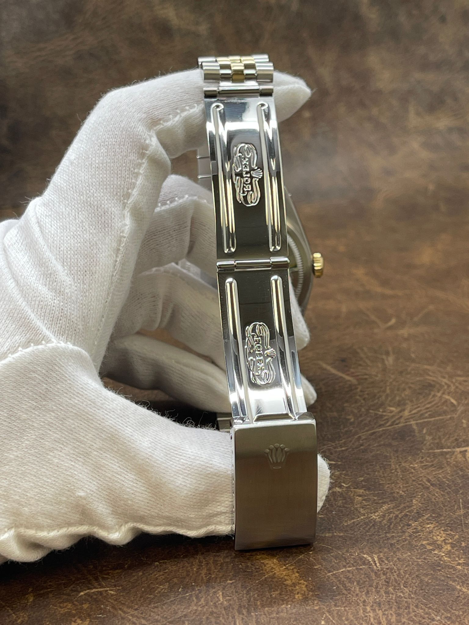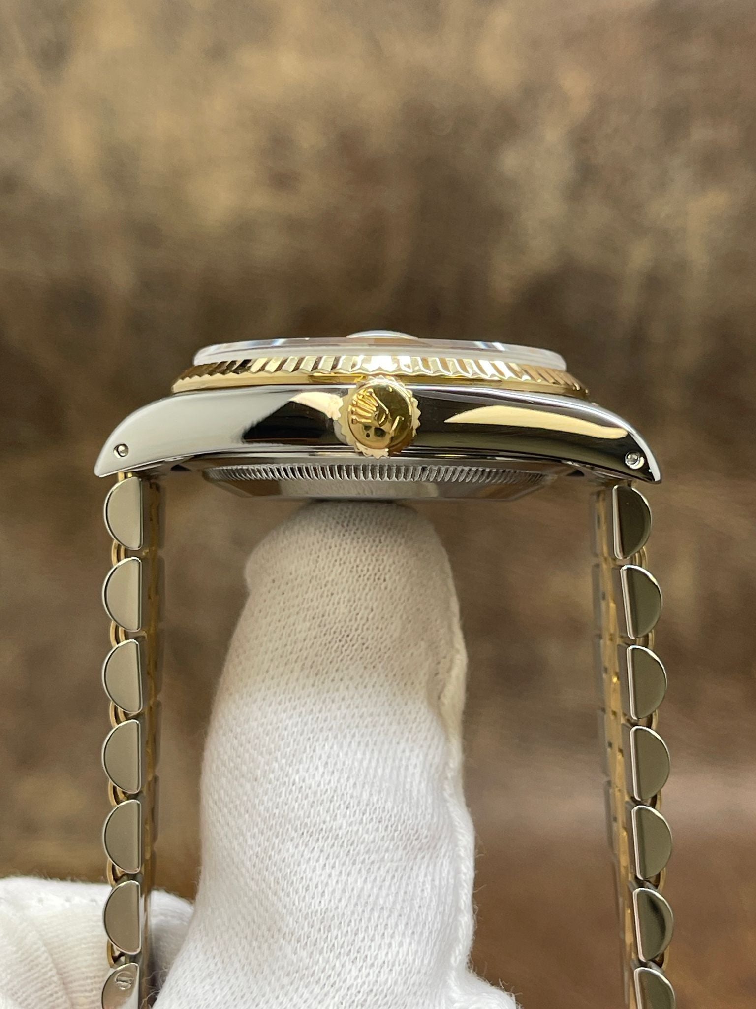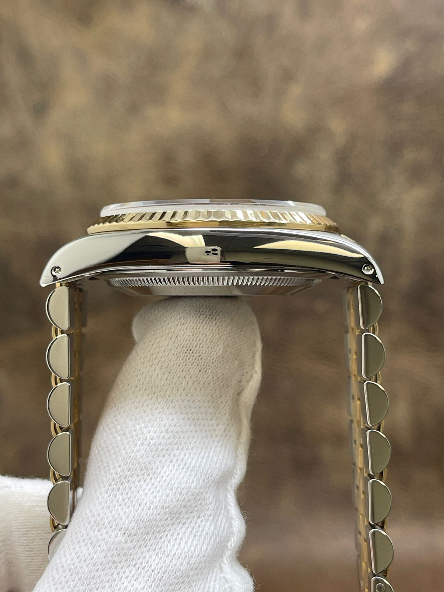 Stainless steel case with a stainless steel & 18k yellow gold jubilee bracelet. Fixed fluted 18k yellow gold bezel. Champagne linen dial with gold tone & luminous hands and index hour markers. Dial type: analog. Luminescent hands and markers. Rolex calibre 3135 automatic movement with about 48 hours of power reserve. Sapphire crystal. Screw down crown. Solid case back. Case size: 36 mm. Case thickness: 12 mm. Round case shape. Band width: mm. Oyster fliplock clasp. Water resistant at 100 meters / 330 feet. Functions: date, hour, minute, second. Rolex Datejust 36mm 16233 Champagne Linen Dial Automatic Watch.